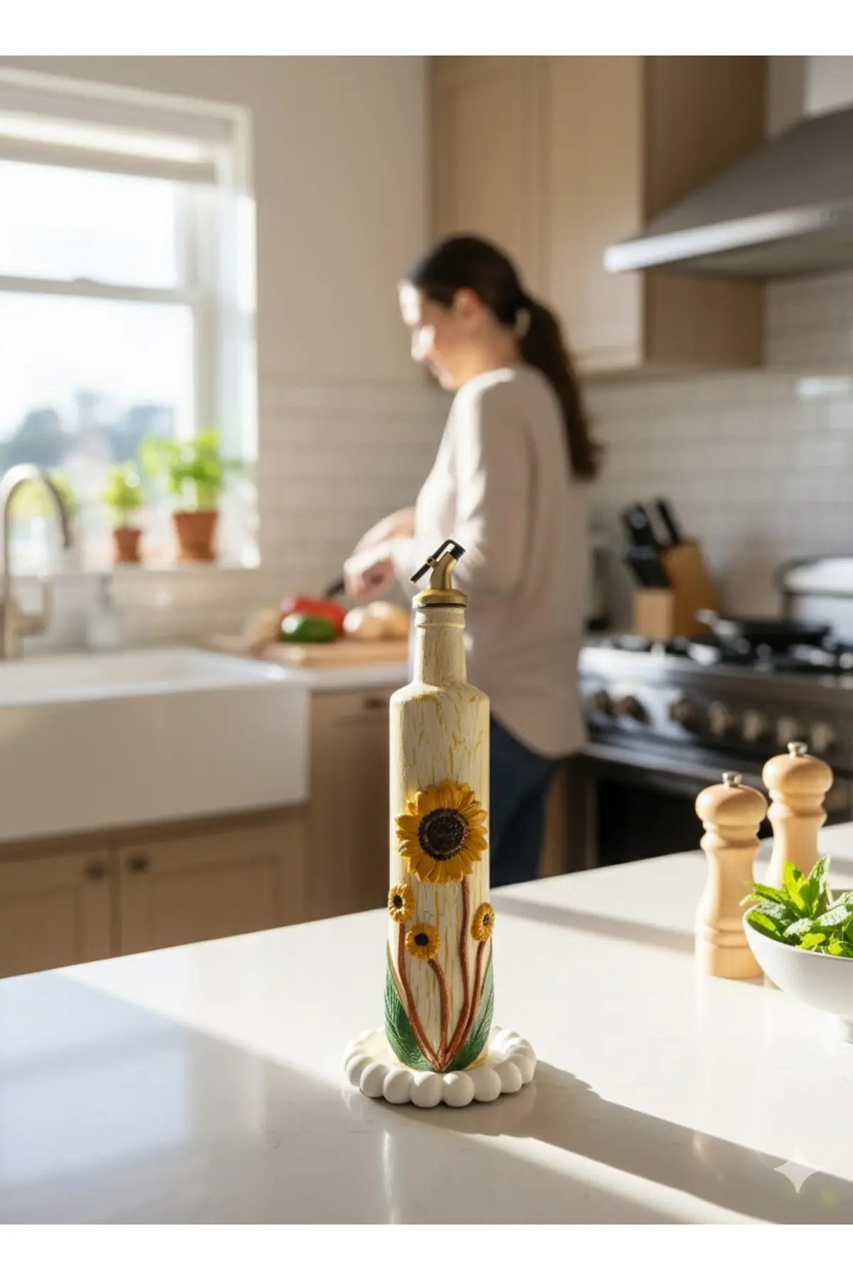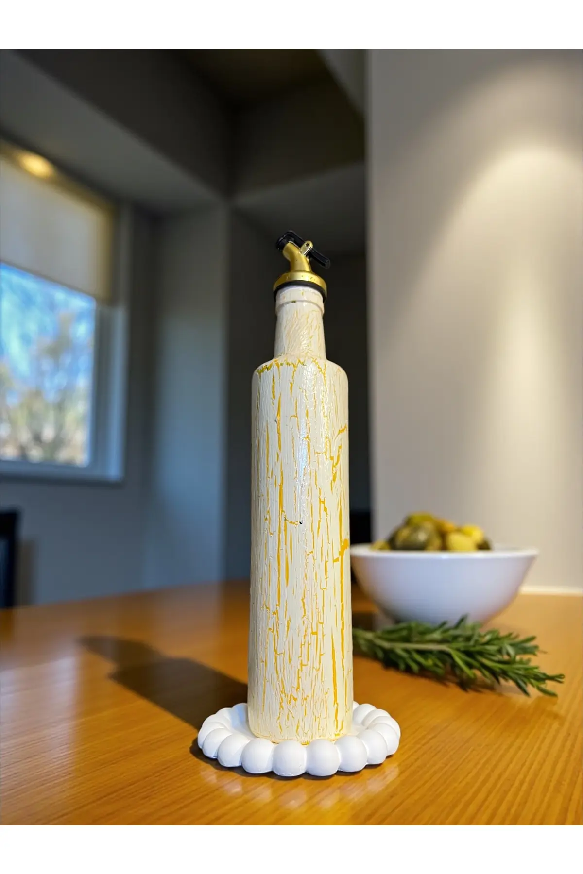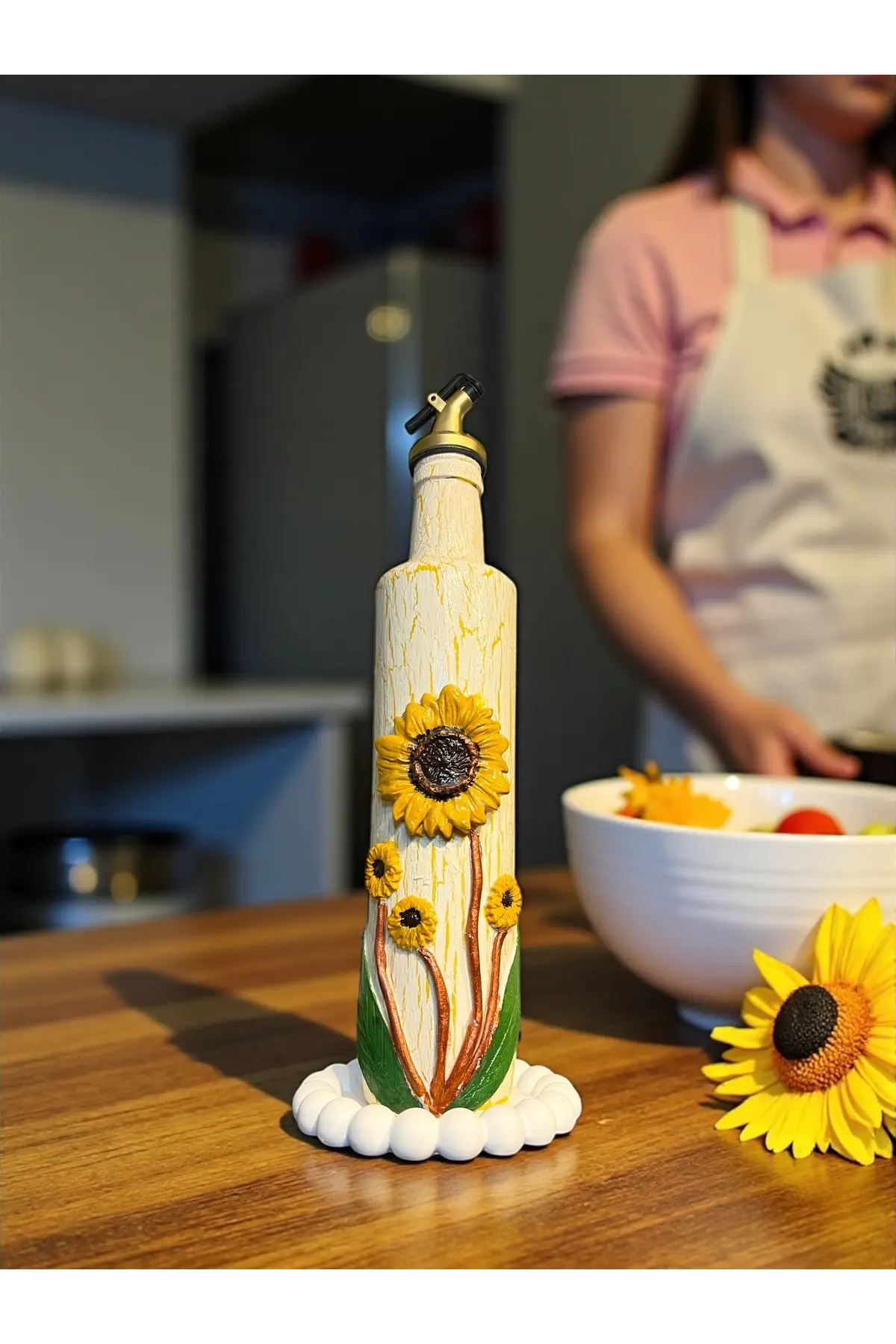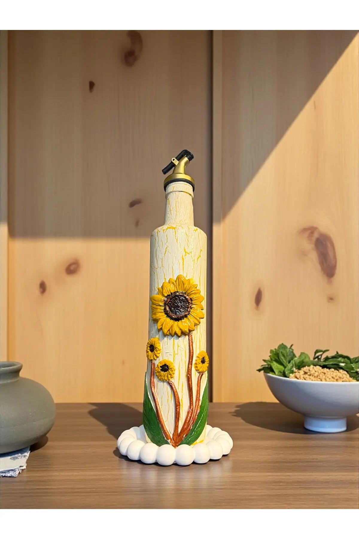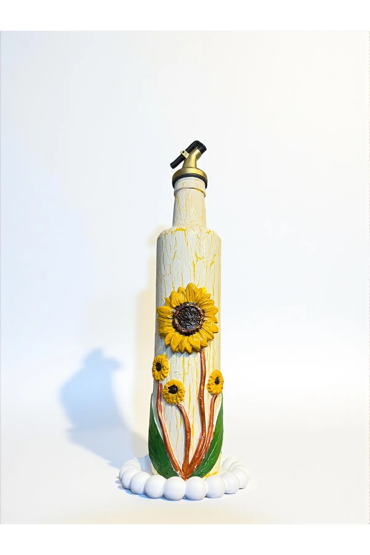 500 ml El Yapımı Ayçiçek Desenli Cam Yağdanlık – Çatlatma Dokulu, Kabartma Kil Uygulamalı