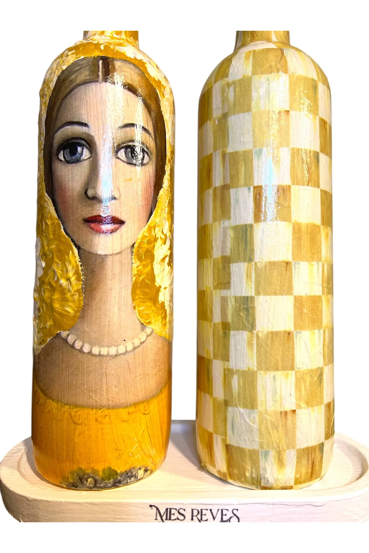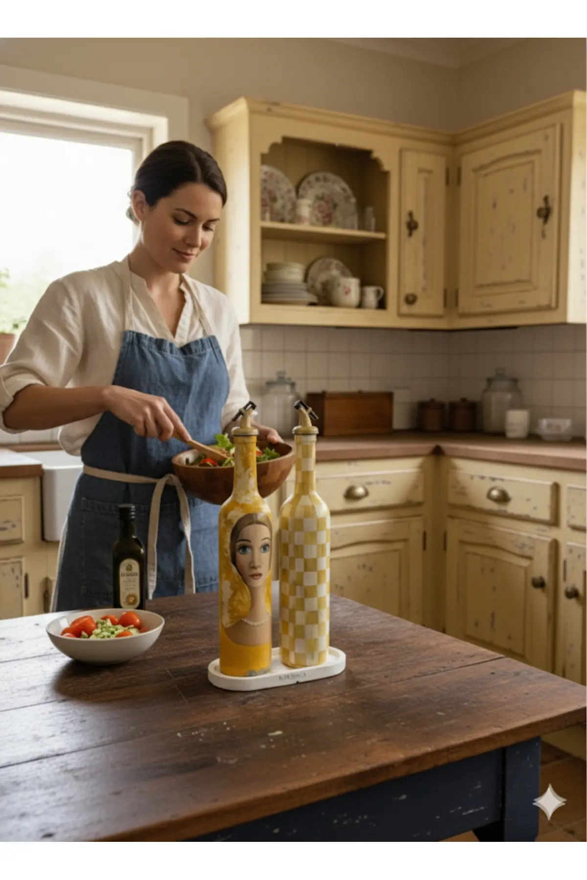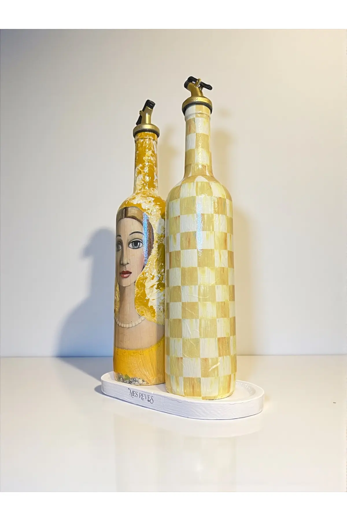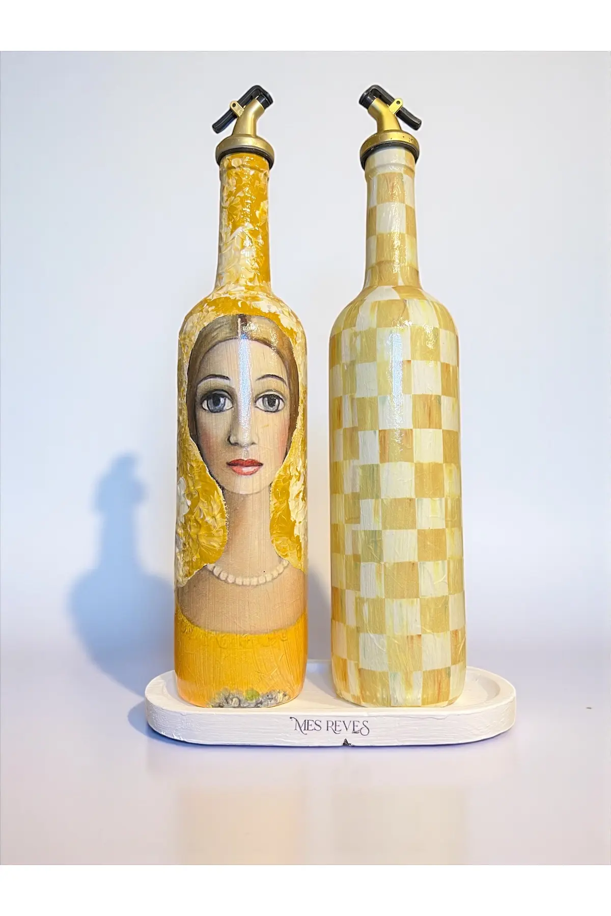 750 ml El Yapımı Sarı Portre ve Dama Desenli 2’li Dekoratif Cam Yağdanlık Seti – Sunum Standlı