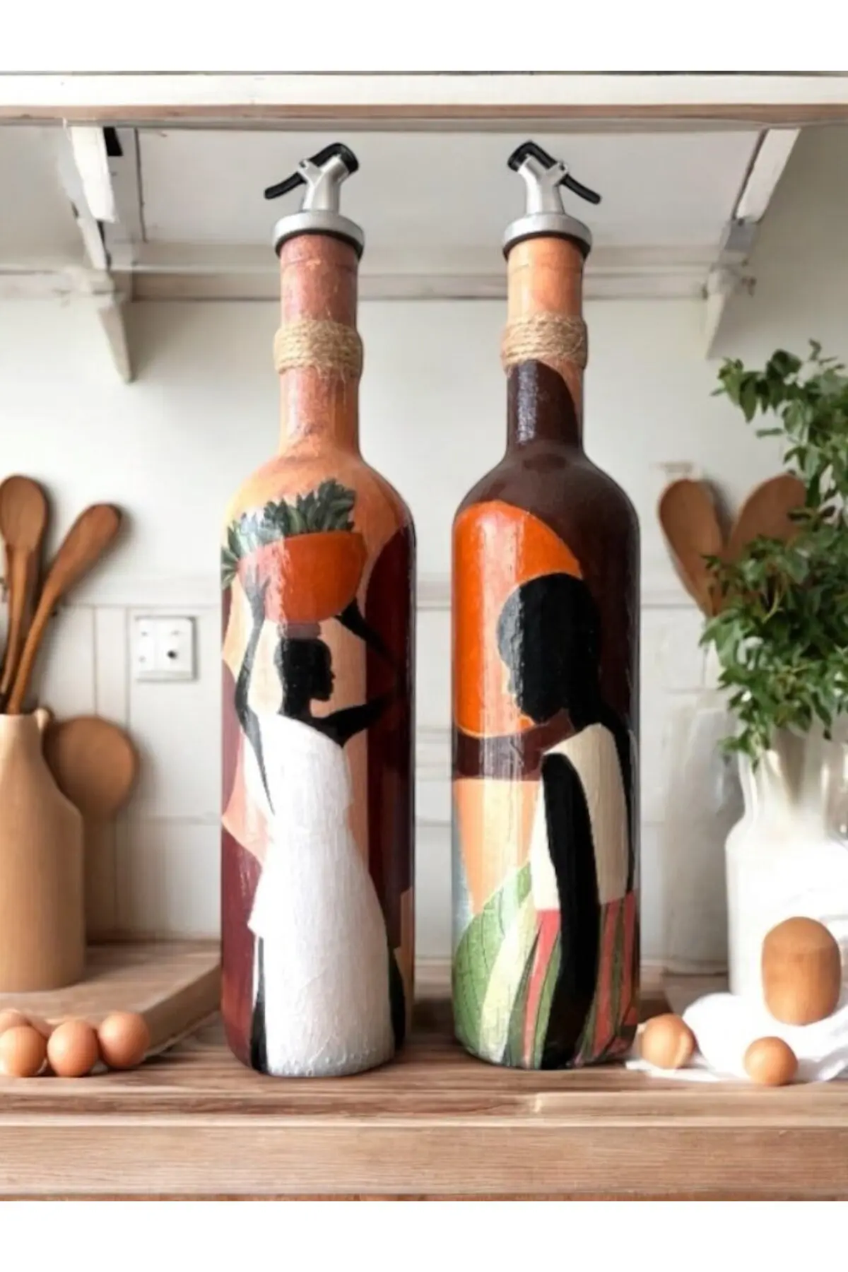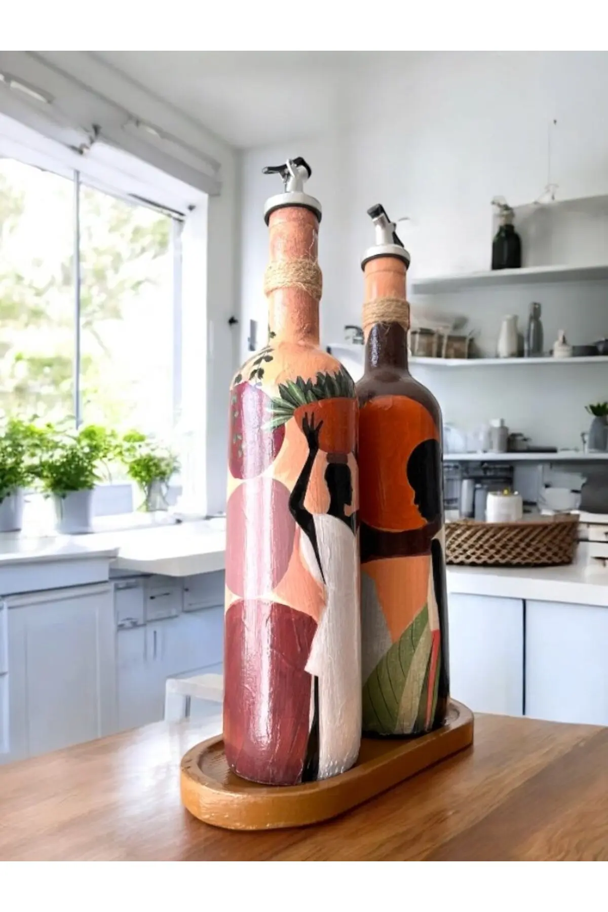 Afrika Kadın Temalı El Yapımı 750 ml Zeytinyağı Sıvıyağ Şişesi Yağdanlık Yağlık 2’li Set