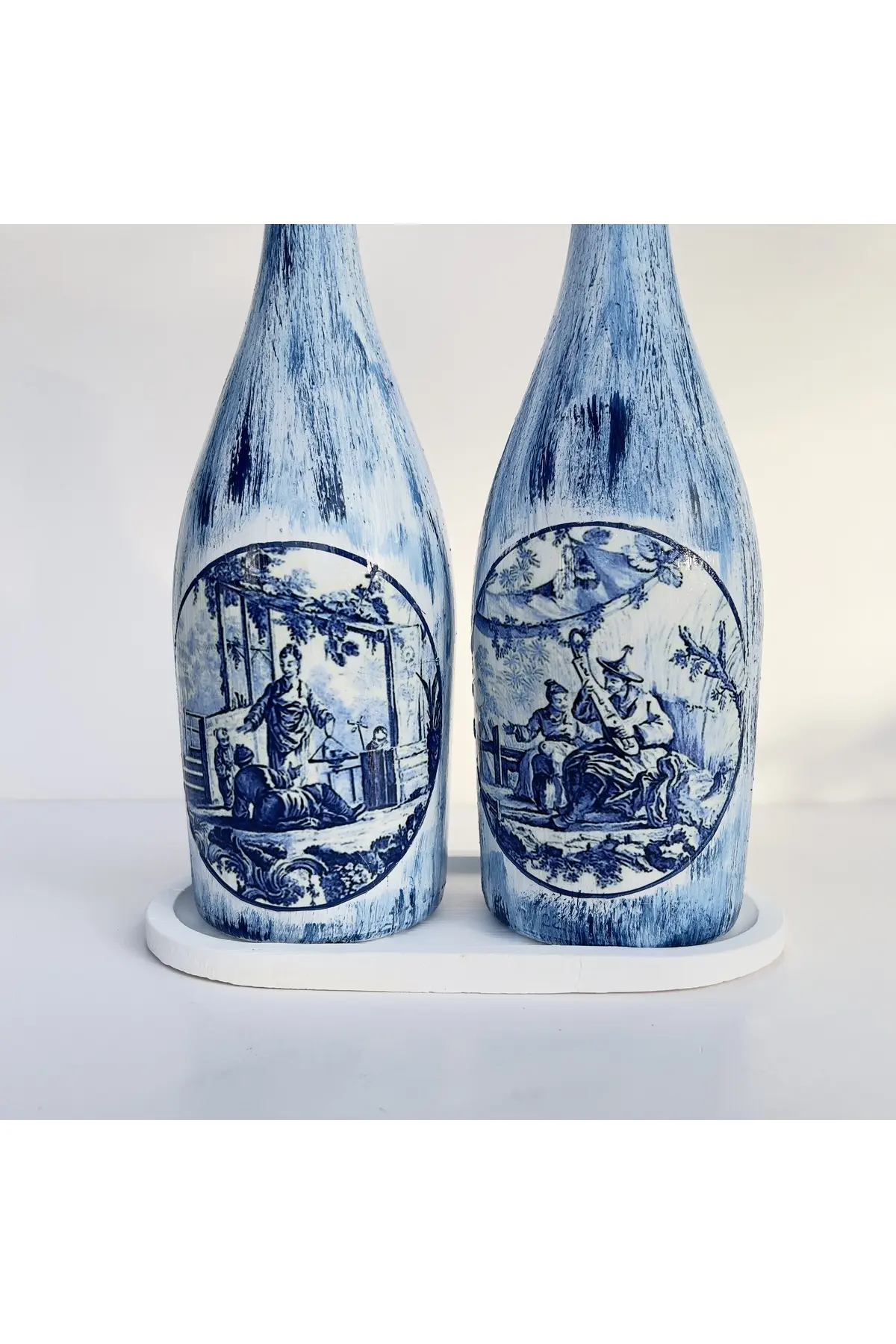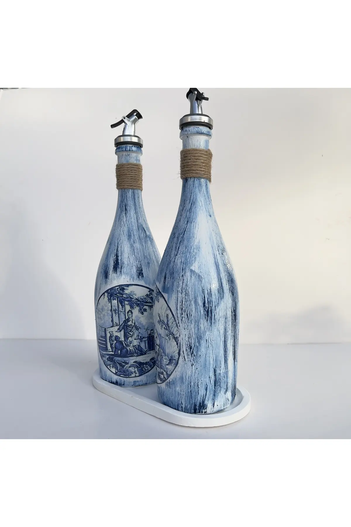 Beyaz Sunum Stantlı Çini Desenli Mavi Japon İzleri Şarap Şişesi Yağdanlık Seti Mutfak Dekoru