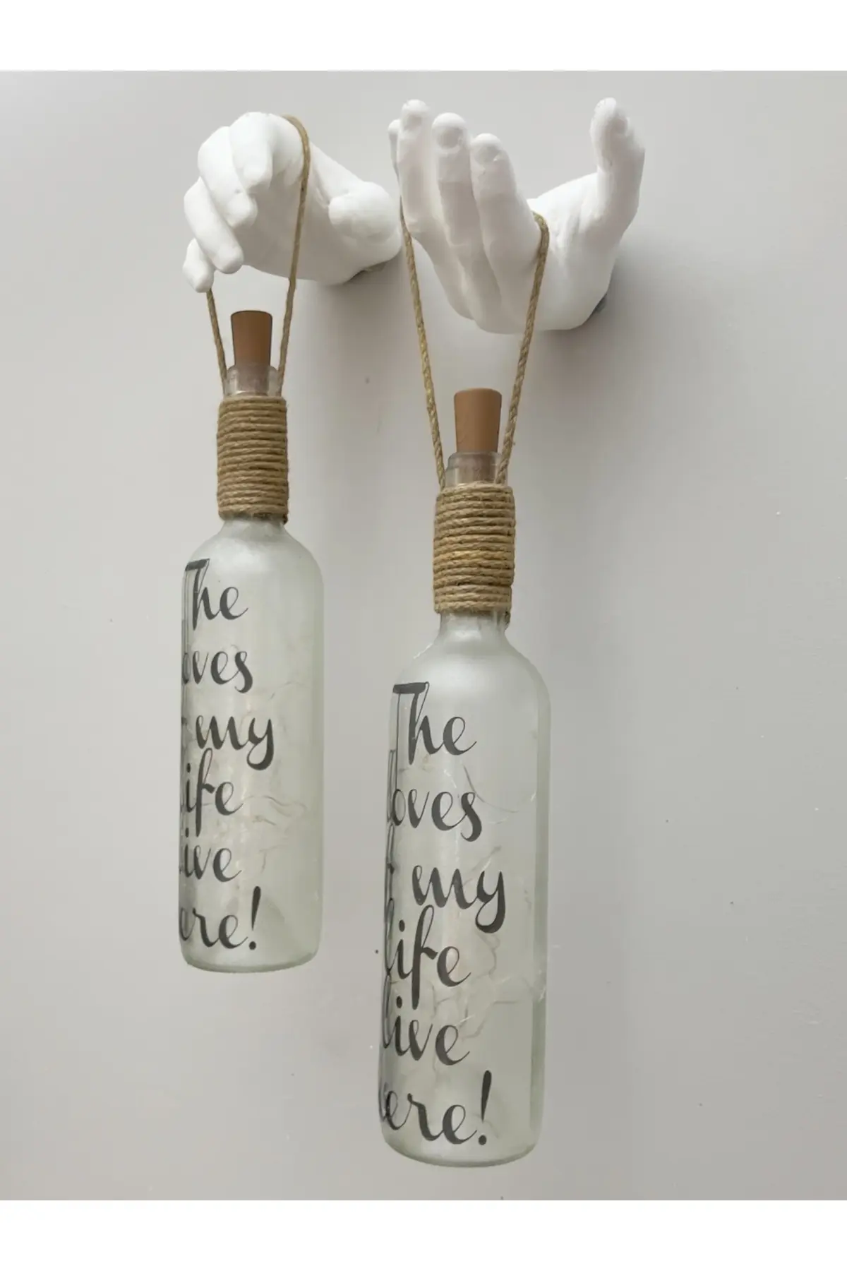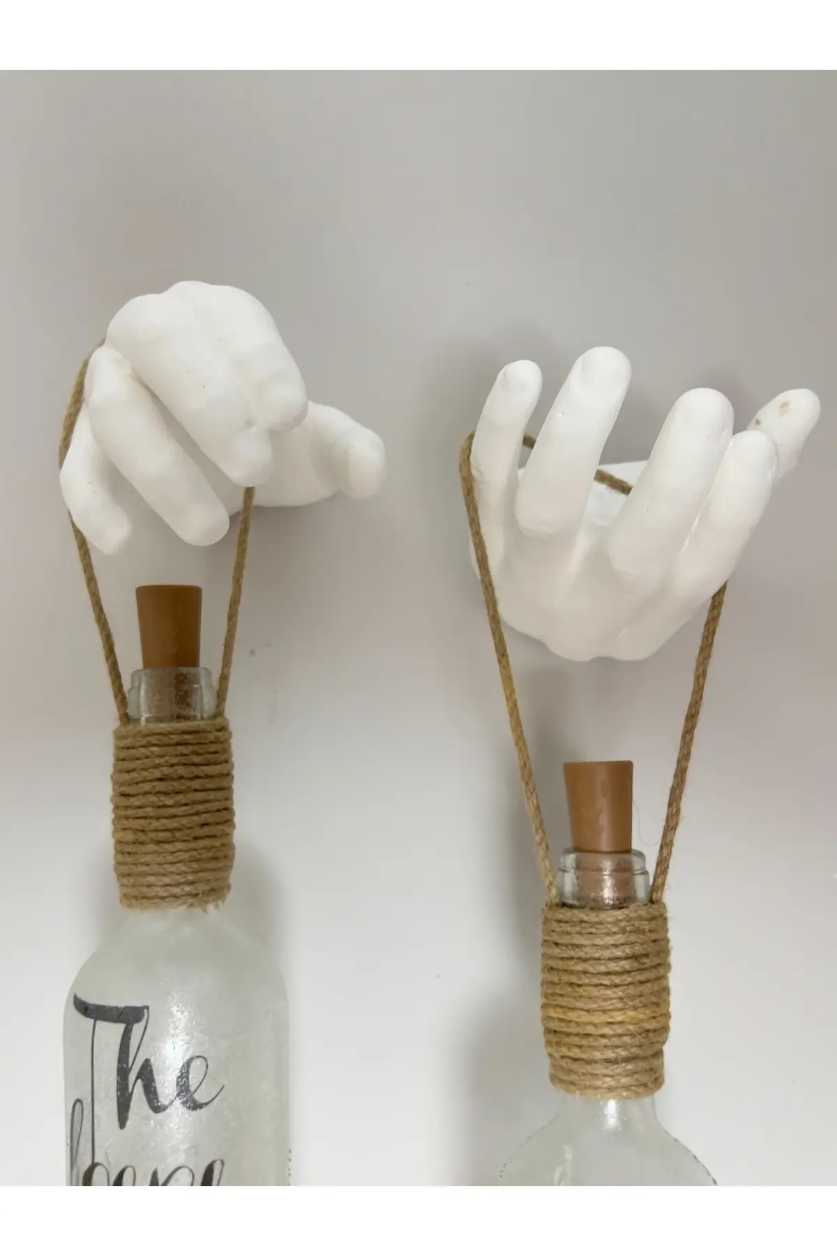 Bu benzersiz erkek el heykeli dekorlu şarap şişesi tıpa peri led ışıklı aplikler, estetik ve işlevselliği bir araya getiriyor. ; Beyaz renkteki erkek eli heykeli tasarımı, ortamınıza zarif ve şık bir görünüm sunarken, tıpa peri led ışıkları ile aydınlatılarak mekanlarınızda romantik bir atmosfer yaratmanıza yardımcı olur. ; Özellikler: Tıpa peri ledler PİLLE çalışmaktadır. ; El yapımı Beyaz renkteki erkek eli heykeli, her şişenin üstüne özenle monte edilmiştir. ; El yapımı beyaz renkteki erkek eli heykeli, her şişenin üstüne özenle monte edilebilmesi için duvar askı aparatları ile birlikte gönderilmektedir. ; Evinizde, bahçenizde ya da ofisinizde kullanabileceğiniz, özel olarak elde üretilmiş ham el dekorları ile dizayn edilmiş olan ürünümüzün boyutu: Her bir el el: 21×17 cm’dir. ; Her bir şişe ebadı : 6cm çap, boy30 cm’dir. ; Ürünün toplam boyu jüt ip askısı ile birlikte 50 cm’dir. ; Ham el dekorları tamamen el imalatıdır. ; Led ışıklar, şişenizin içini sıcak ve davetkar bir ışıkla aydınlatırken, odanıza benzersiz bir hava katar. ; Bu aplik, evinizi veya özel etkinliklerinizi göz alıcı bir şekilde süslemek için mükemmel bir seçenektir. ; Bu el yapımı benzersiz siyah el heykeli dekorlu şarap şişesi tıpa peri led ışıklı aplikler, çarpıcı görünümlü buzlu cam hissiyle mekanınıza estetik, çekicilik ve sofistike bir hava katar ve evinizin dekorasyonunu benzersiz bir şekilde tamamlamak için idealdir. ; Şıklık ve işlevselliği bir araya getiren bu ürün, özel anlarınıza unutulmaz bir dokunuş ekler. ; Ürün görseldekiyle birebir gönderilmektedir: Heykel eller, tıpa led ışıklar, şişeler ürüne dahildir. ; Cam şarap şişeleri özel olarak buzlandırılmıştır. ; Bu aplik, evinizi veya özel etkinliklerinizi göz alıcı bir şekilde süslemek için mükemmel bir seçenektir. ; Ayrıca ürünümüz, doğum günü, ev hediyesi, yeni yıl hediyesi olarak da kullanılabilir.;
