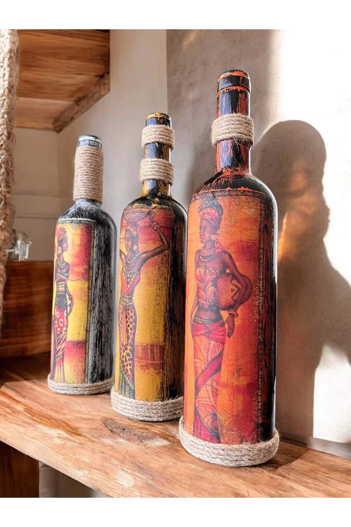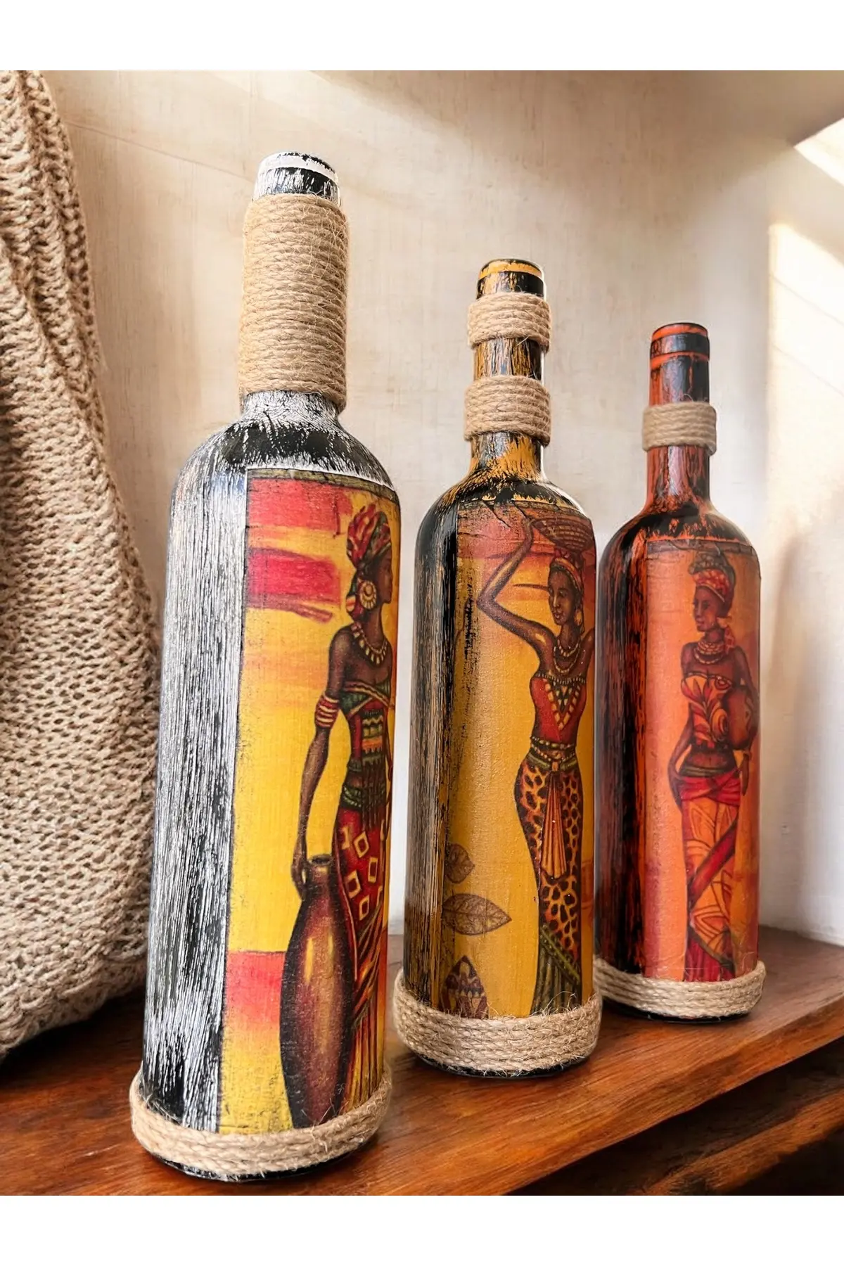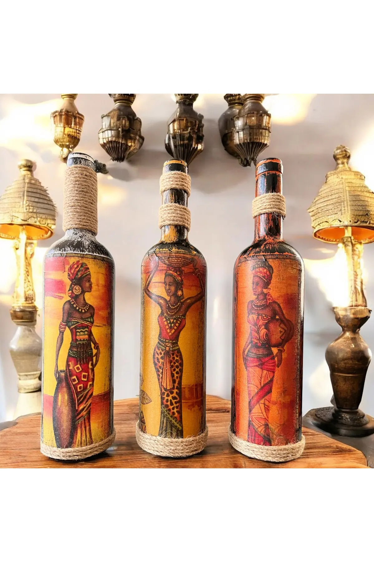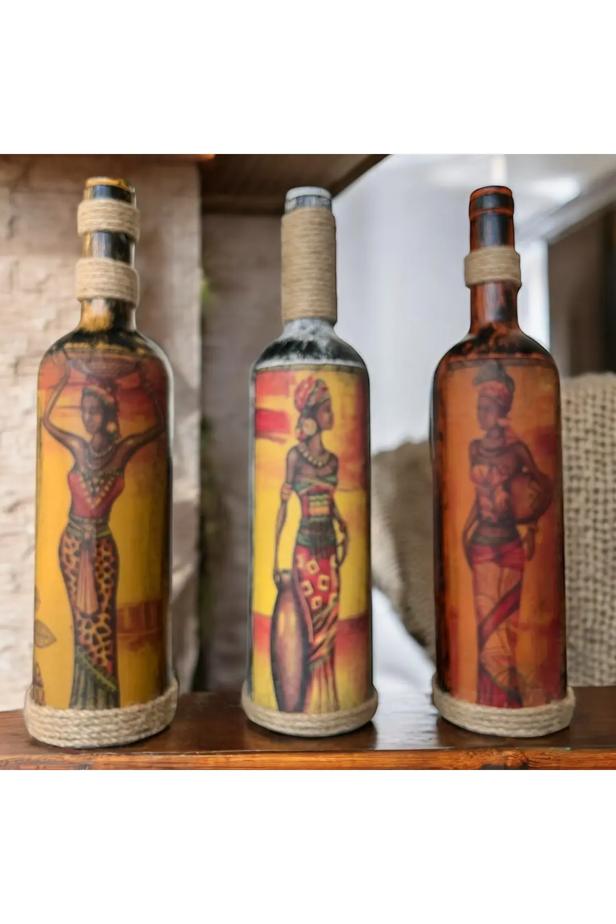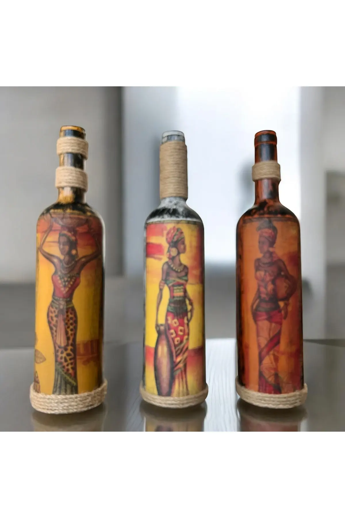 El Yapımı Afrika Kabilesi Kadın Figürlü Dekoratif Şarap Şişeleri 3’lü Set