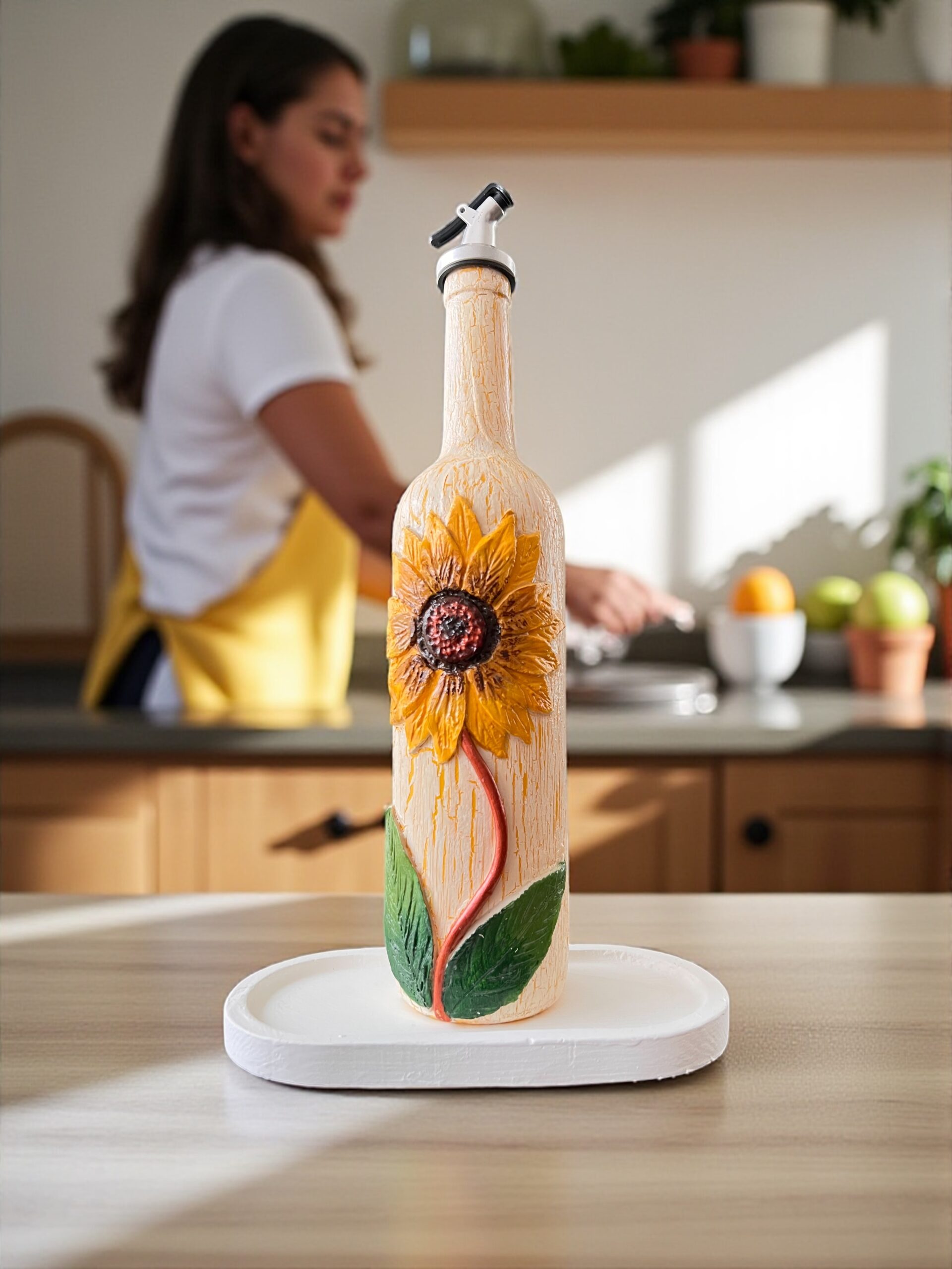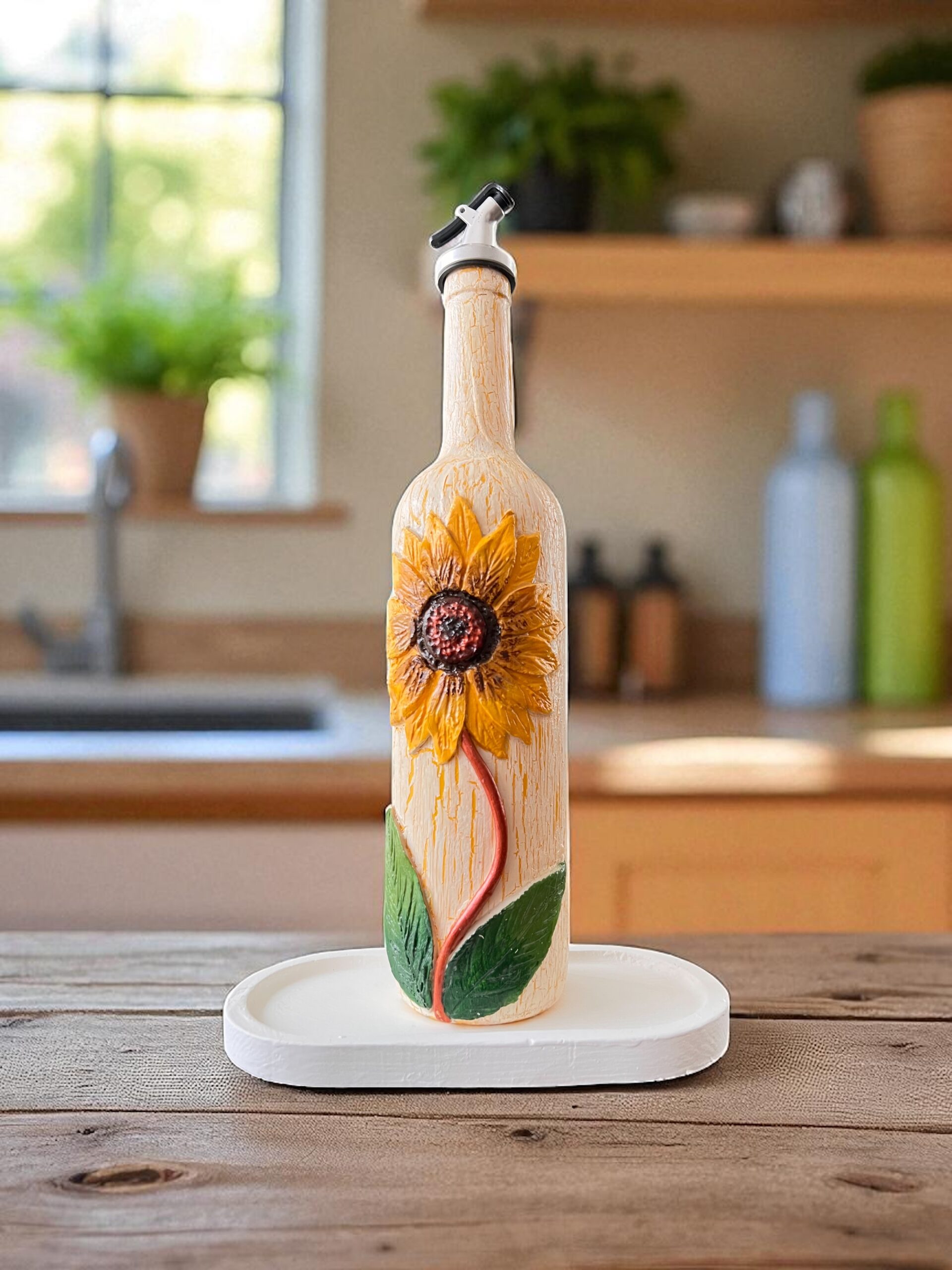 El Yapımı Ayçiçek Kabartmalı Yağdanlık – Dekoratif Zeytinyağı & Sirke Şişesi Sosluk| Rustik Mutfak