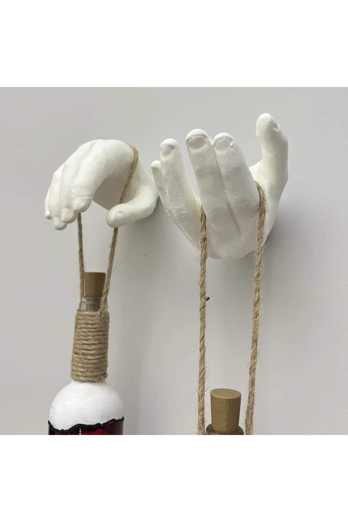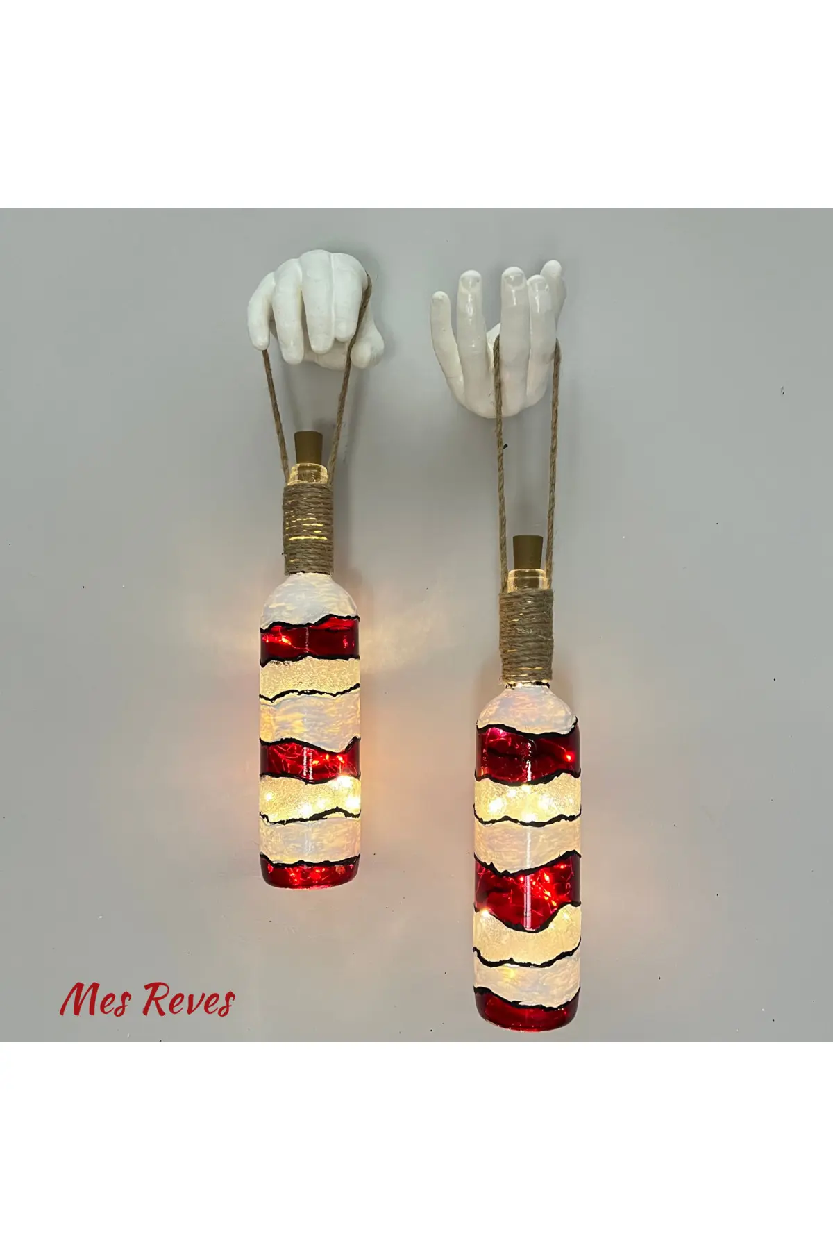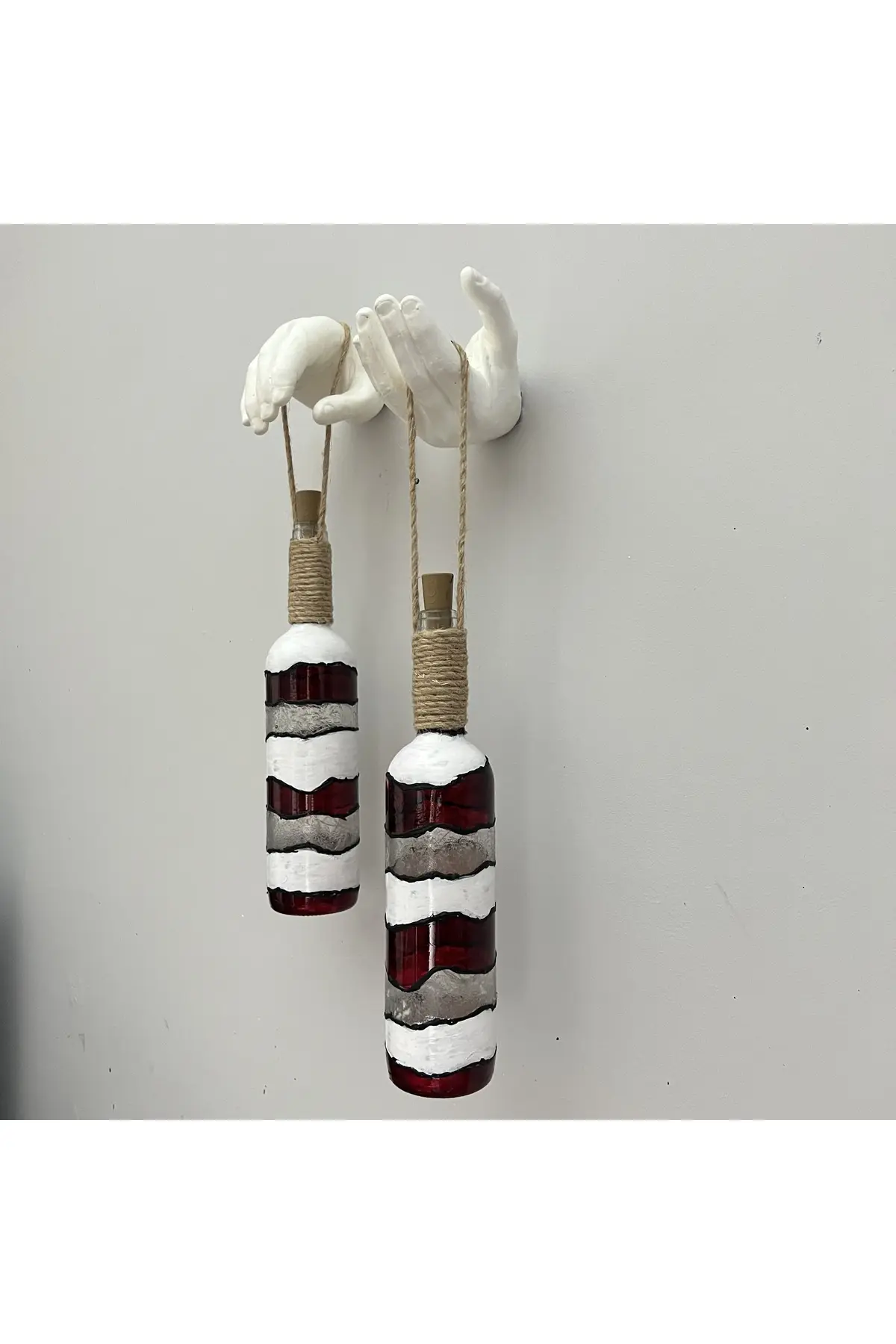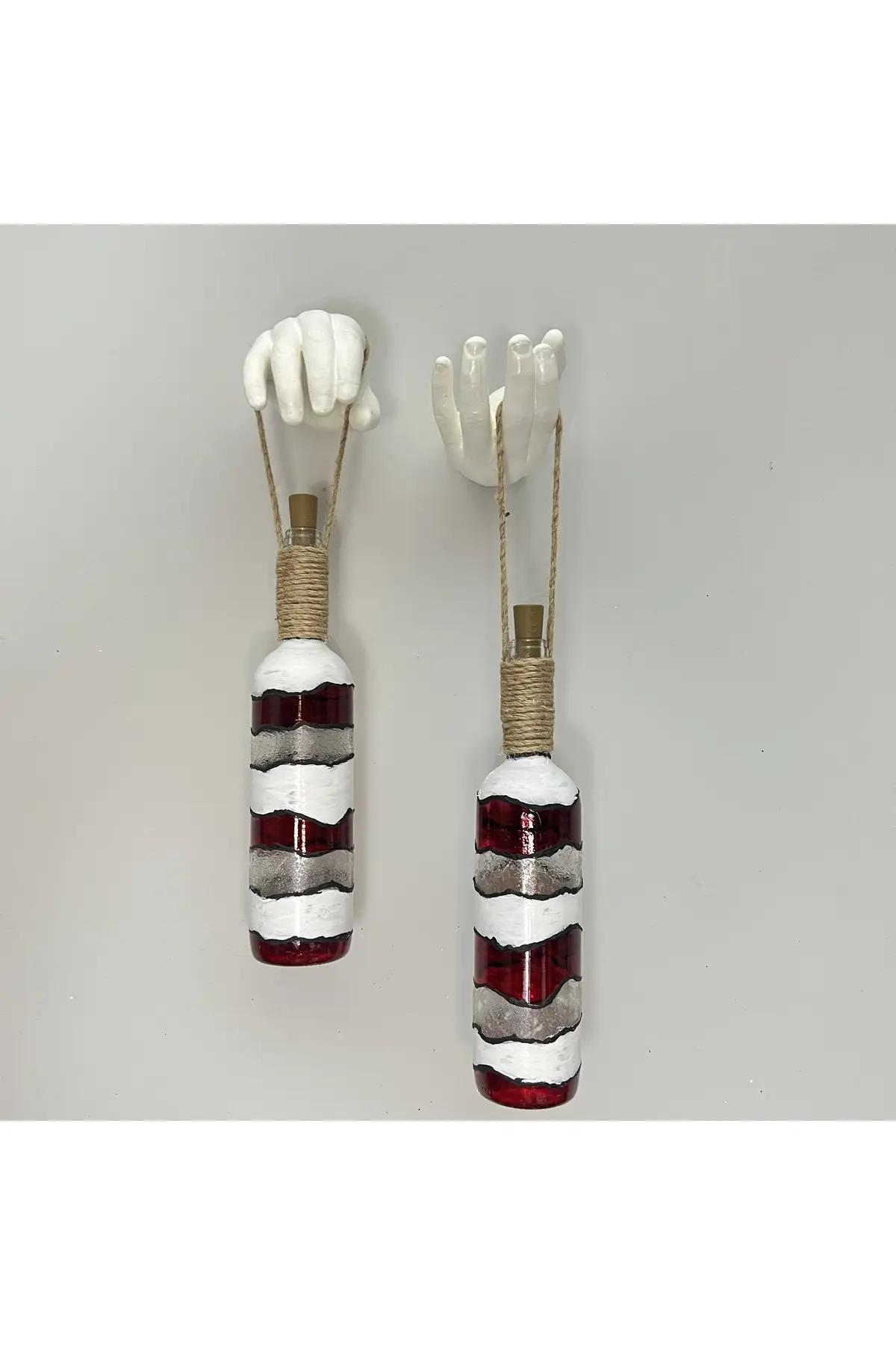 El Yapımı Beyaz Erkek El Heykeli Dekorlu Kırmızı Beyaz Vitray Şarap Şişesi 2’li Aplik Set