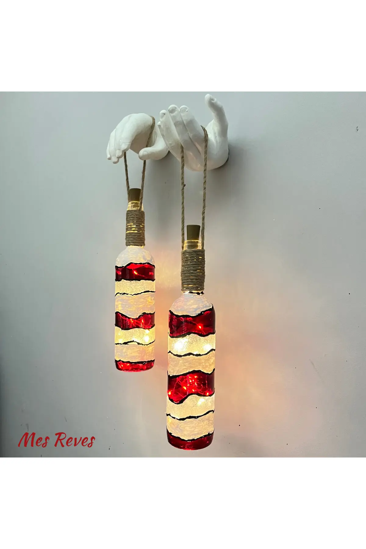 Zarafetle Dokunmuş Sanat: Bu özel 2’li aplik set, sanatseverler ve estetik tutkunları için tasarlanmış bir başyapıttır. ; El yapımı ve eskitme boyama tekniğiyle hazırlanan her bir el, özenle boyanmış ve detaylandırılmıştır. ; Her bir el, 21×17 cm boyutlarındadır, odanıza sofistike bir hava katmak için ideal bir ölçüye sahiptir. ; Hayalinizdeki Vitray: Kırmızı ve beyaz vitray boyama tekniğiyle süslenmiş şarap şişeleri, göz alıcı bir güzellik sunar. ; Her bir şişe, 6 cm çapında ve 30 cm uzunluğundadır, odanızın atmosferine zarif bir dokunuş ekler. ; Şişeler, içindeki gün ışığı tıpa LED aydınlatmalar sayesinde büyüleyici bir aydınlatma etkisi yaratır. ; Pillerle çalışan bu LED ışıklar, her mekanda kullanım için pratik ve şık bir çözümdür. ; Kolay Asma ve Harika Bir Görünüm: Bu aplik seti, toplamda 50 cm uzunluğunda jüt ip askısı ile birlikte gelir. ; Ürünün toplam boyu, askı aparatları dahil, duvara asılmış şekilde muazzam bir etki yaratır. ; Duvarınıza kolayca asabilir ve her ziyaretçiyi büyüleyici sanat ve ışıkla karşılayabilirsiniz. ; Dekorunuzda İnce Detaylar: Ürün, duvar askı aparatları ile birlikte gönderilir, böylece hemen kullanmaya başlayabilirsiniz. ; Her bir detay özenle düşünülmüş, estetik ve işlevselliği bir arada sunar. ; Bu şahane aplik seti, evinize benzersiz bir atmosfer katmak için tasarlanmıştır. ; Sanat ve Aydınlatmanın Buluştuğu An: Bu el yapımı aplik seti, her bir detayında sanat ve aydınlatmanın ustalıkla birleştiği bir şaheserdir. ; Evinizdeki duvarları büyüleyici bir sanat galerisine dönüştürmek istiyorsanız, bu set tam aradığınız şeydir. ; Şimdi sipariş verin ve evinizdeki değişimi hissedin.;