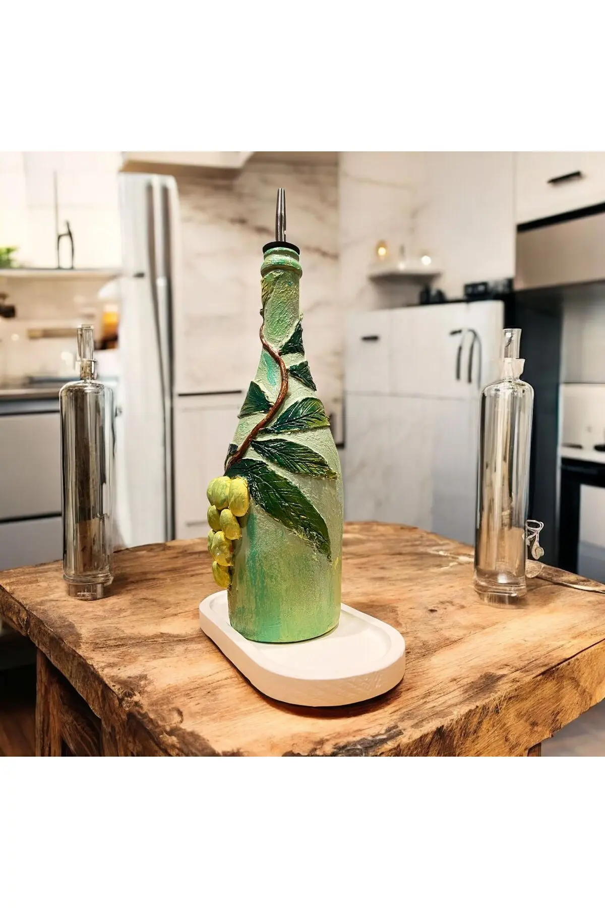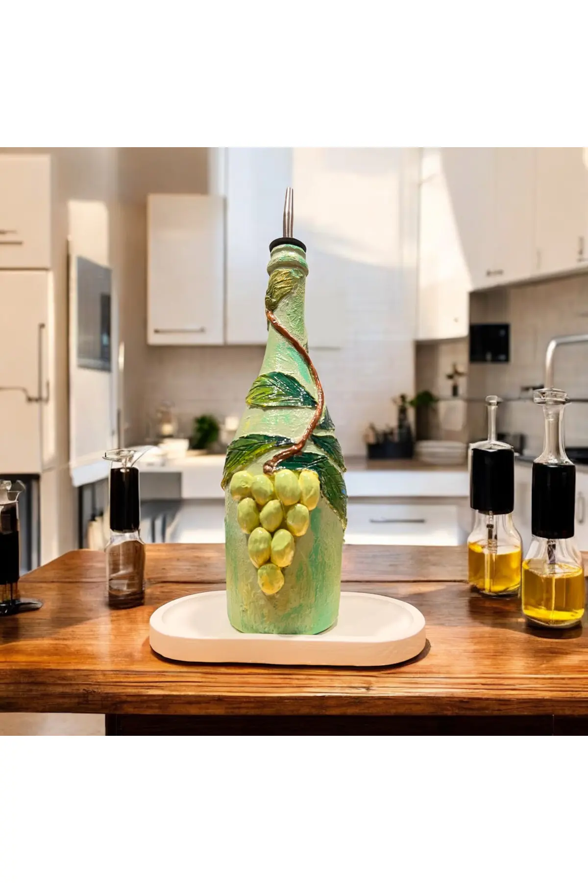 Doğal görüntüsü ve el yapımı dokunuşları mutfak dekorasyonunuza çarpıcı bir dokunuş katmak için özel olarak tasarlanmış bu yağ/sirke ve sosluk şişesi, üzüm deseniyle öne çıkıyor.; Yeşil-sarı tonlarındaki estetik ve kabartma doğal kil uygulamaları, bu yağ/ sosluk şişesini sadece bir mutfak aracı olmanın ötesine taşıyor.; Üzüm Deseni: Yeşil-sarı tonlarında kabartma detaylı el boyaması olan bu yağ/sosluk şişesi, doğal kil uygulaması olan üzüm ve üzüm dalı deseni ile adeta bir sanat eseri gibi görünüyor.; Bu yağ/sosluk şişesi mutfak sunumunuza sadece görsel bir zevk sunmakla kalmıyor, kullanım sırasında da keyif sağlıyor.; Kullanım Kolaylığı: Pratik bir dökme ağzına sahip olan bu yağ şişesi, kullanım sırasında konfor sunuyor.; Yağların ve sosların dökülmesi sırasında kontrollü bir akışı kolaylaştırırken, estetik bir sunum imkanı da sağlıyor.; Sağlıklı Malzeme: Yüksek kaliteli malzemelerden üretilmiş olan bu yağ şişesi, gıda güvenliği standartlarına uygun olup sağlıklı bir mutfak deneyimi sunuyor.; Elde boyanmış seramik görünümlü sirke ve yağ şişesinin üzerindeki her detaylı kabartma desen özenle el yapımı olarak tasarlanmıştır.; Elde boyanmış dekoratif yağ şişesi, ev hediyesi, doğum günü, yıldönümü veya düğün hediyesi olarak, arkadaşlarınıza sizin kadar mutluluk verecek.; Paket İçeriği: Mutfak depolaması için yuvarlak, yeniden doldurulabilir bu yağ/sos şişe seti, 1 adet özel tasarımlı 750 ml kapasiteli zeytinyağı/sirke şişesi, 1 adet sunum standı ve 1 adet damlatmayan yağ dökme ağzından oluşmaktadır.; El yapımı bir ürün olduğundan, bu yağdanlık/sos setinin bulaşık makinesinde yıkanması önerilmez.