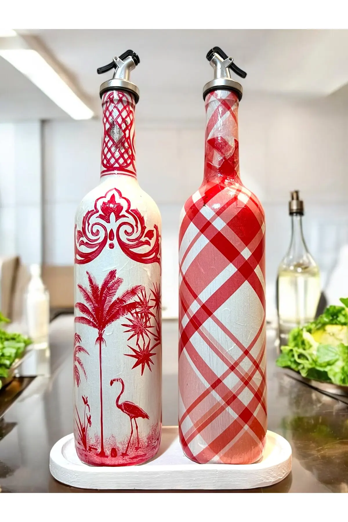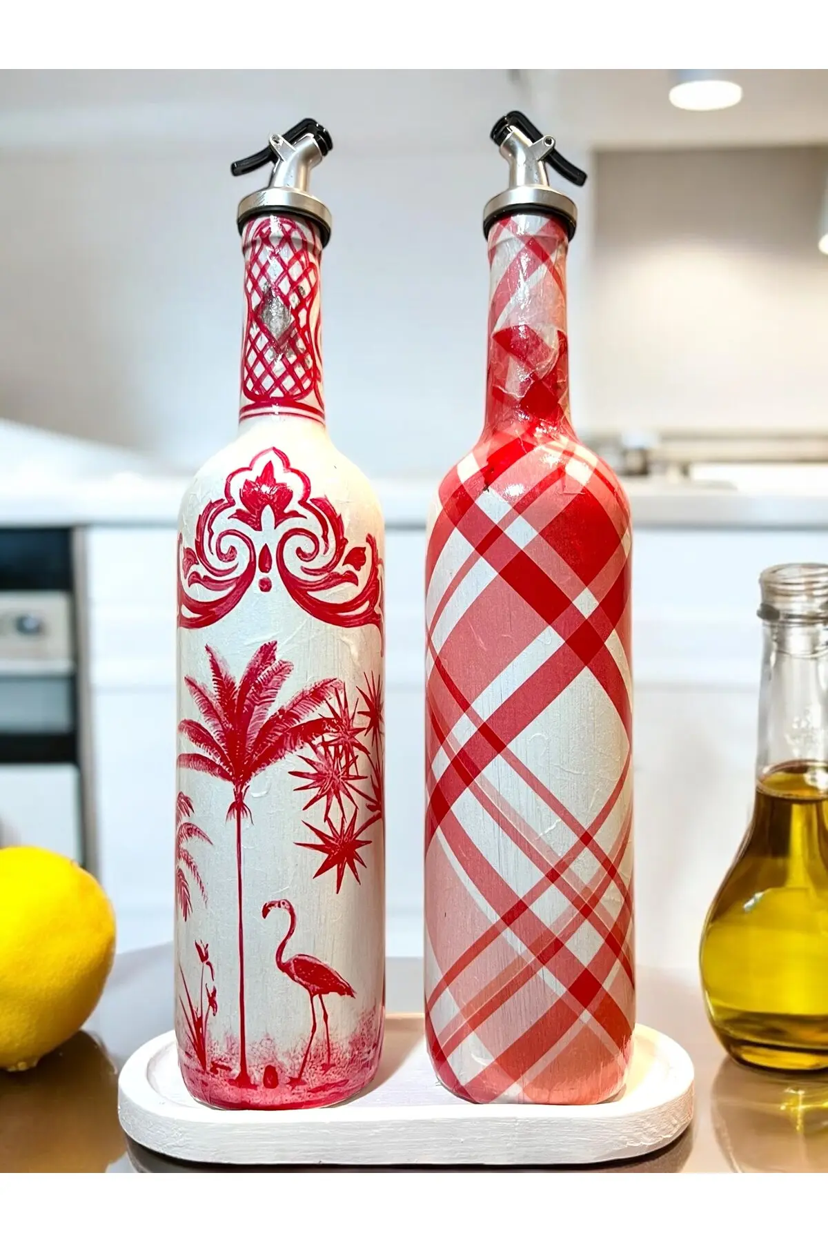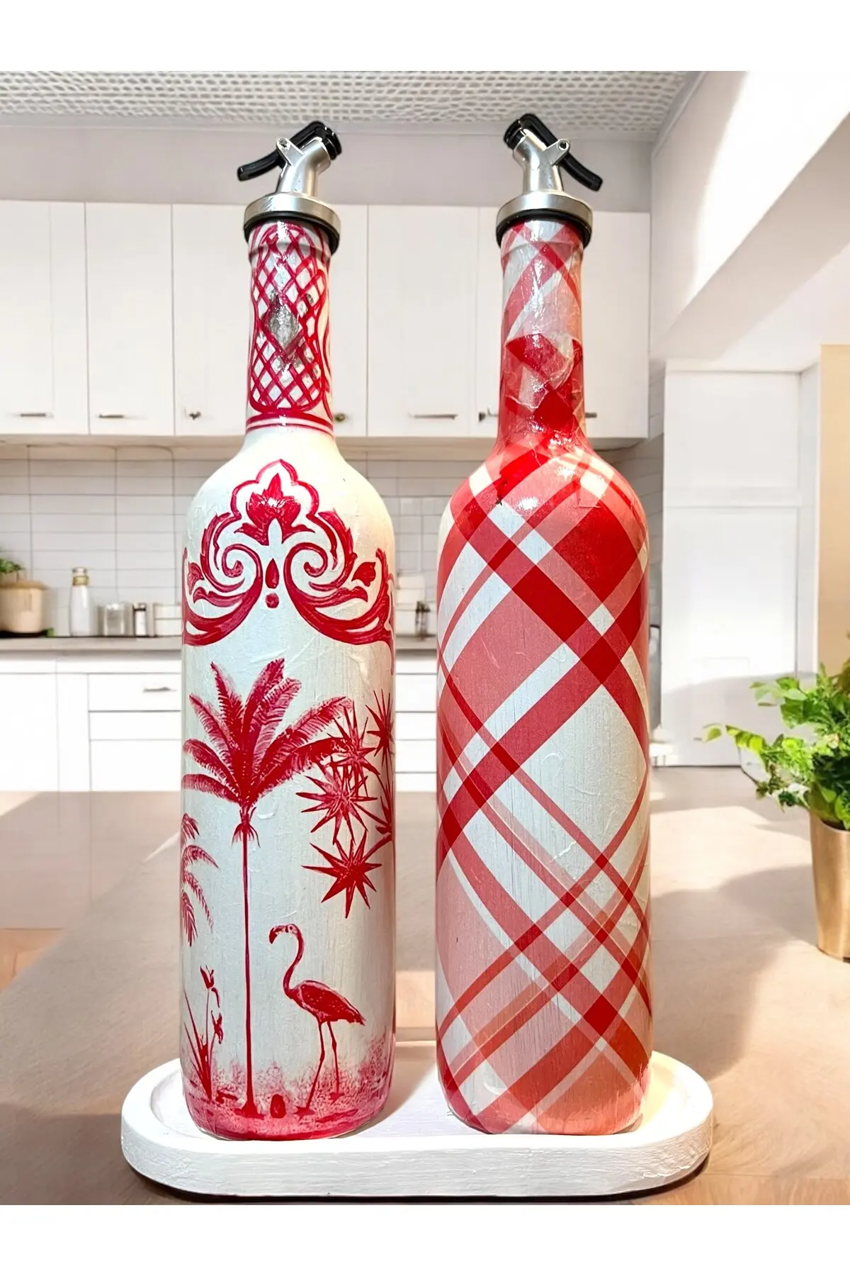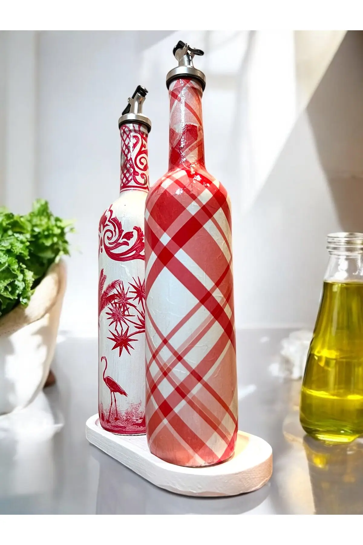 El Yapımı Kırmızı Beyaz Yağdanlık Seti – Flamingo Ekose Desenli Cam Şişe, Dekoratif Mutfak & Sofra