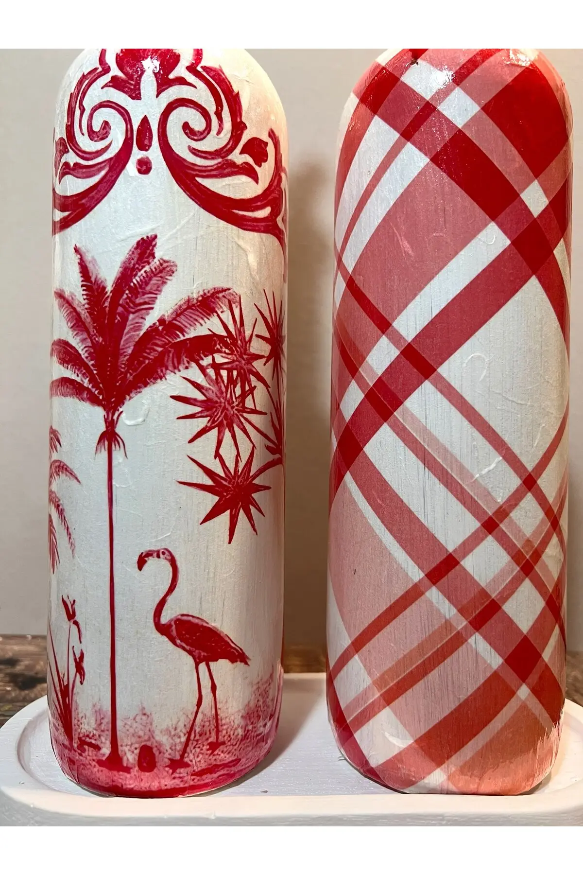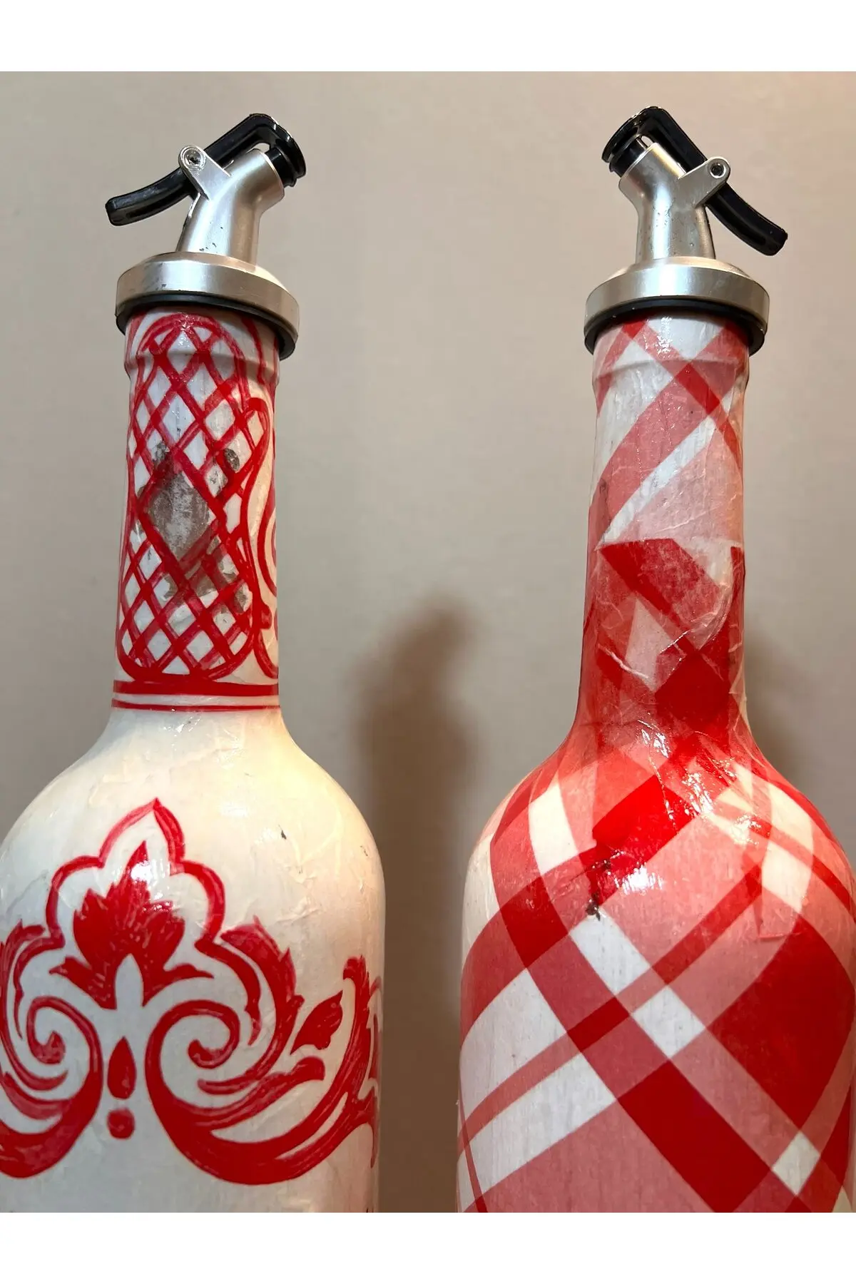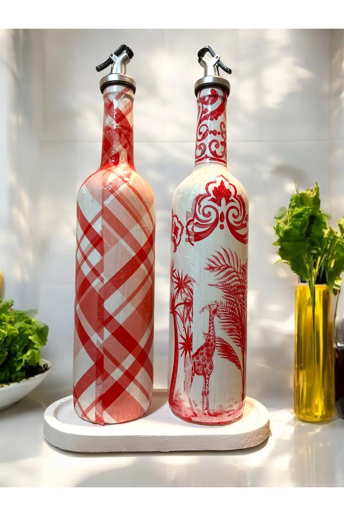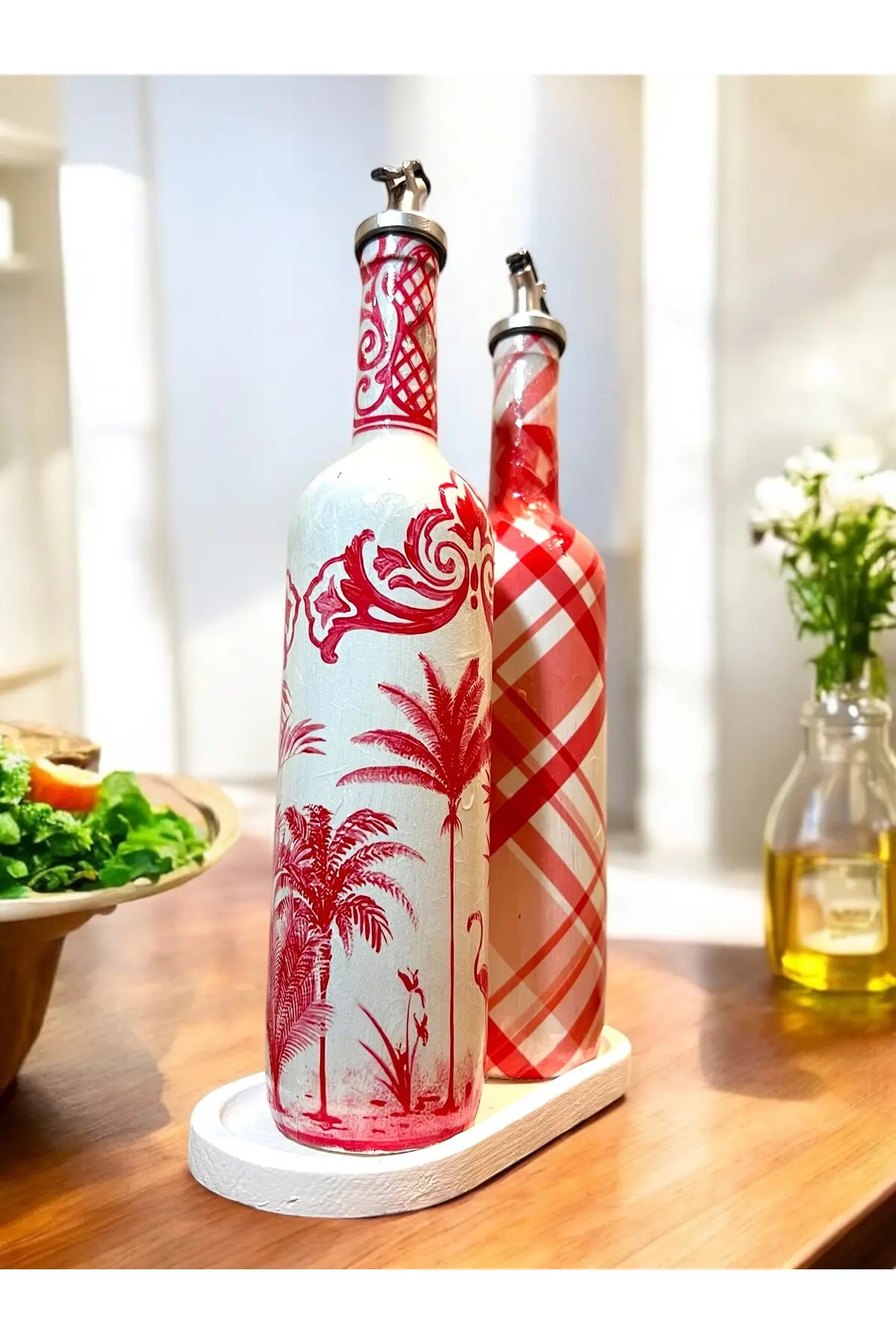 El Yapımı Kırmızı Beyaz Yağdanlık Seti – Flamingo Ekose Desenli Cam Şişe, Dekoratif Mutfak & Sofra