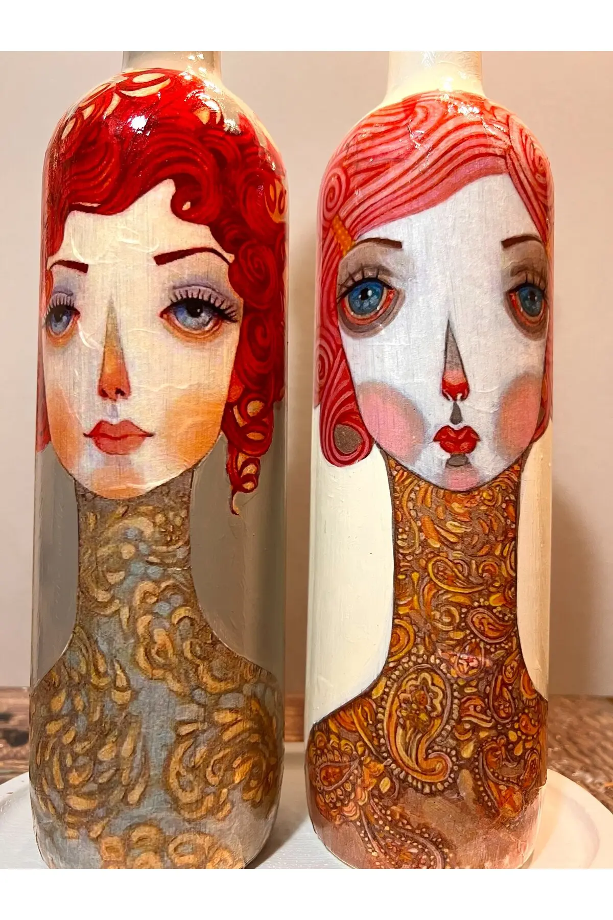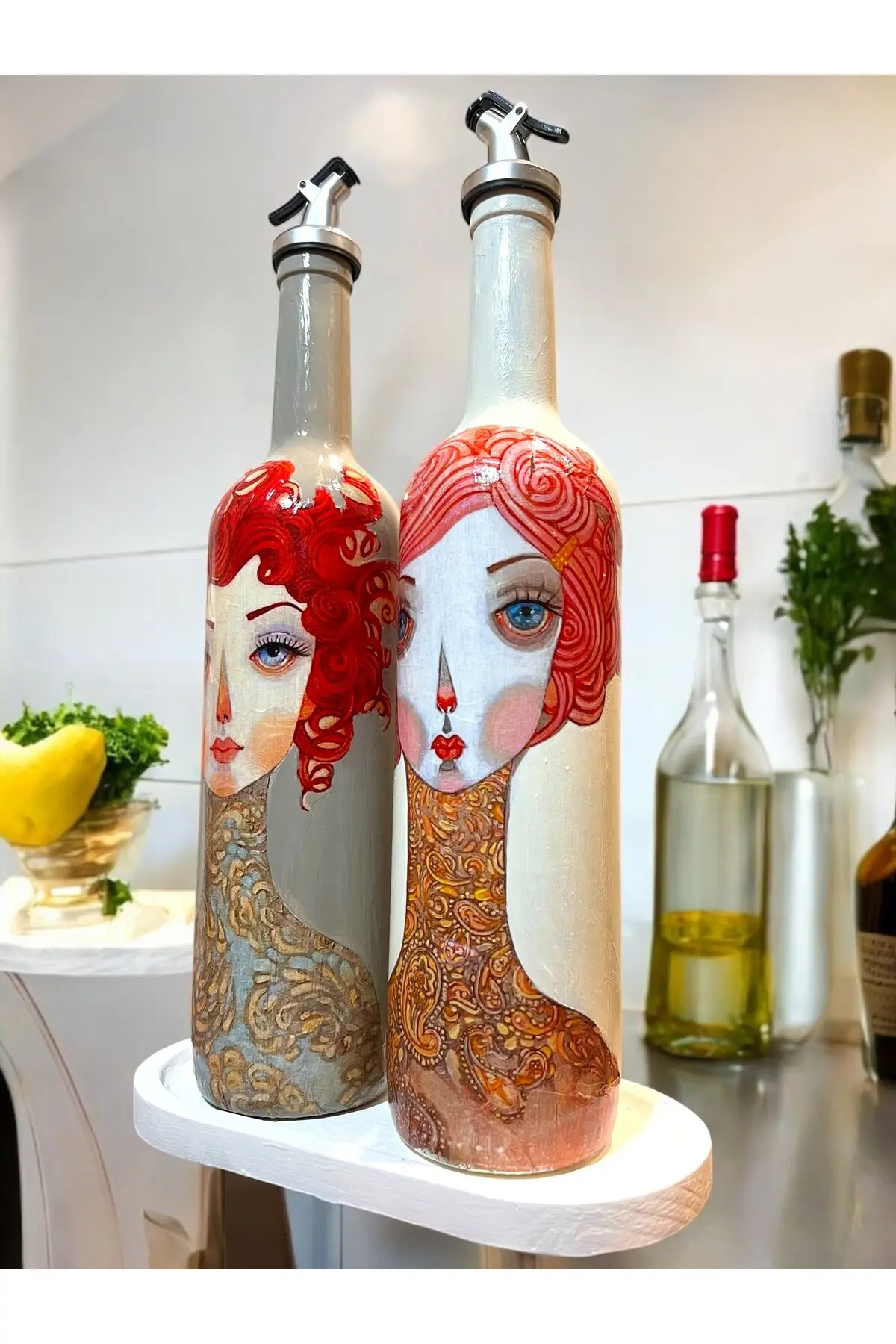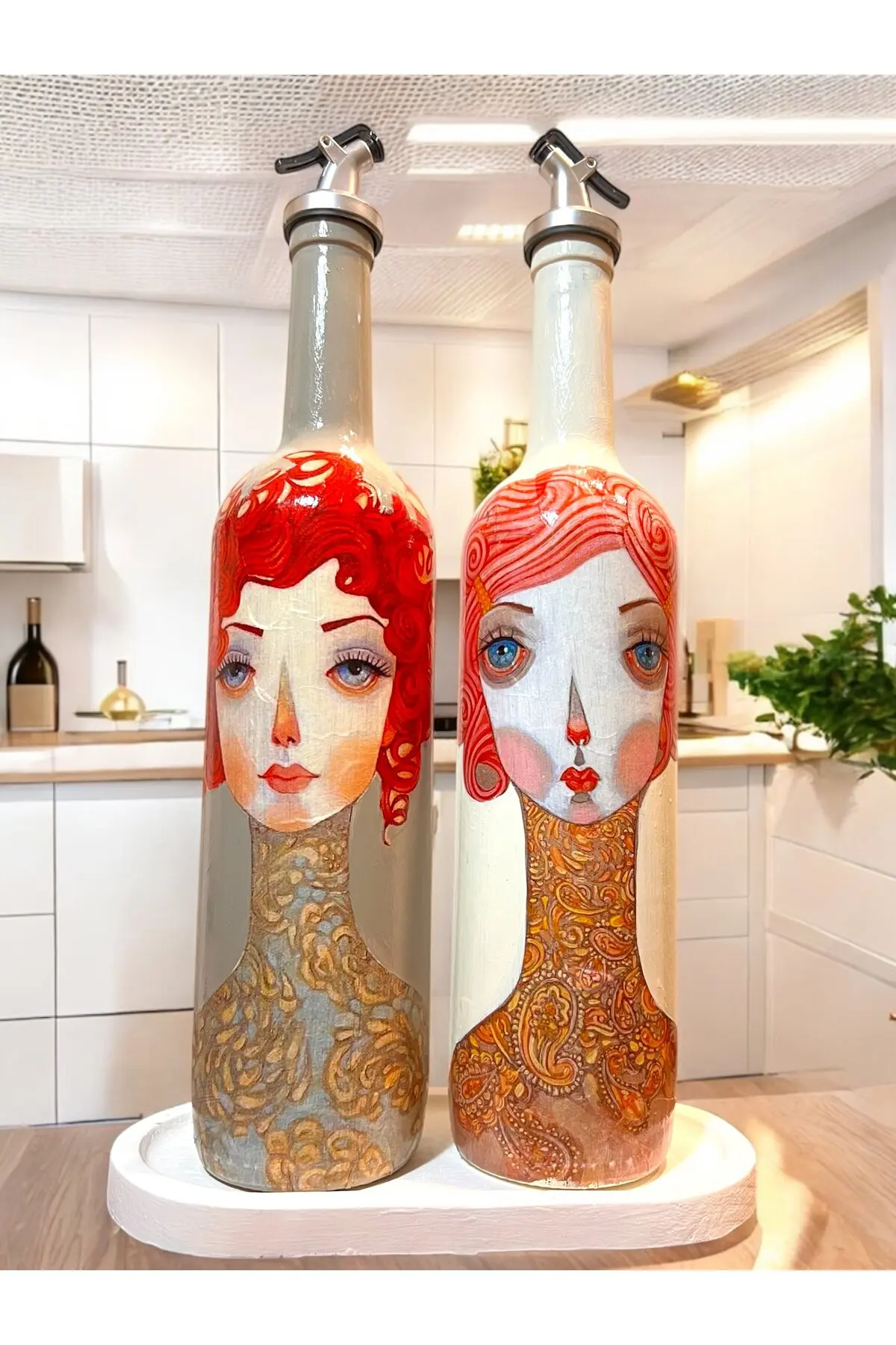 El Yapımı Kırmızı Saçlı Kadın Desenli Vintage Cam Şişe Yağdanlık Seti, Dekoratif Mutfak & Sofra Ürü