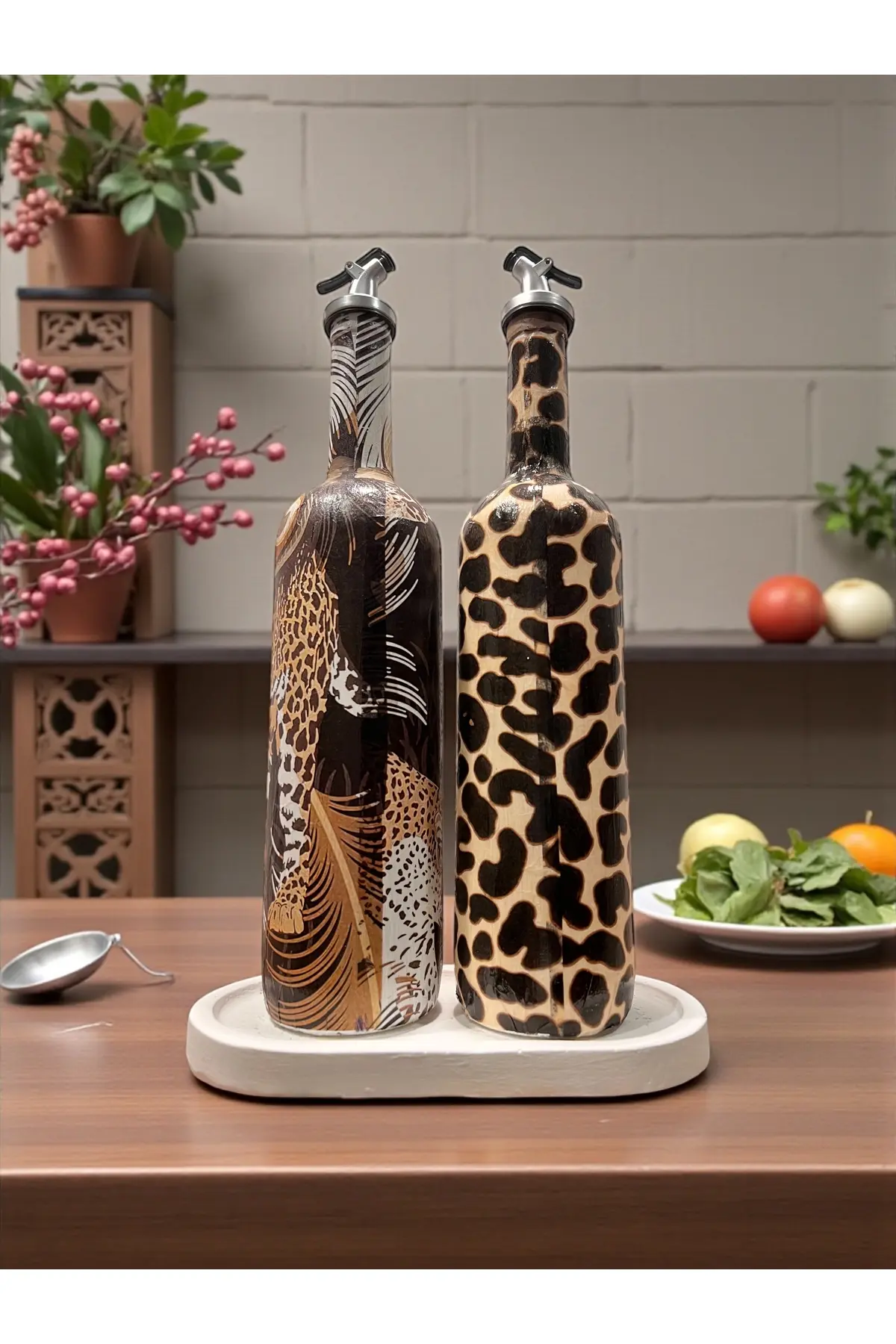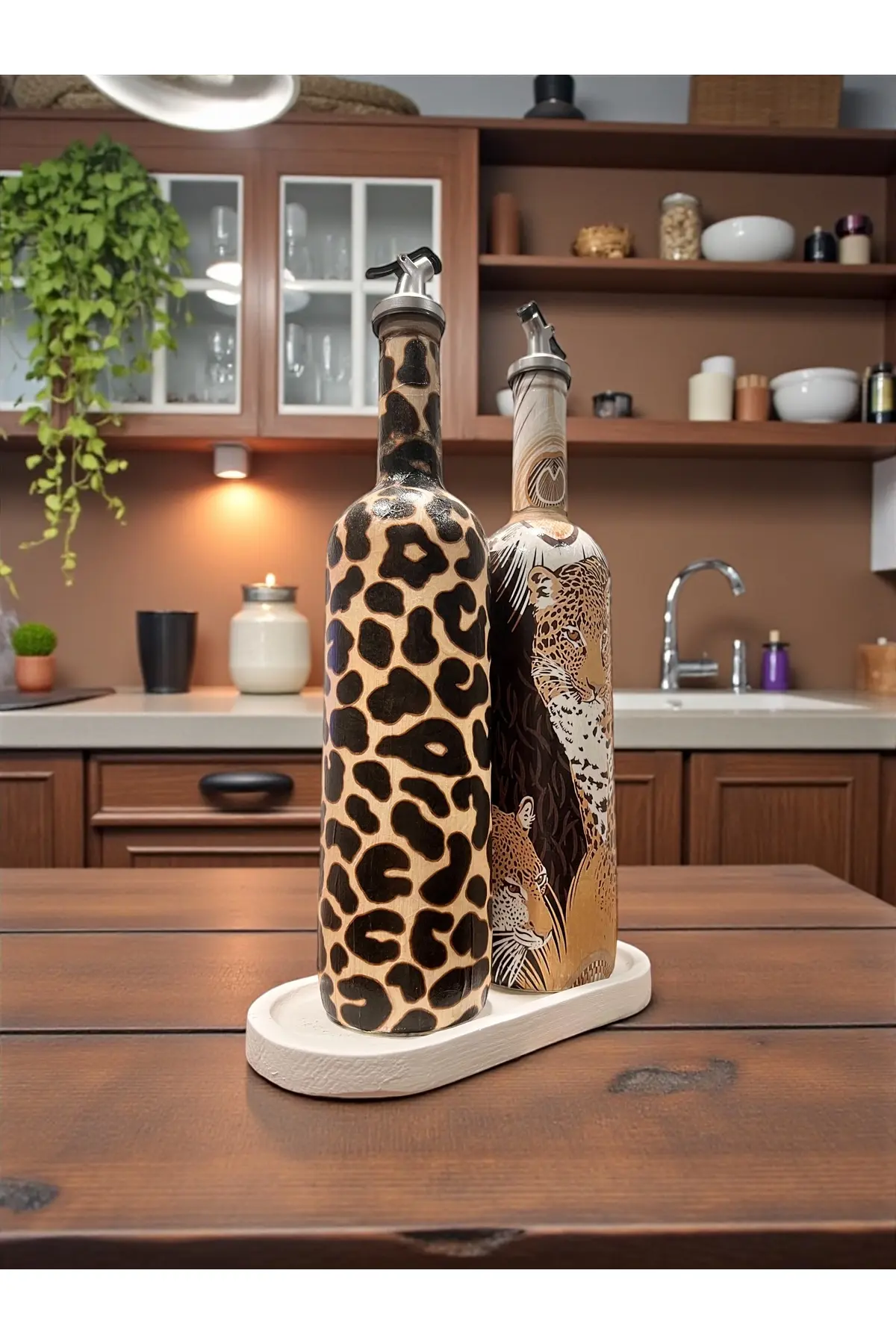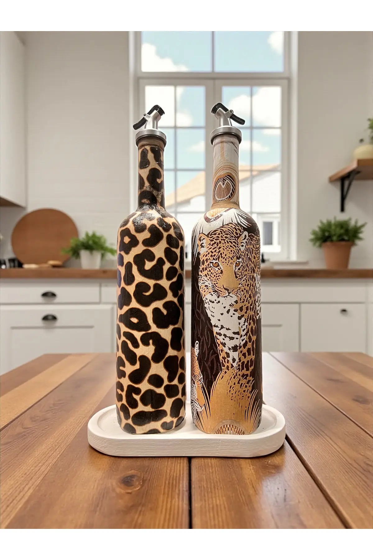 El Yapımı Leopar Desenli Cam Yağdanlık & Sirkelik 2 li set- Ahşap Tabanlı Özel Tasarım mutfak dekor