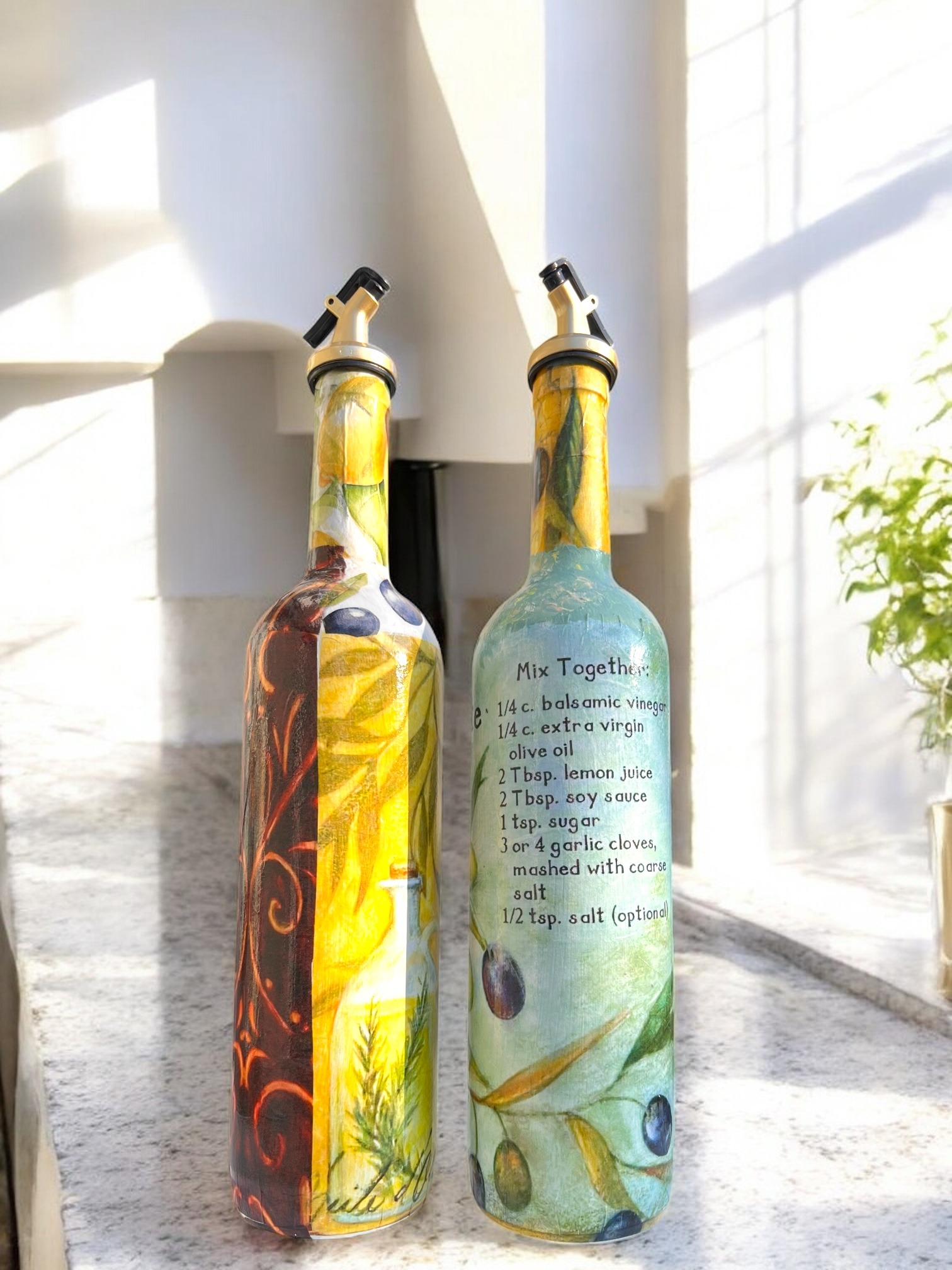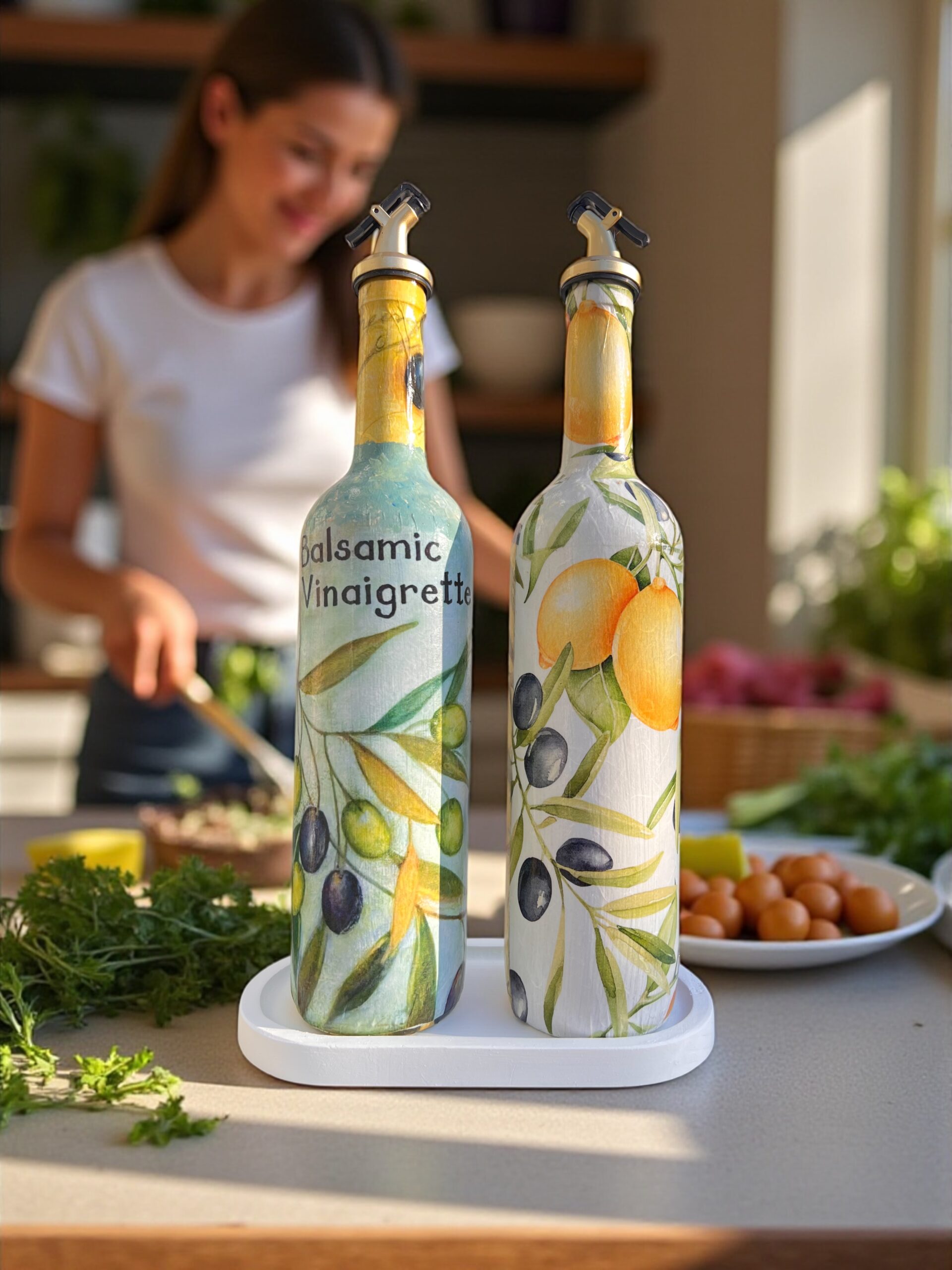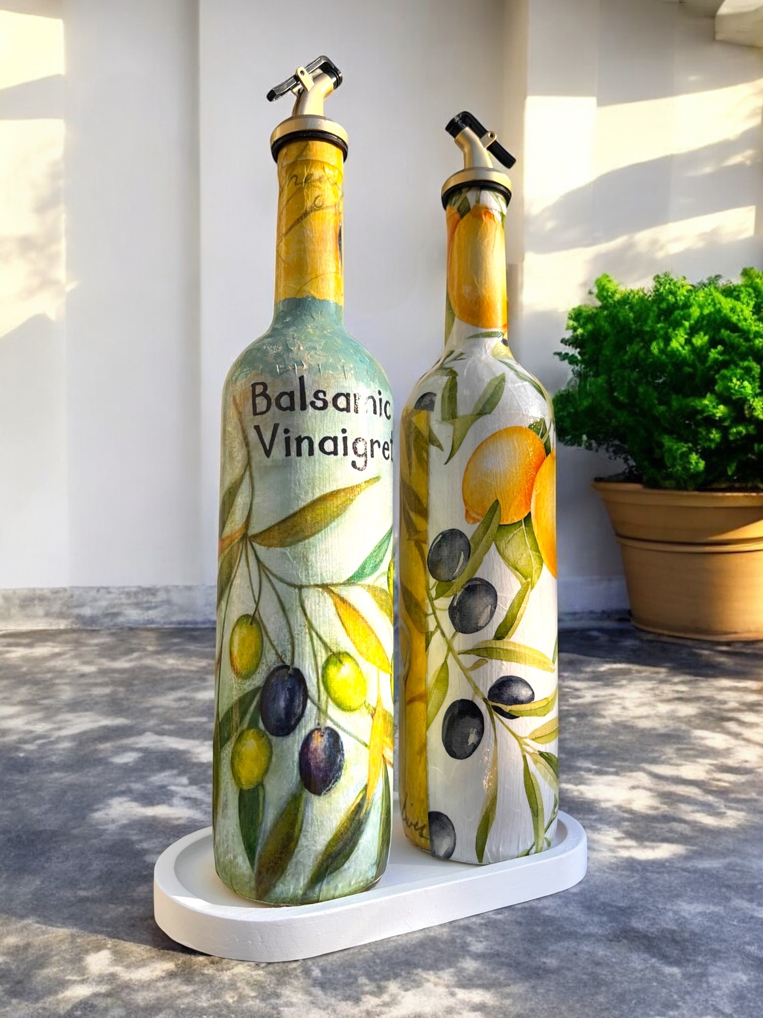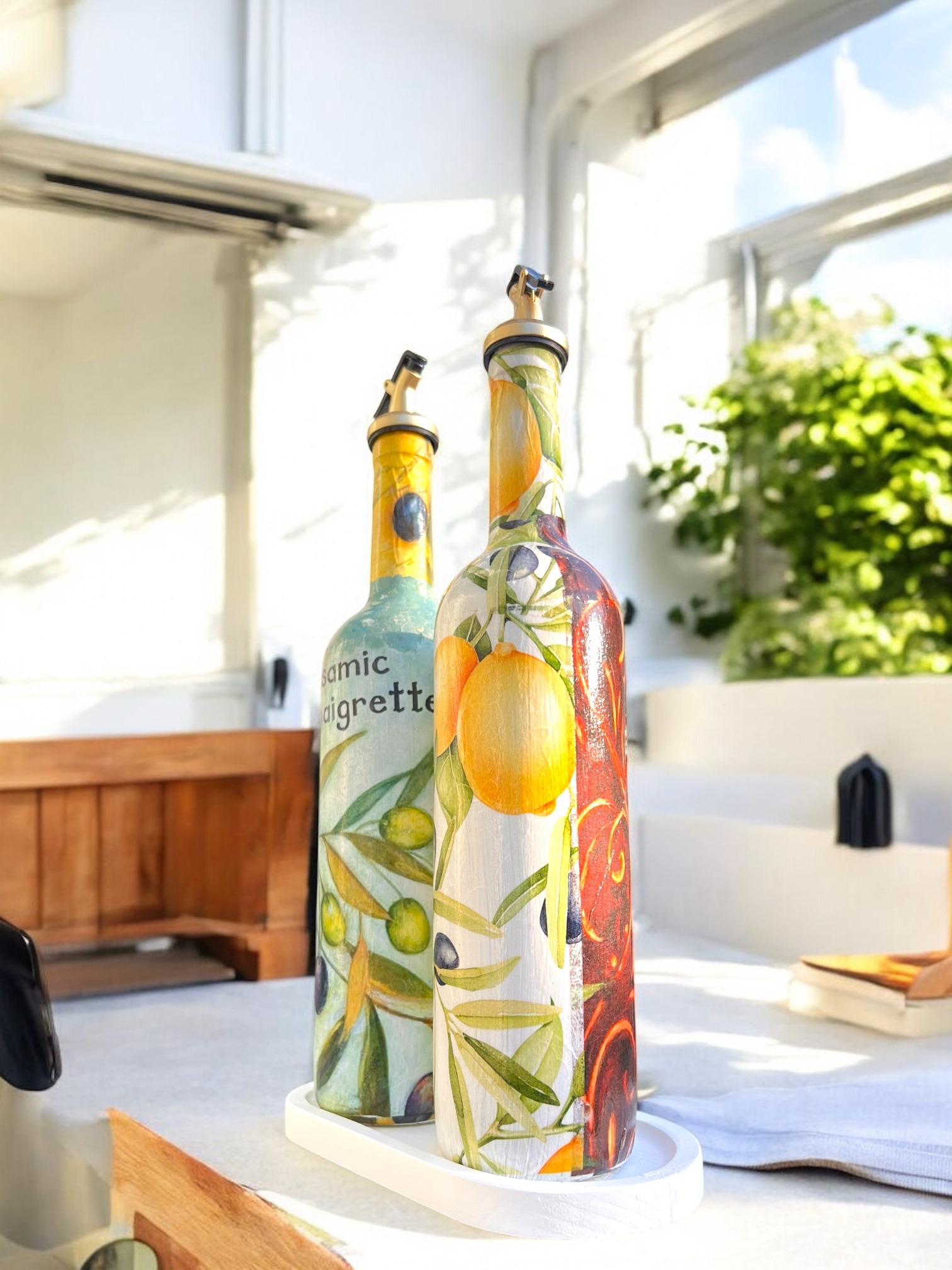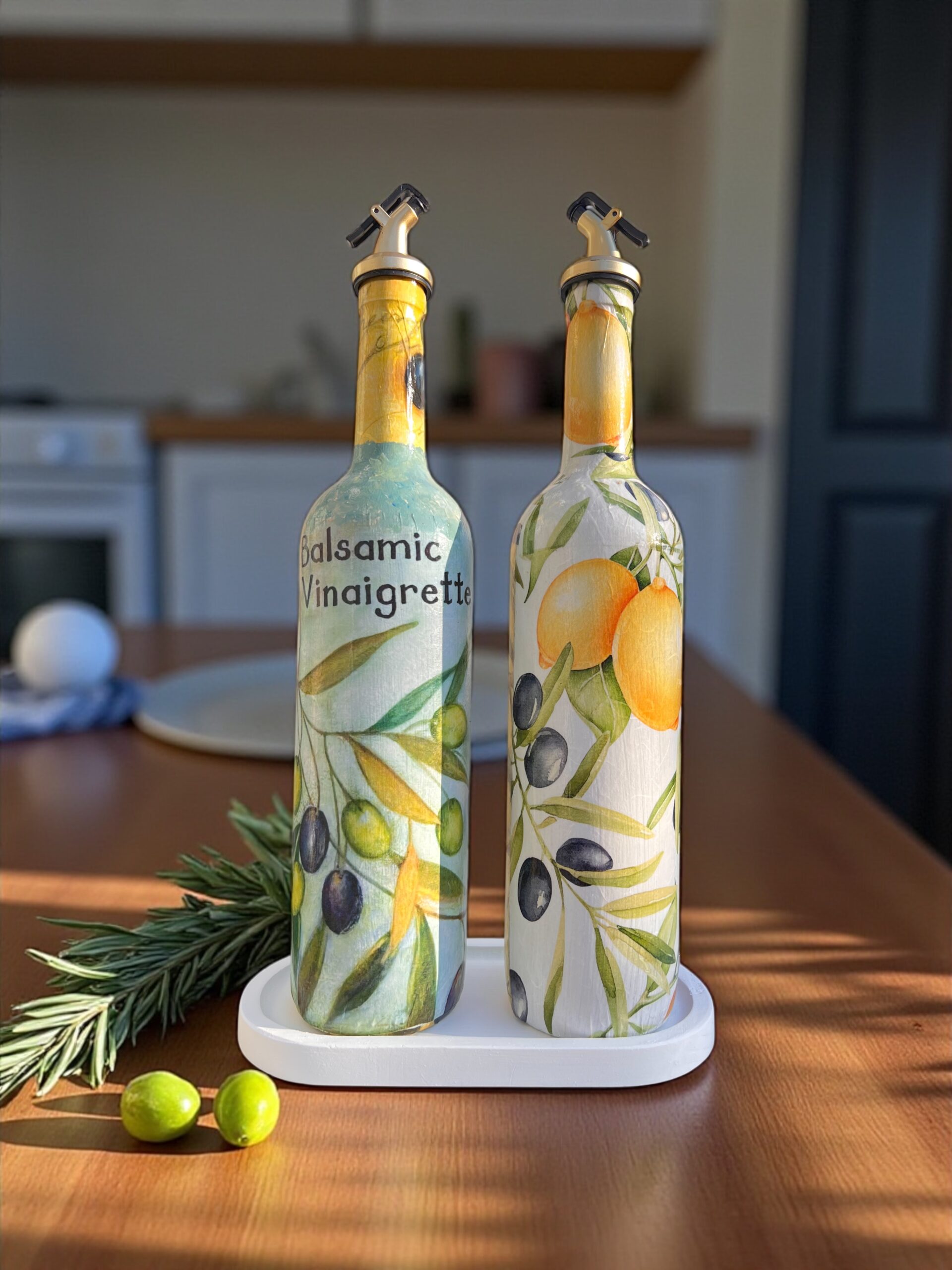 El Yapımı Limon ve Zeytin Desenli Yağdanlık Seti – Vintage Tarz Cam Şişe, Dekoratif Mutfak & Sofra Ürünü, El Boyaması Sosluk & Sirkelik