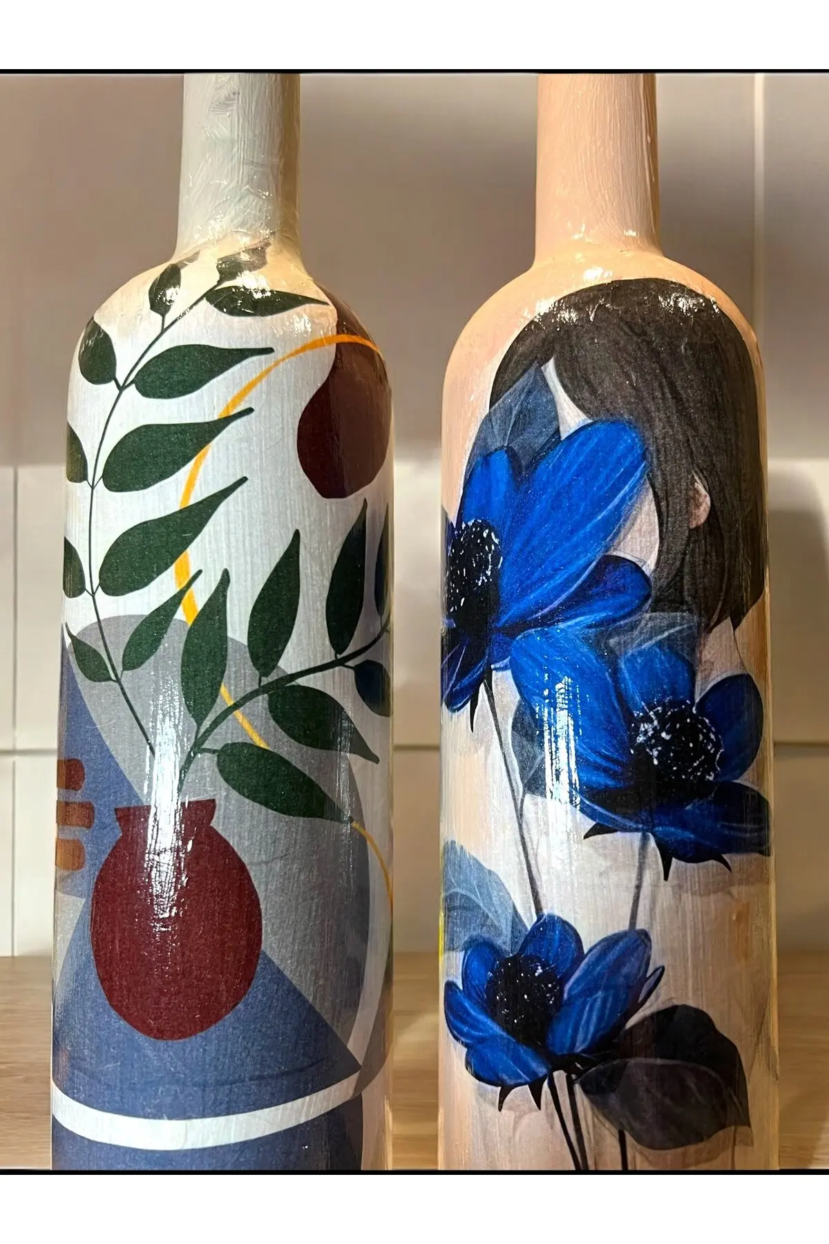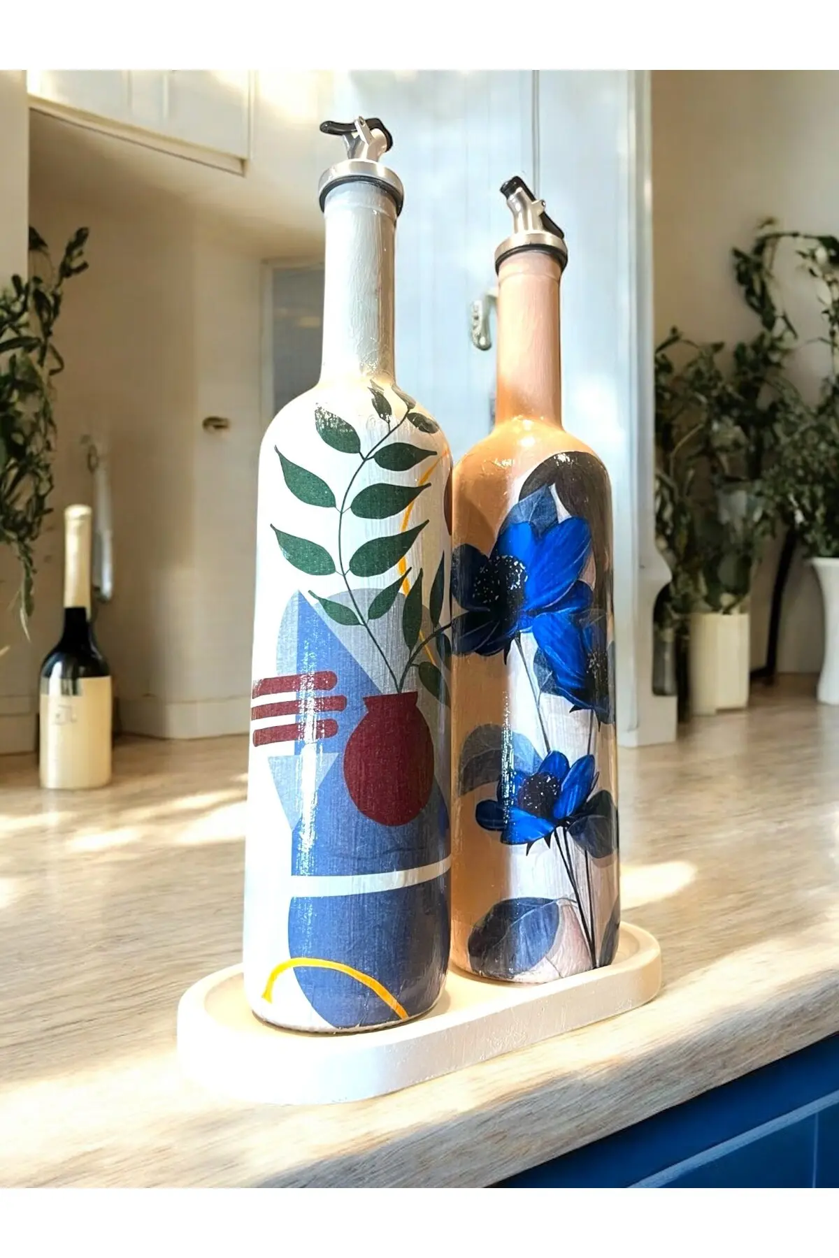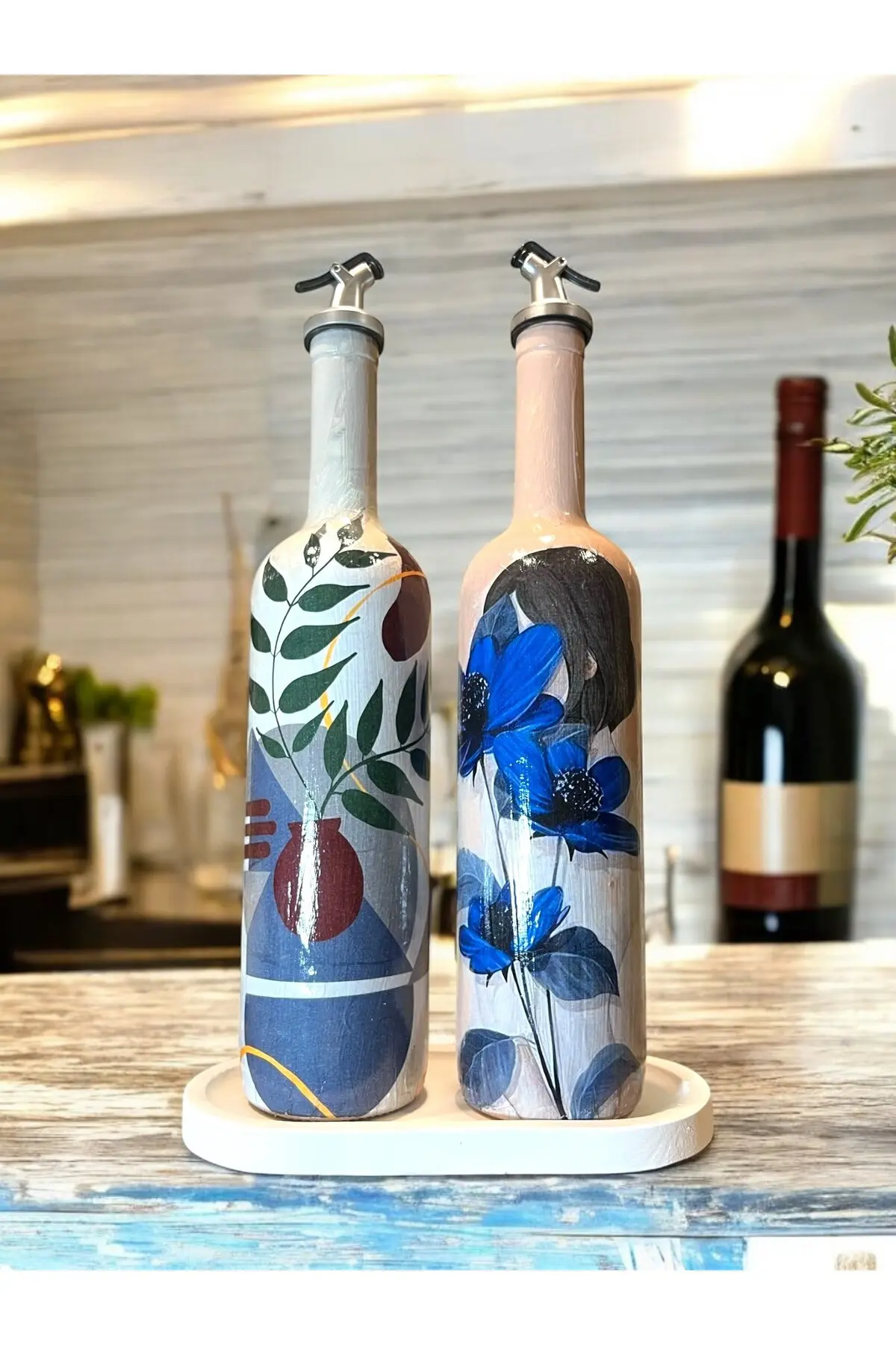 El yapımı Mavi Çiçekli Kız Desenli Sunum Stantlı 75 ml Zeytinyağı Sıvıyağ Şişesi Yağdanlık 2 li set