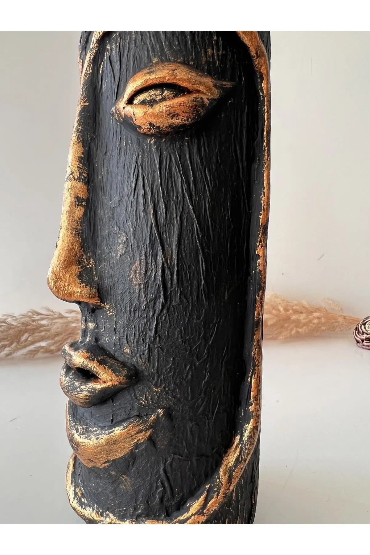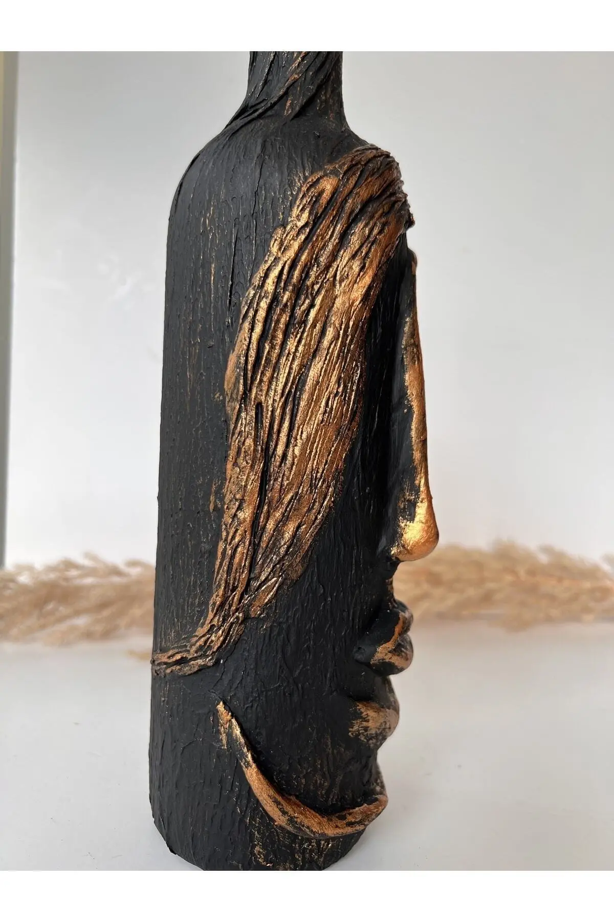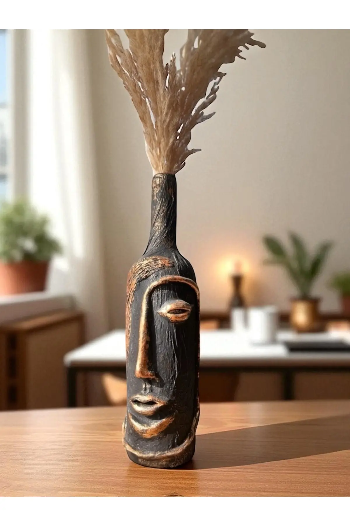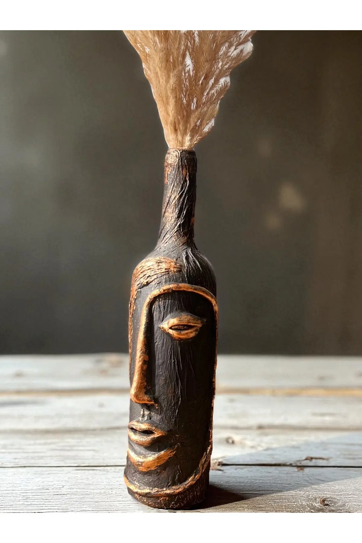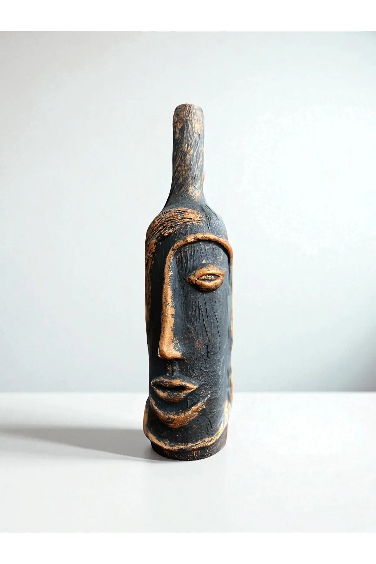 Özel tasarım şarap şişesi üzeri heykel yüz dekoru ile tasarlanmıştır ve dekor olarak kullanımda özel bir yere sahiptir. ; Tasarımın dış yüzeyine özel bir kabartma uygulanarak siyah ve varak kullanılmıştır. ; Salonunuzda, oturma odanızda, ofisinizde, bar ya da kafelerde (cafe) şık bir tasarım olarak dikkat çekecek özel bir parçadır. ; 3 Boyutlu Heykel yüz dekorlu şarap şişesi tamamen el yapımı olup, üzerinde bulunan kabartmaları orijinal el ürünüdür. ; 3D Soyut soyut tasarım şarap şişesi herhangi bir alana modern ve sihirli bir bir dokunuş katacağı kesin olan benzersiz ve gözalıcı bir parçadır, ayrıca kesinlikle dikkat çekici güzel bir soyut tasarıma sahiptir. ; Ev, otel, restoran, şarap evi dekorasyonu için mükemmel tasarımıdır. ; Hangi alanda kullanılırsa kullanılsın o alanın odak noktası olacak bir parçadır. ; Bu çarpıcı 3D Heykel Yüz dekorlu şarap şişesi, salonunuza, evinize, ofisinize hatta bir otel lobisine modern dokunuş eklemenin ve kendini ifade etmenin mükemmel bir yoludur. ; Siyak ve altın varakla özel görünümü olan bu parçanın mekanınıza kusursuz bir şekilde uyum sağlayacağından ve kişisel tarzınızı yansıtacağından emin olabilirsiniz. ; Ayrıca ürünümüz ev hediyesi, ofis hediyesi, kutlama hediyesi olarak da kullanılabilecek eşsiz bir tasarımdır. ; Kullanımı: kuru çiçek için vazo, mumluk ya da sadece dekor olarak kullanılabilir. ; Ürünün temizliğinin Hafif nemli bir bez ile yüksek kuvvet uygulanmadan yapılmasını tavsiye ederiz. ; şarap şişesi insan yüz heykel kabartması;