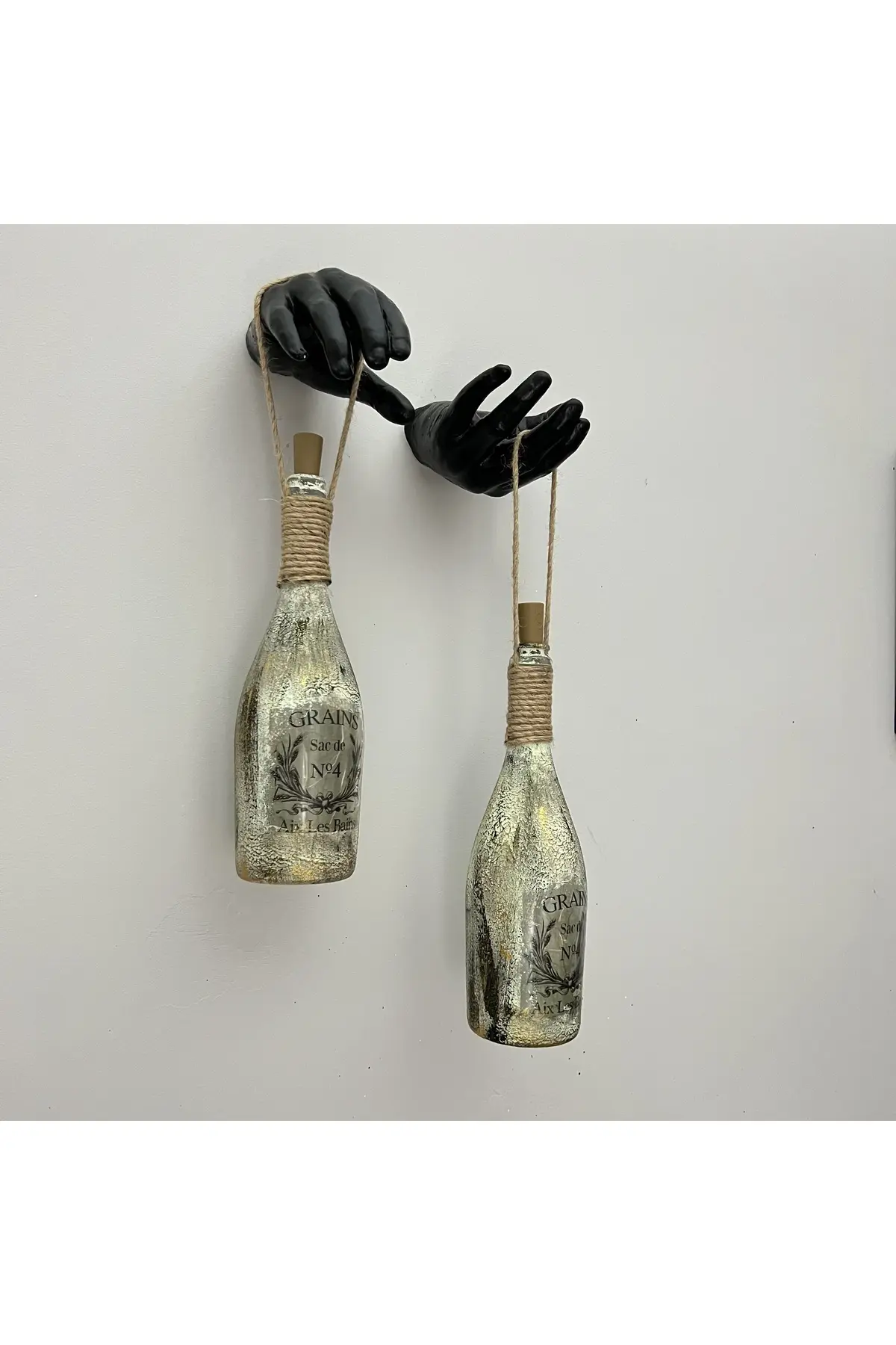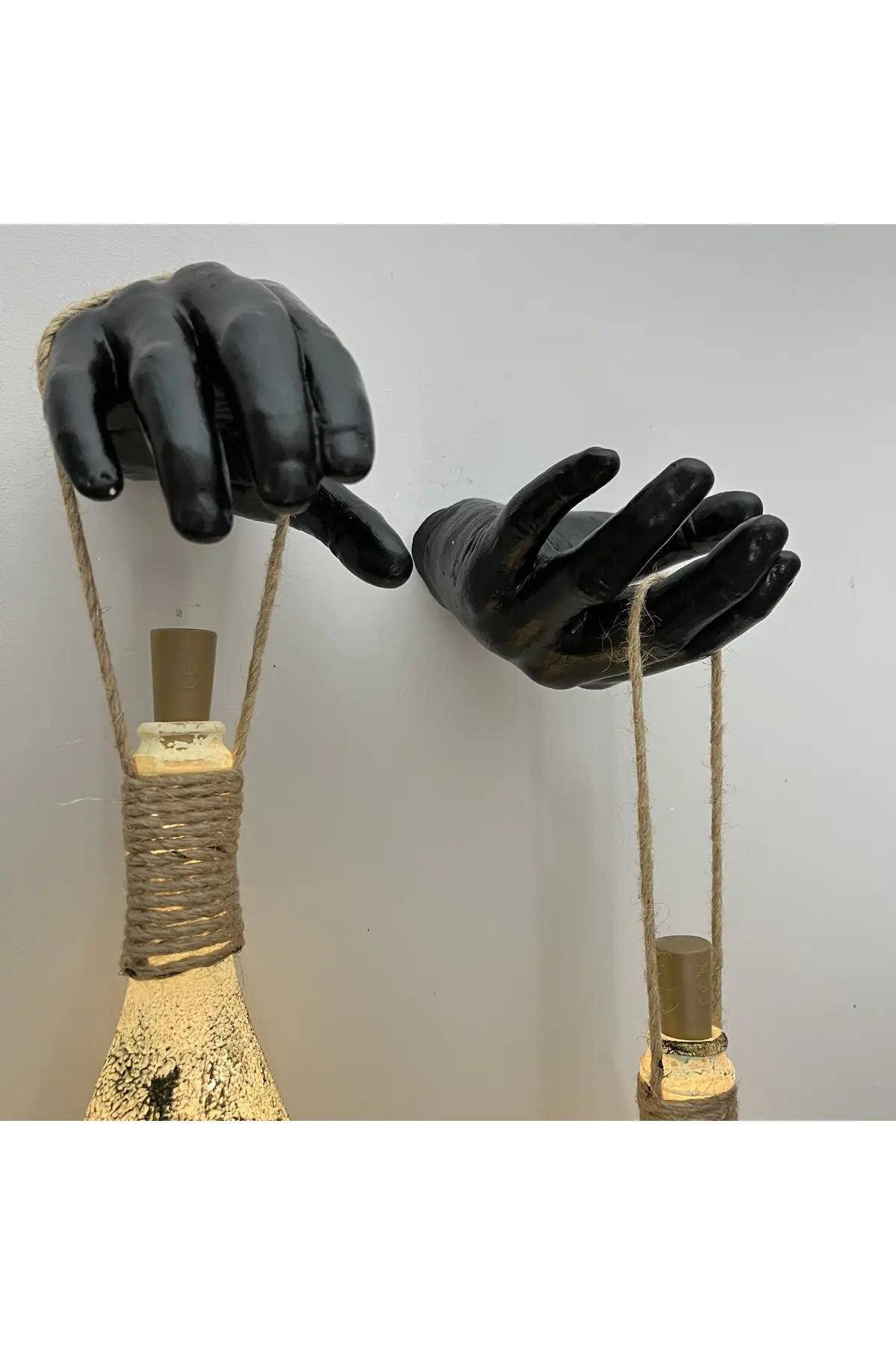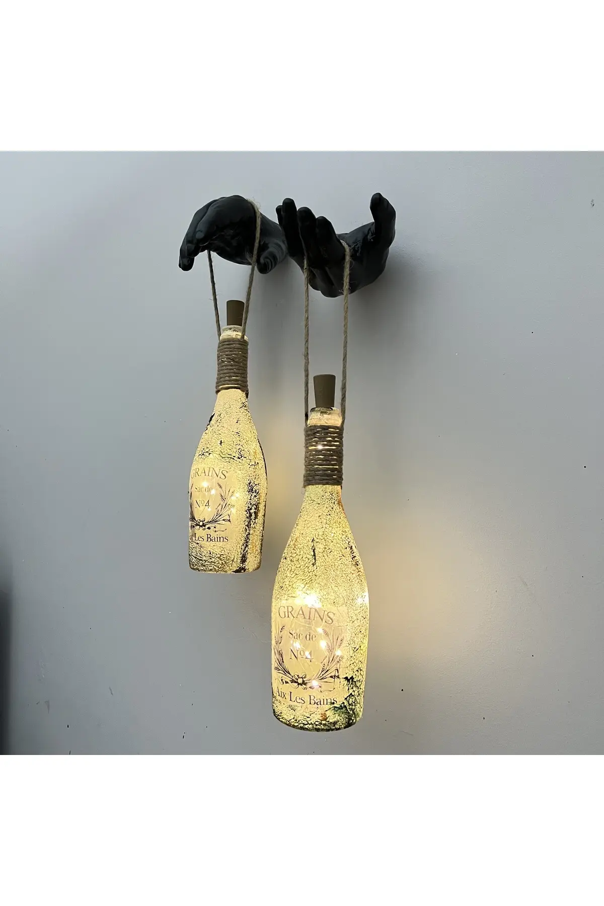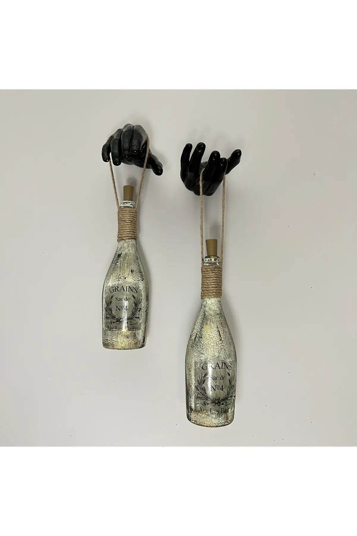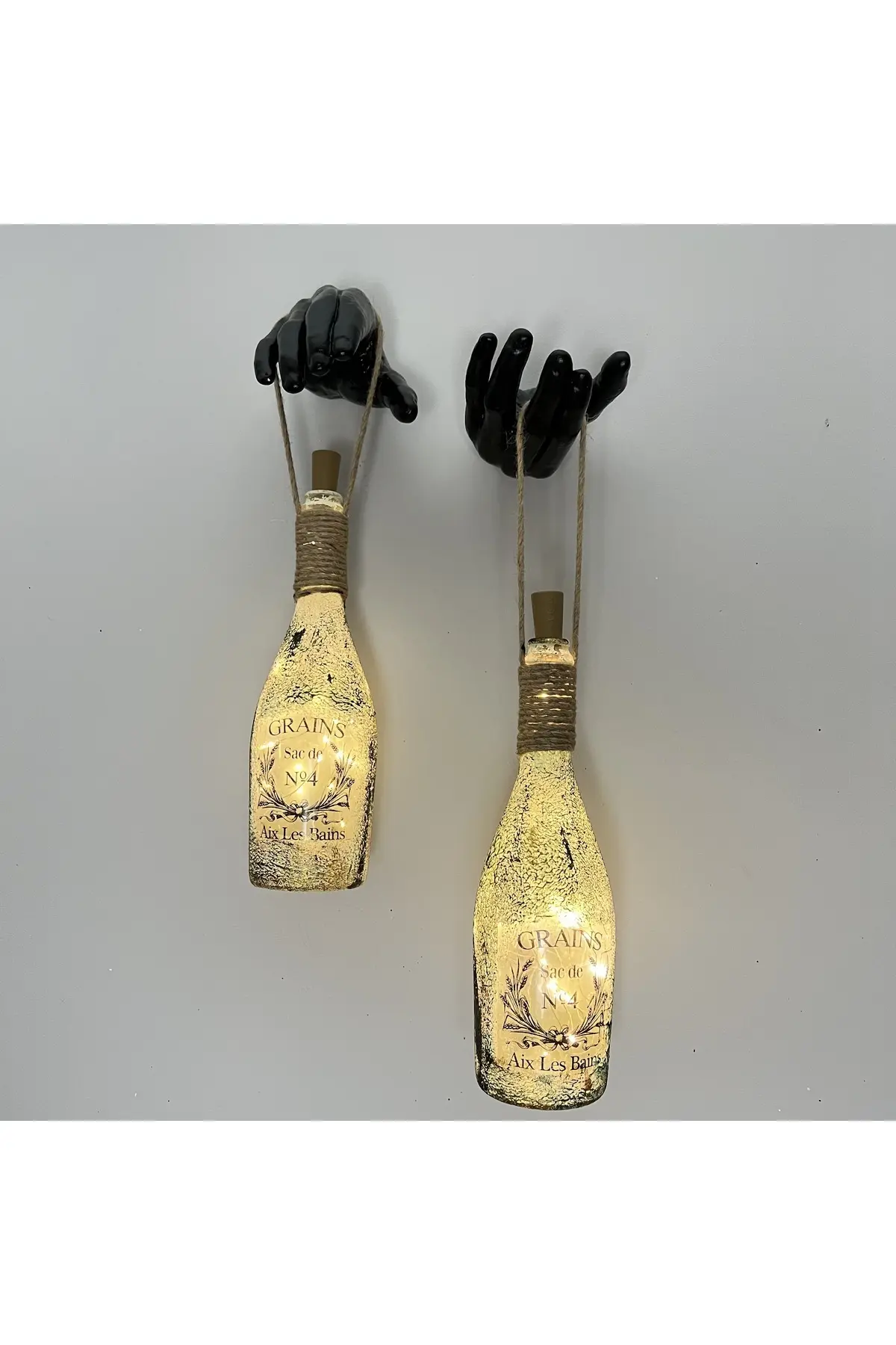 El Yapımı Siyah Erkek Eli Heykeli Dekorlu Peri Led Işıklı Buzlu Cam Şampanya Şişesi Aplik 2’li Set