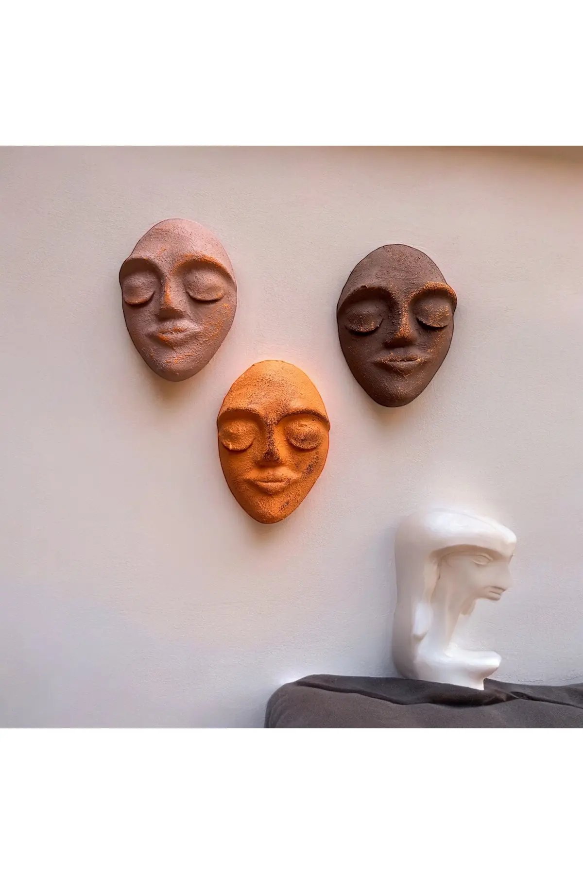 El Yapımı Yüz Heykeli Taş Duvar Dekoru 3’li Set, Modern Tasarım, Eskitme Taş Görünümlü Duvar Mask