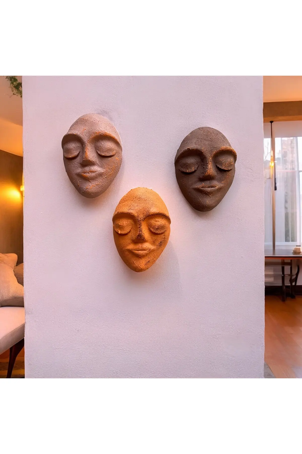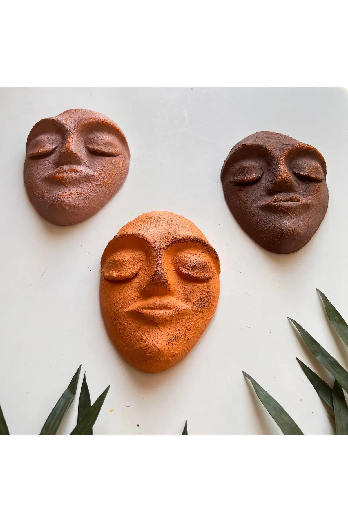 Duvar dekoru olan bu 3 lü set Maskeler, iç dekorasyonuna cesur bir ifade vermek isteyen herkes için idealdir. ; Antik zeugma renkleri üzerine yine taş eskitme uygulanmış olan yüzler, onlara egzotik ve gizemli bir görünüm kazandıran ayrıntılara sahiptir. ; Duvarlarınızı güzelleştirmek için pratik ve şık bir dekorasyon arıyorsanız Duvara Asılan bu duvar dekoru Maskeler(Duvar Maskları) tam size göre. ; Bu güzel taş duvar dekoru parçaları, herhangi bir oturma odası veya yatak odasında bir odak noktası oluşturmak için mükemmeldir. ; Olağanüstü bir renk paleti ve formuyla, odaya bunaltıcı olmadan çağdaş bir his verir. ; Sıcaklık ve çekicilik hissi veren ve dekorunuza harika bir karakter dokunuşu katan ilginç bir parçadır. ; Şık tarzınızı gururla sergileyebilirsiniz. ; Soyut şekiller ve şık çizgiler, gelecek yıllar boyunca dikkatleri üzerine çekecek benzersiz ve büyüleyici bir parçadır. ; Herhangi bir modern eve doğru miktarda görsel eklemek ve sade ama göz alıcı tasarımıyla cesur bir ifade vermek için mükemmel bir tasarımdır. ; Özel tasarım olan bu Maskeler üzerine uygulanan boyama şekli antik zeugma renkleri kullanılarak yapılmıştır. ; Ürünün duvara kolayca sabitlenebilmesi için duvar çivilerine uygun asma delikleri açılmıştır ve bu ürünün çivileri paket içerisinde gönderilmektedir. ; Ürünü istediğiniz mesafede şekillendirerek kendi kombin duvar dekorunuzu oluşturabilirsiniz. ; Bir maskenin ölçüsü 21*17 cm’dir. ; Ofisinize, bahçenize, Salonunuza, koridorlarınıza ve evinizin tüm alanlarına şıklık katacak olan Ürünümüz tamamen kendi tasarım ve imalatımızdır. ; Ev hediyesi, yeni yıl hediyesi ve doğum günü hediyesi olarak da kullanabilirsiniz.;