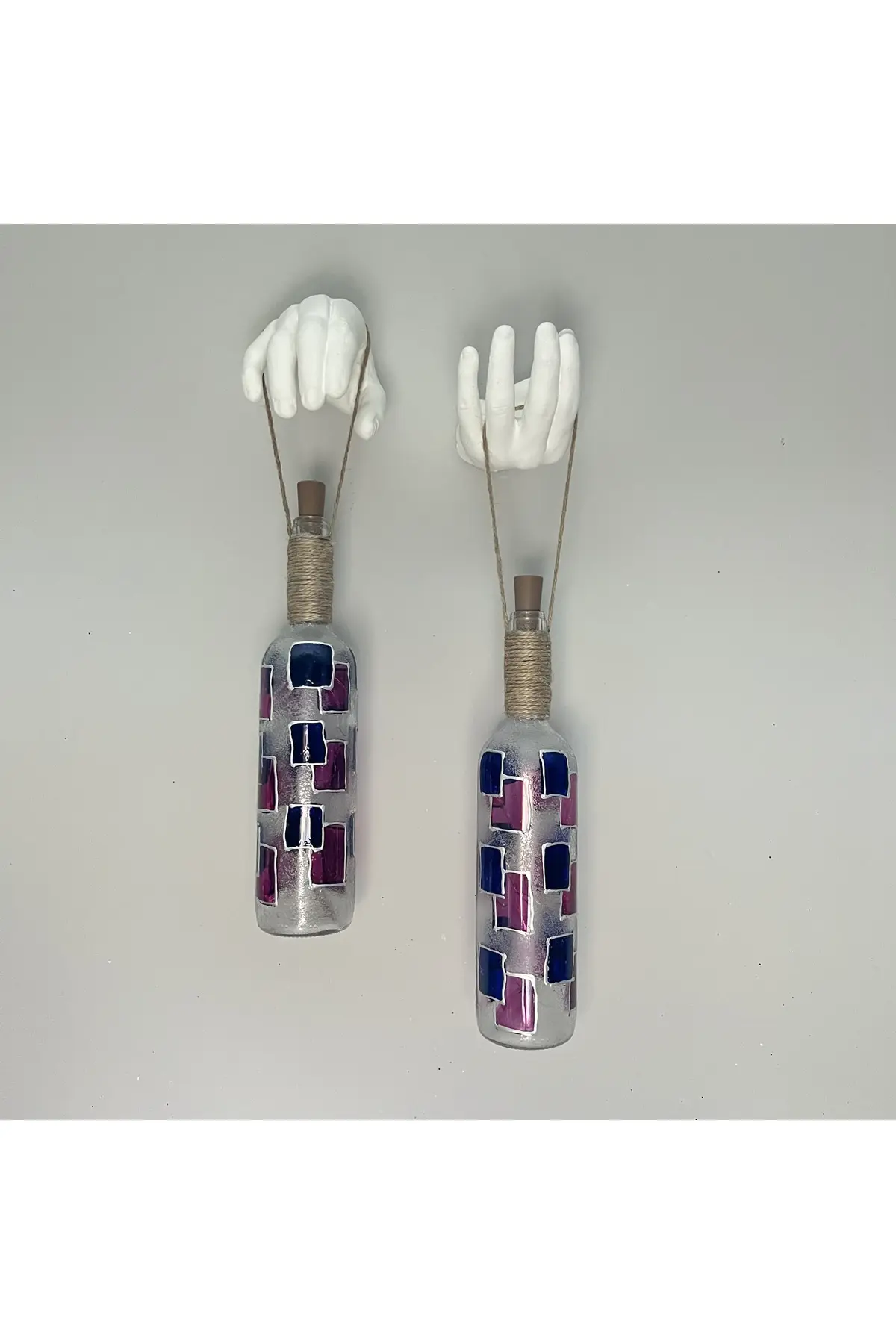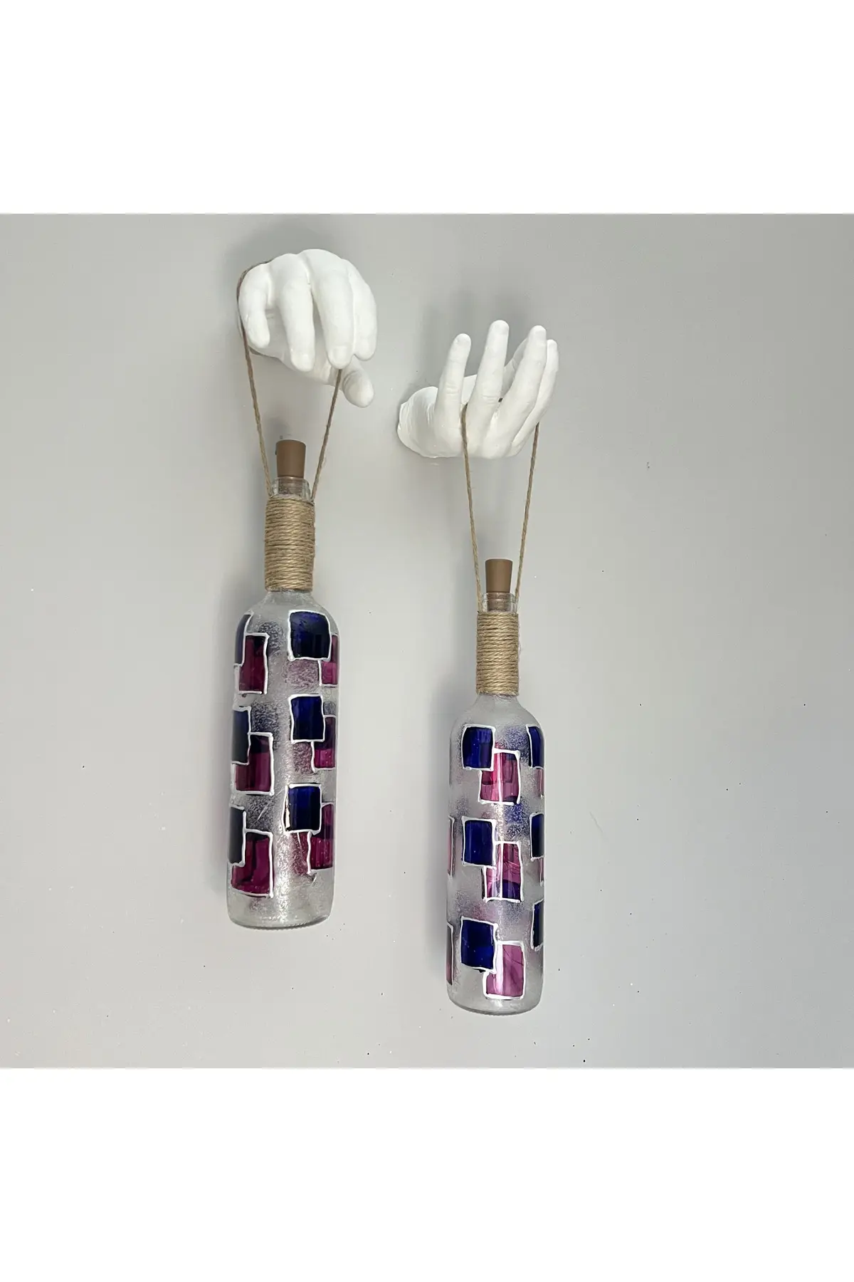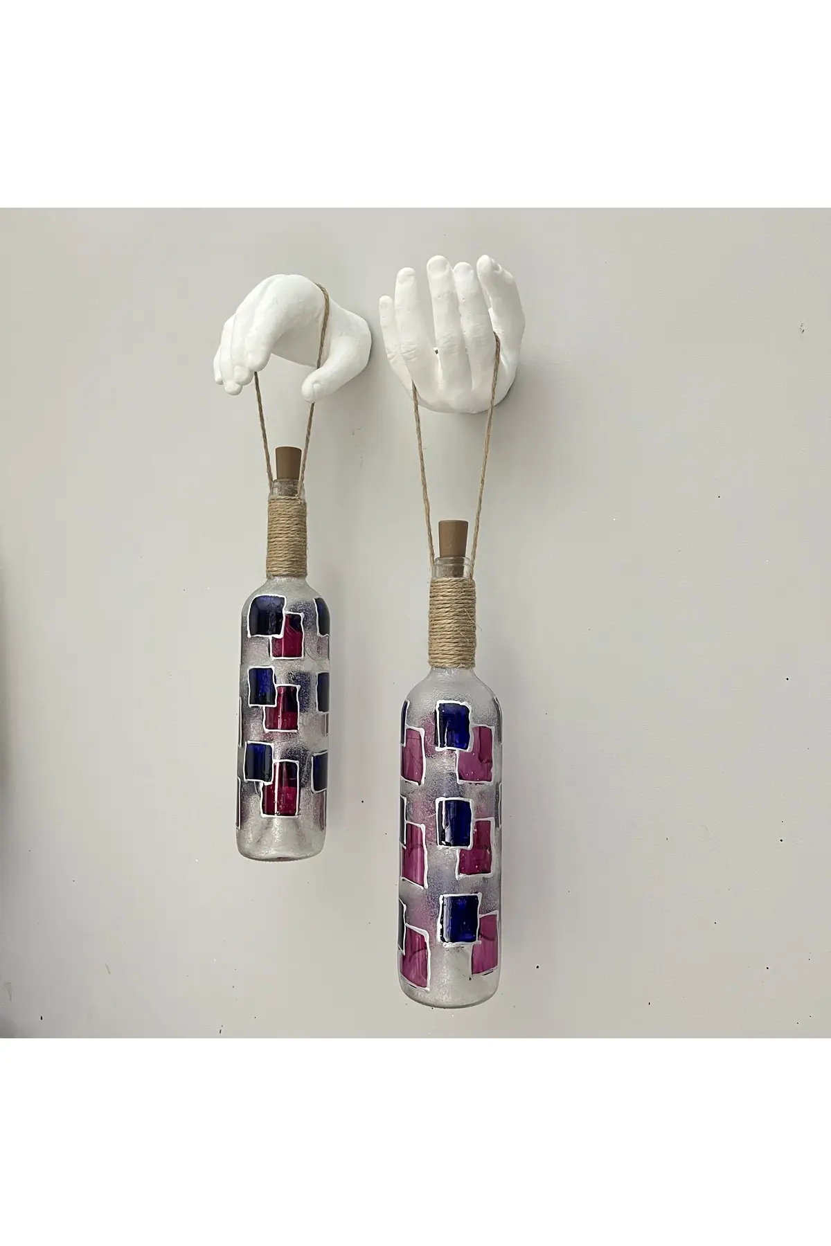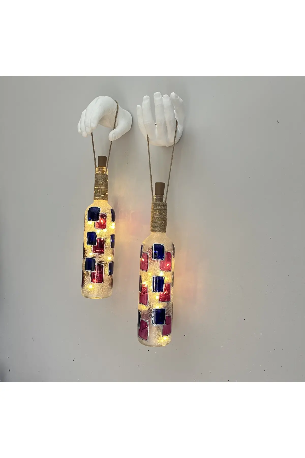 Erkek El Heykeli Dekorlu Lacivert Kırmızı Vitray Şarap Şişesi 2’li Pilli Aplik Set, Duvar Dekor