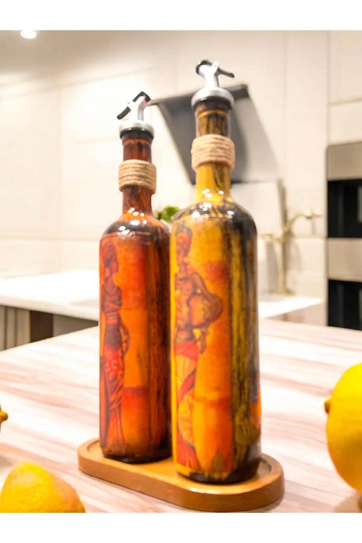 Mutfaklar, lezzetin ve sanatın buluşma noktalarıdır. ; Özel tasarım Afrika Kadın figürlü yağdanlık setimiz, mutfaklarınıza sadece işlevsellik değil, aynı zamanda sanatsal bir dokunuş da katıyor. ; Bu 2’li set, özel el işi boyamaları ve yıkanma işlemine uygun olan sırlamaları ile dikkat çekiyor. ; Yağdan ve sudan etkilenmeyen özel tasarımımız, mutfaklarınıza doğanın zarif güzelliğini taşıyor. ; Ürün Özellikleri: El İşi Boyamalar: Afrika Kadın figürleri, ustalar tarafından özenle el işi ile boyanmıştır. ; Her detay özenle işlenmiş ve ürünlerimiz sanat ile mutfakta buluşuyor. ; Dayanıklı Malzeme: Yağdanlık şişelerimiz 750 ml kapasitesinde olup, özel tasarım el boyaması ile süslenmiştir. ; Yağdan ve sudan etkilenmeyen malzemeden üretilmiştir. ; Damlatmaz Başlık: Setimizde yer alan damlatmaz yağdanlık başlıkları sayesinde yağları dökmeden, doğrudan yemeğinizin üzerine ekleyebilirsiniz. ; Çok Amaçlı Sunum Tepsisi: Ahşap kayın rengi sunum tepsisi, setimizin şıklığını tamamlar. ; Oval tasarımı ile hem görsel bir zenginlik sunar hem de pratik bir kullanım sağlar. ; Kolay Temizlik: El işi boyamaları ve özel sırlamaları sayesinde temizliği oldukça kolaydır. ; Ancak yıkama işlemi sırasında tel ve telli süngerler kullanılmaması tavsiye edilir. ; Dekoratif ve Fonksiyonel: Bu özel tasarım Afrika Kadın figürlü yağdanlık seti, sadece bir mutfak gereci değil, aynı zamanda etkileyici bir dekoratif obje olarak da öne çıkıyor. ; Mutfak tezgahınızı şıklıkla süslerken, yemeklerinize de estetik bir dokunuş katar. ; Mutfakta şıklığı ve sanatı bir araya getiren bu özel tasarım yağdanlık seti, hem görsel açıdan etkileyici bir atmosfer yaratmak isteyenler hem de pratik ve dayanıklı mutfak gereçleri arayanlar için ideal bir tercih. ; Estetik detaylarıyla göz dolduran bu set, mutfaklarınızı sanat galerisine dönüştürecek. ; Eşsiz Afrika Kadın Figürlü Yağdanlık Seti ile mutfak deneyiminizi yeniden şekillendirin. ; Hemen sipariş verin ve mutfağınıza sanatın dokunuşunu katın.;