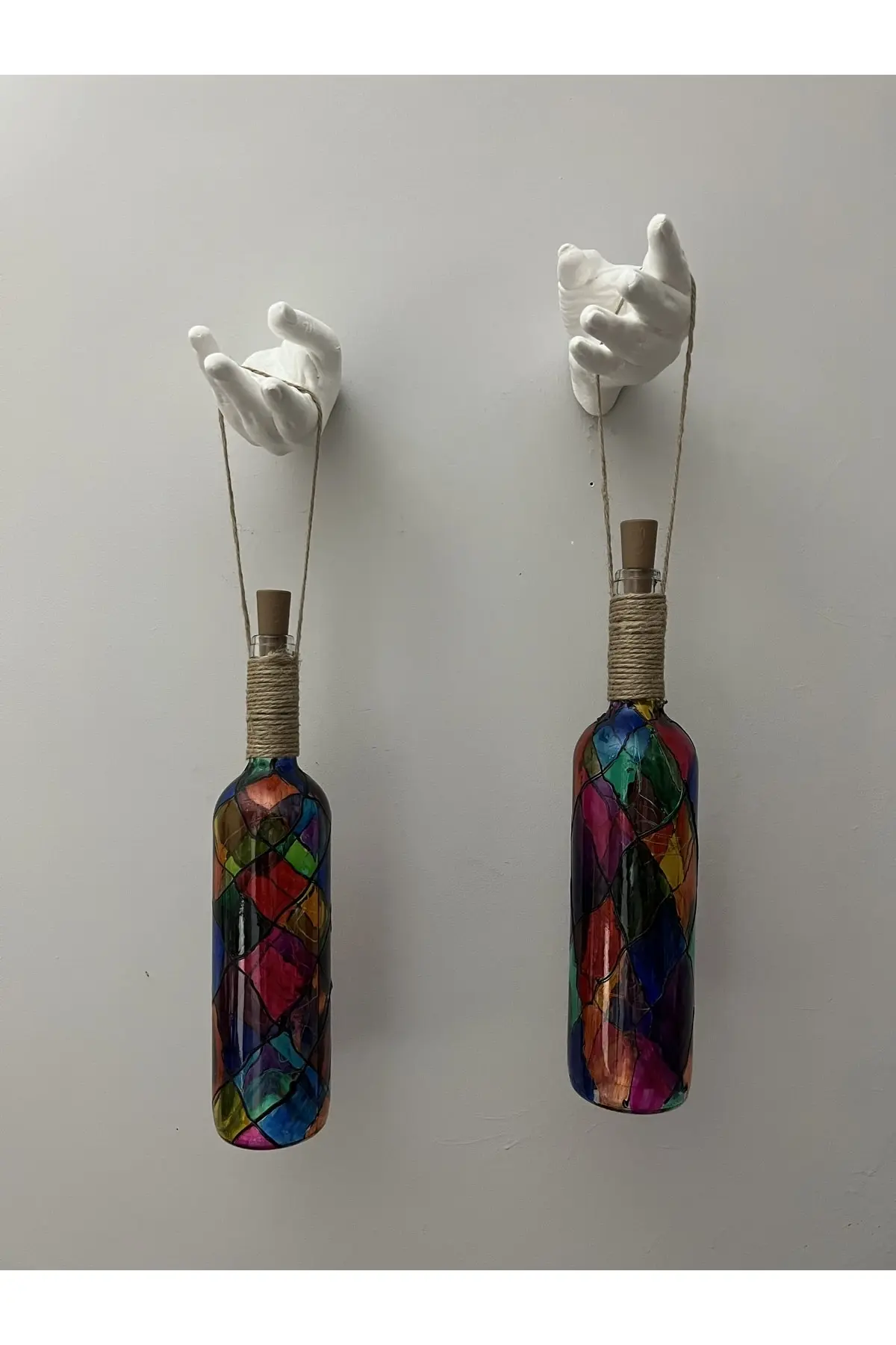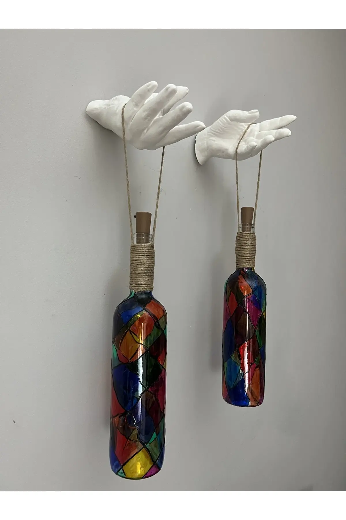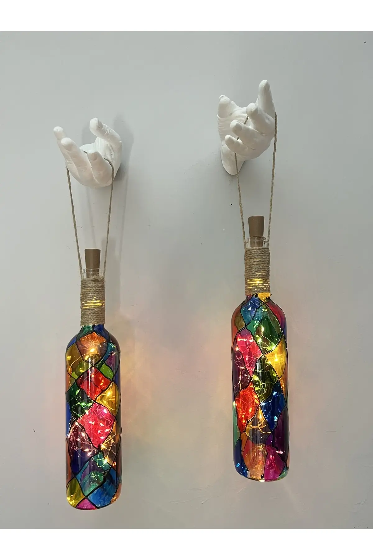 Kadın El Heykeli Led Işıklı Renkli Vitray Cam Şarap Şişesi Aplik Set Cafe, Bar, Bahçe, Ev Dekoru