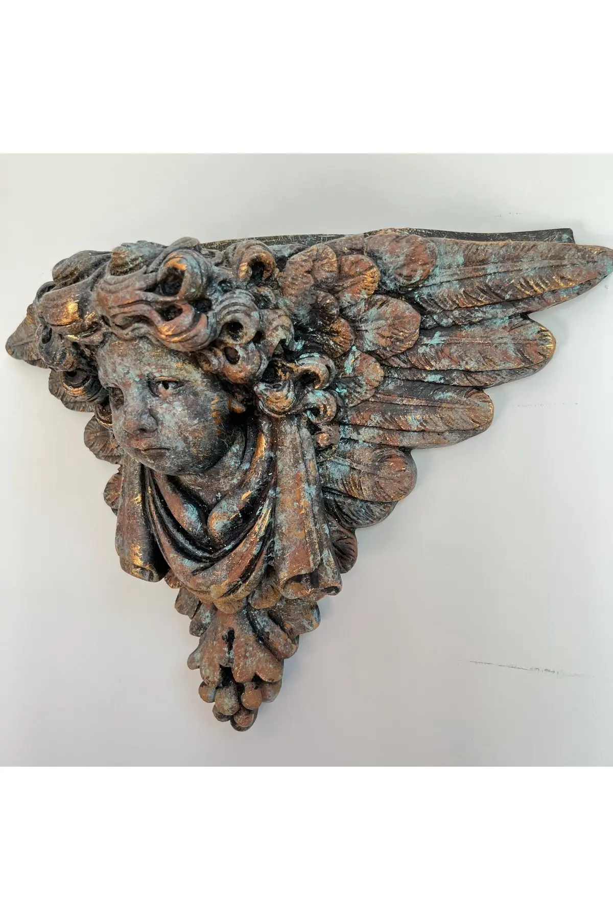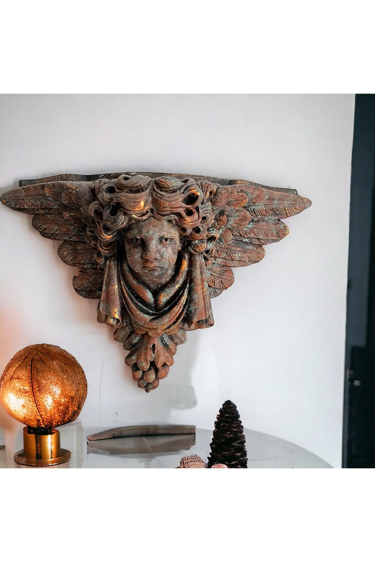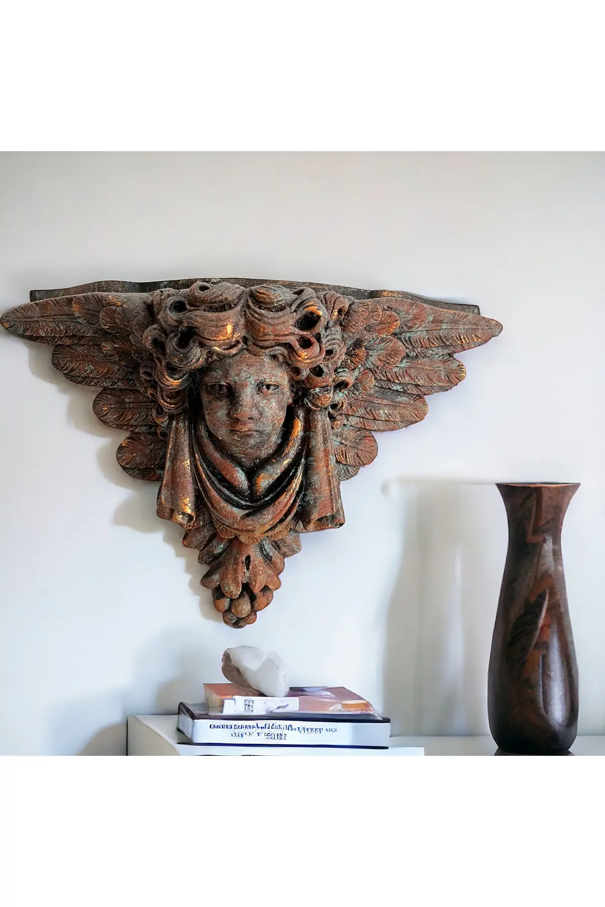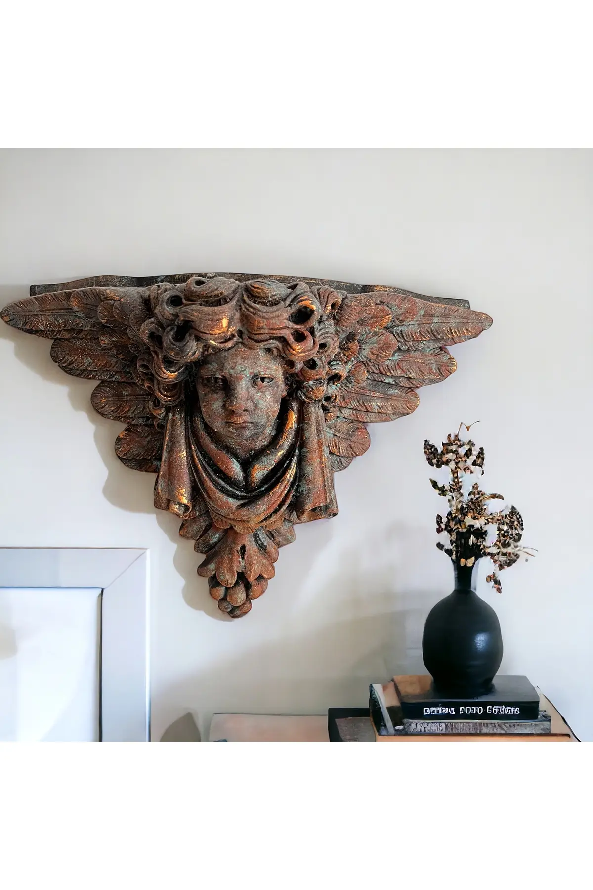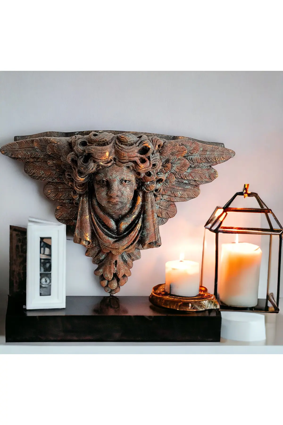 Evinizin ya da ofisinizin duvarlarını büyüleyici bir sanat eseriyle süslemek istiyorsanız bronz görünümlü, Doğal pas görünümlü eskitmeli boya uygulamalı kanatlı melek heykeli taş duvar dekoru sizin için mükemmel bir seçim olabilir. ; Bu eşsiz tasarım hem sanatsal ifade hem de estetik güzellik sunuyor. ; Bu özel tasarım, meleklerin sembolik güzelliğini ve koruyucu enerjilerini evinize veya çalışma alanınıza taşıyor. ; El yapımı bu parça, taş duvarınıza muhteşem bir dokunuş katmak için titizlikle hazırlanmış ve özenle boyanmıştır. ; Eskitme pas fekti tekniği, melek heykelindeki her detayın özel ve zarif bir şekilde vurgulanmasını sağlar. ; Gerçek bronza benzemekle birlikte dayanıklılığını ve uzun ömürlülüğünü korur. ; Kanatlı melek figürü hem estetik çekicilik hem de manevi önem taşımaktadır. ; Evinizin veya ofisinizin herhangi bir köşesine asarak hem meleğin huzur veren enerjisini hem de şık tasarımını sergileyebilirsiniz. ; Duvarınızı mükemmel bir şekilde tamamlar ve hem modern hem de klasik iç tasarımlarla uyum sağlayarak evinize veya ofisinize sofistike bir dokunuş katar. ; Pas efekt eskitme boya uygulanmış bronz görünümlü bu kanatlı melek heykeli taş duvar dekoru hem sanat meraklıları hem de iç dekorasyon meraklıları için bir hazinedir. ; Evinizin veya ofisinizin duvarlarını dönüştürmek ve meleğin koruyucu güzelliğini deneyimlemek için bu heykeli seçin. ; Ürün el yapımı olup kaliteli malzemelerden üretilmiştir. ; Boyutları yaklaşık 40cm x 50cm x 20cm olup çeşitli duvar yapılarına uyacak şekilde tasarlanmıştır.;