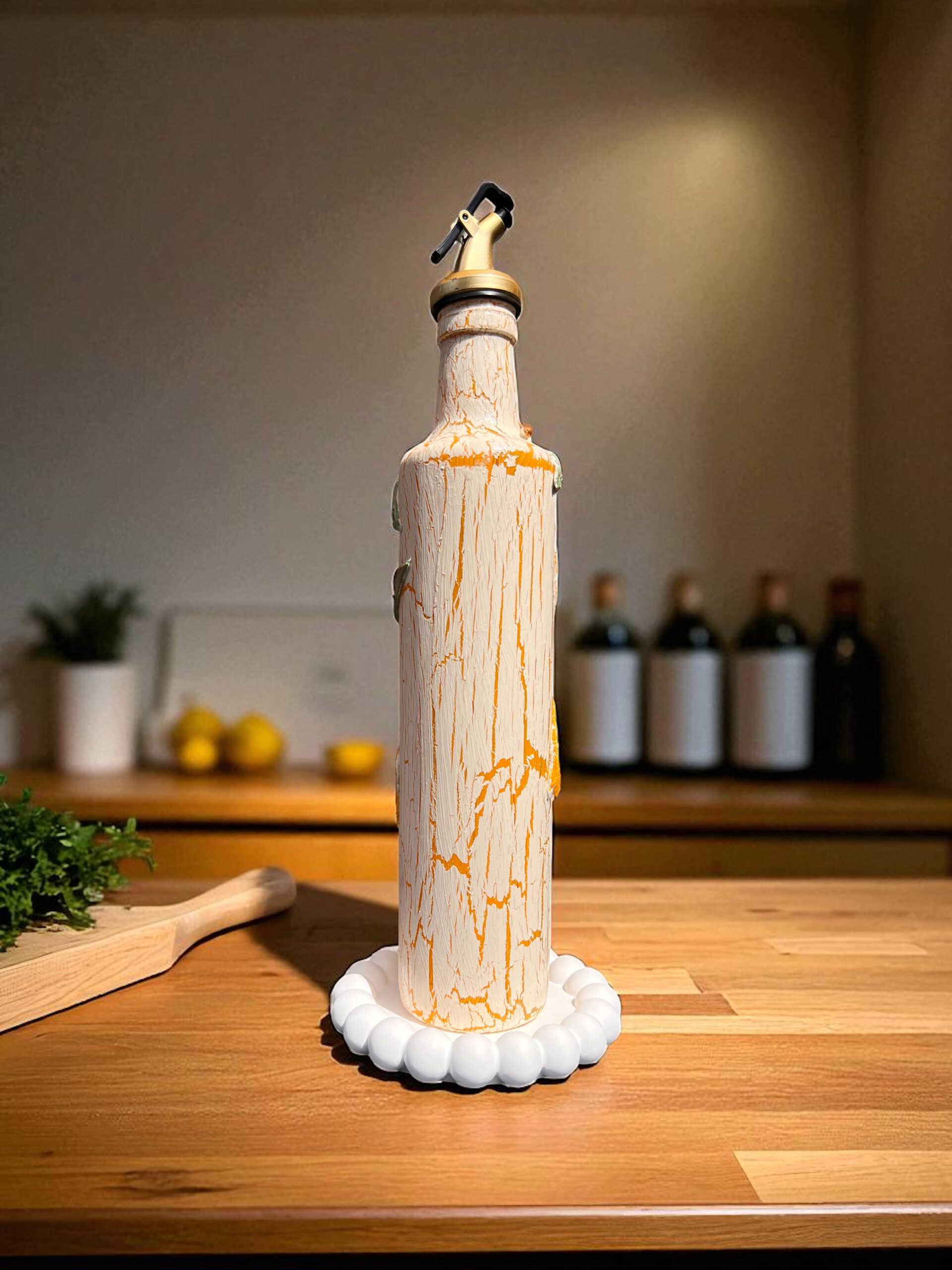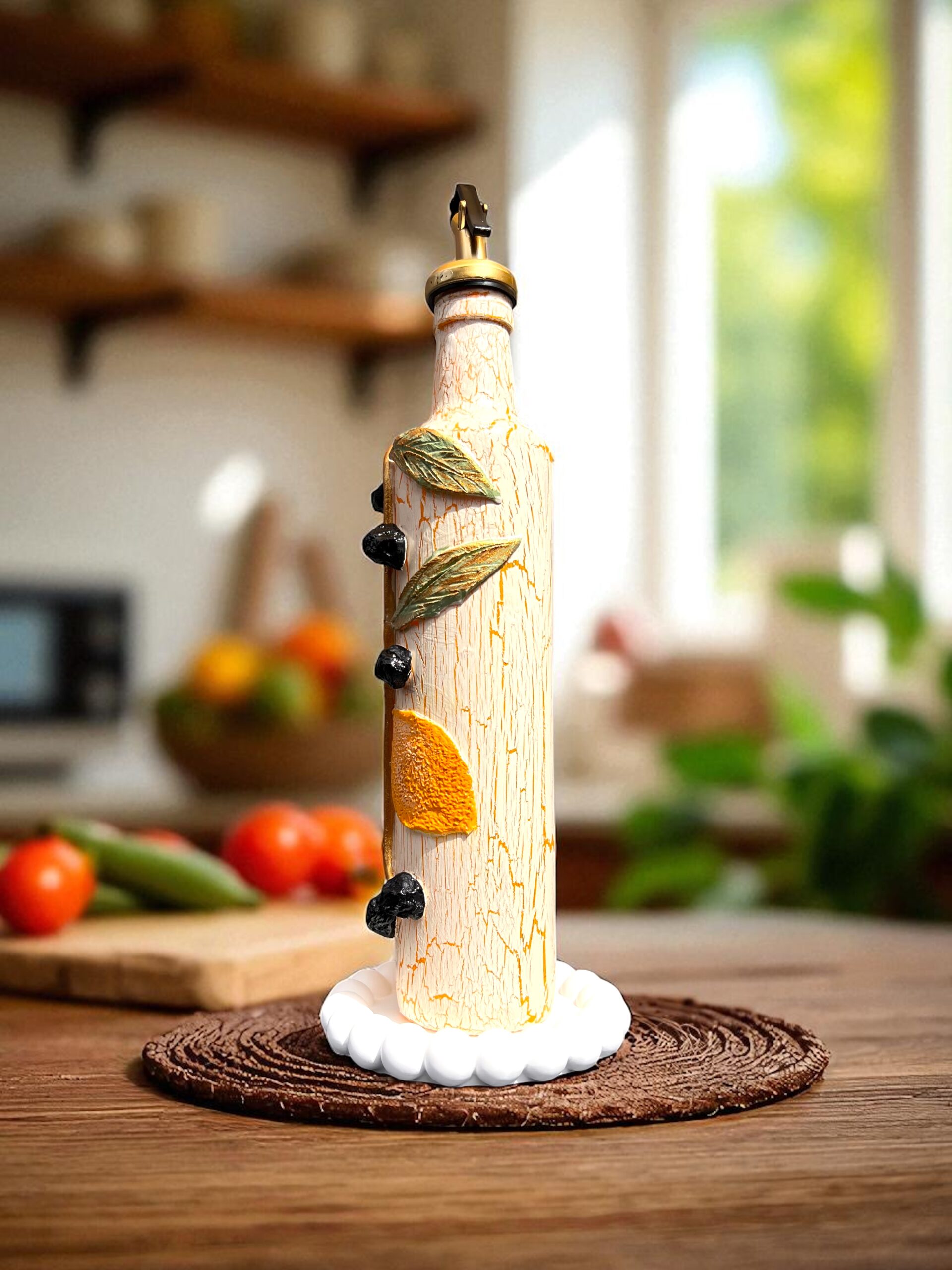 Masalarınıza sanatsal bir dokunuş katın! Bu el boyaması yağ & sirke şişesi seti, özel çatlatma tekniği ve kil kabartma detaylarıyla hazırlanmıştır. Üzerinde özenle işlenmiş limon ve zeytin motifleri bulunur. Boyamada kullanılan altın varak dokunuşları, şişelere sofistike bir ışıltı katar.