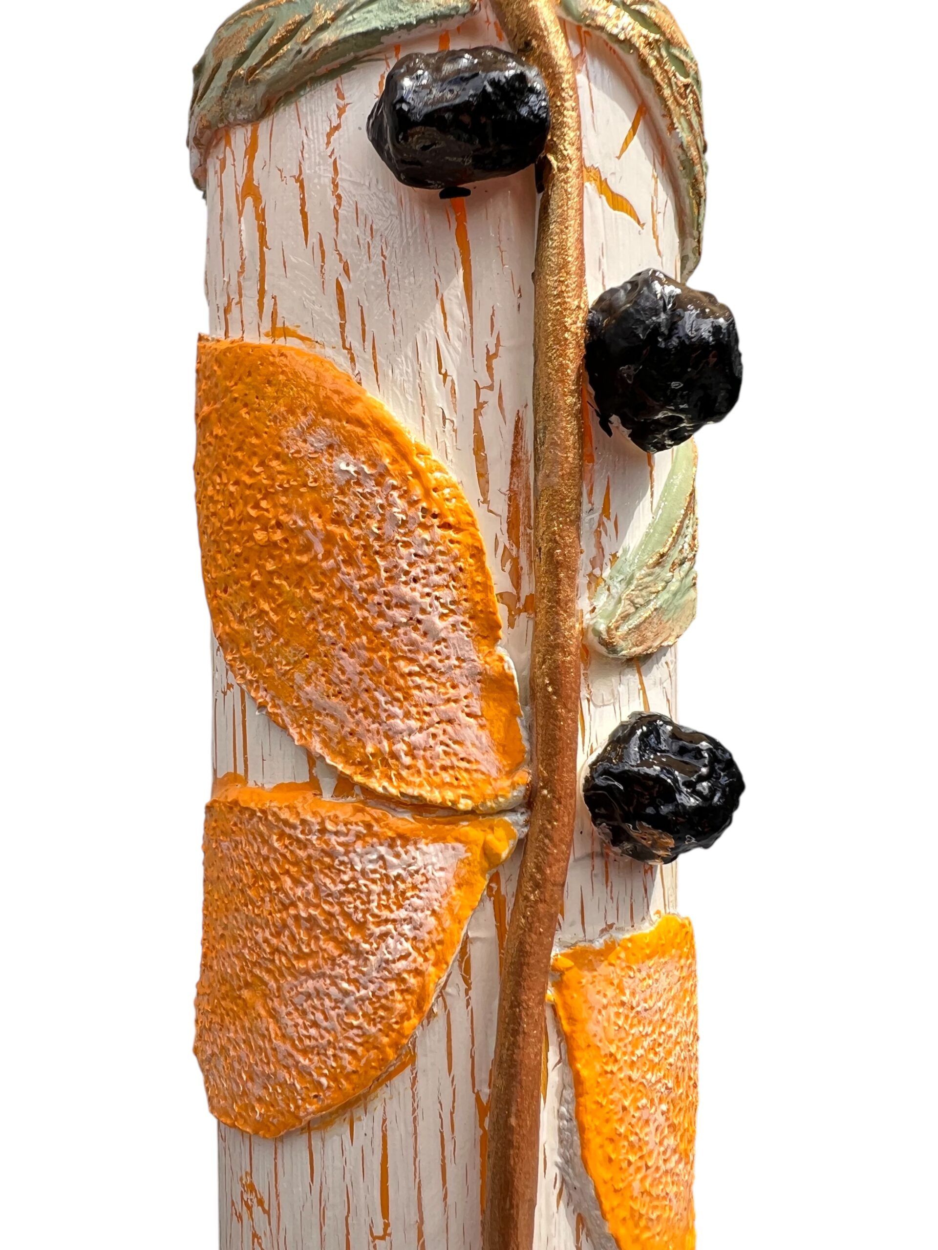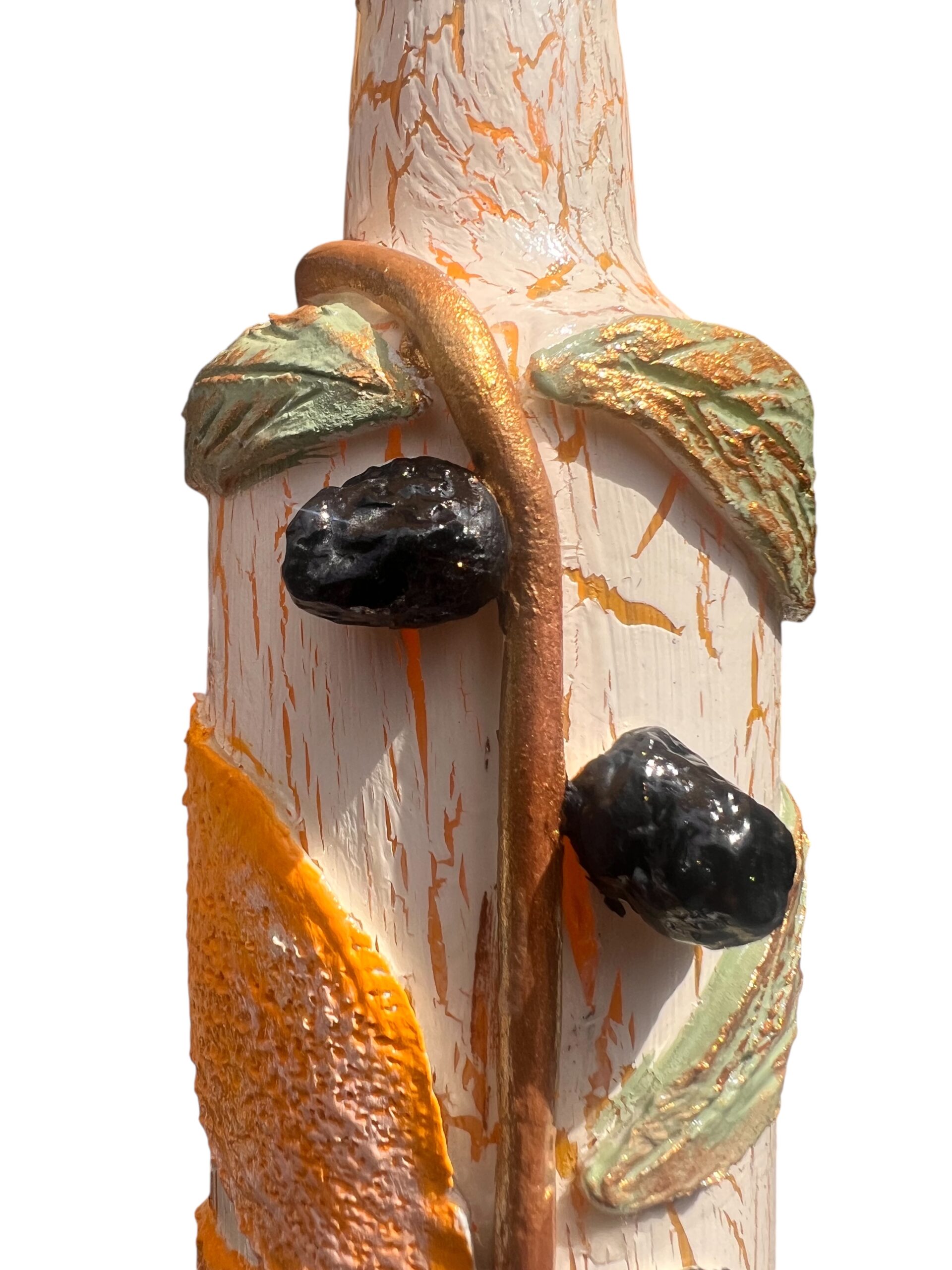 - Teknik: Çatlatma (crackle) efekt + kil kabartma (üzüm ve zeytin motifleri) + altın varak detaylar