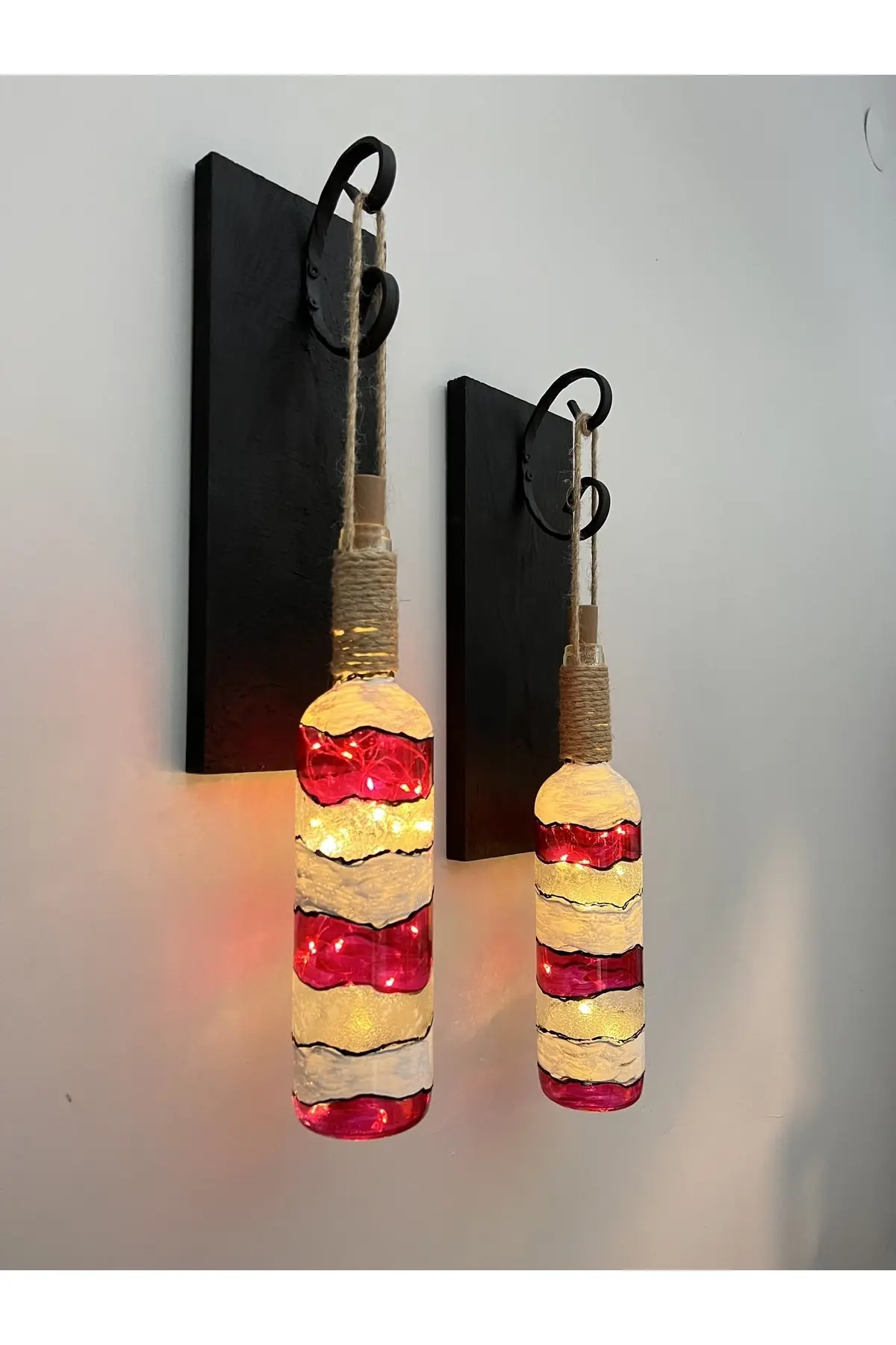 Led Işıklı Ahşap Kırmızı Renkli Vitray Cam Salon Bar Bahçe Dekoru Şarap Şişesi Duvar Aplik 2’li Set
