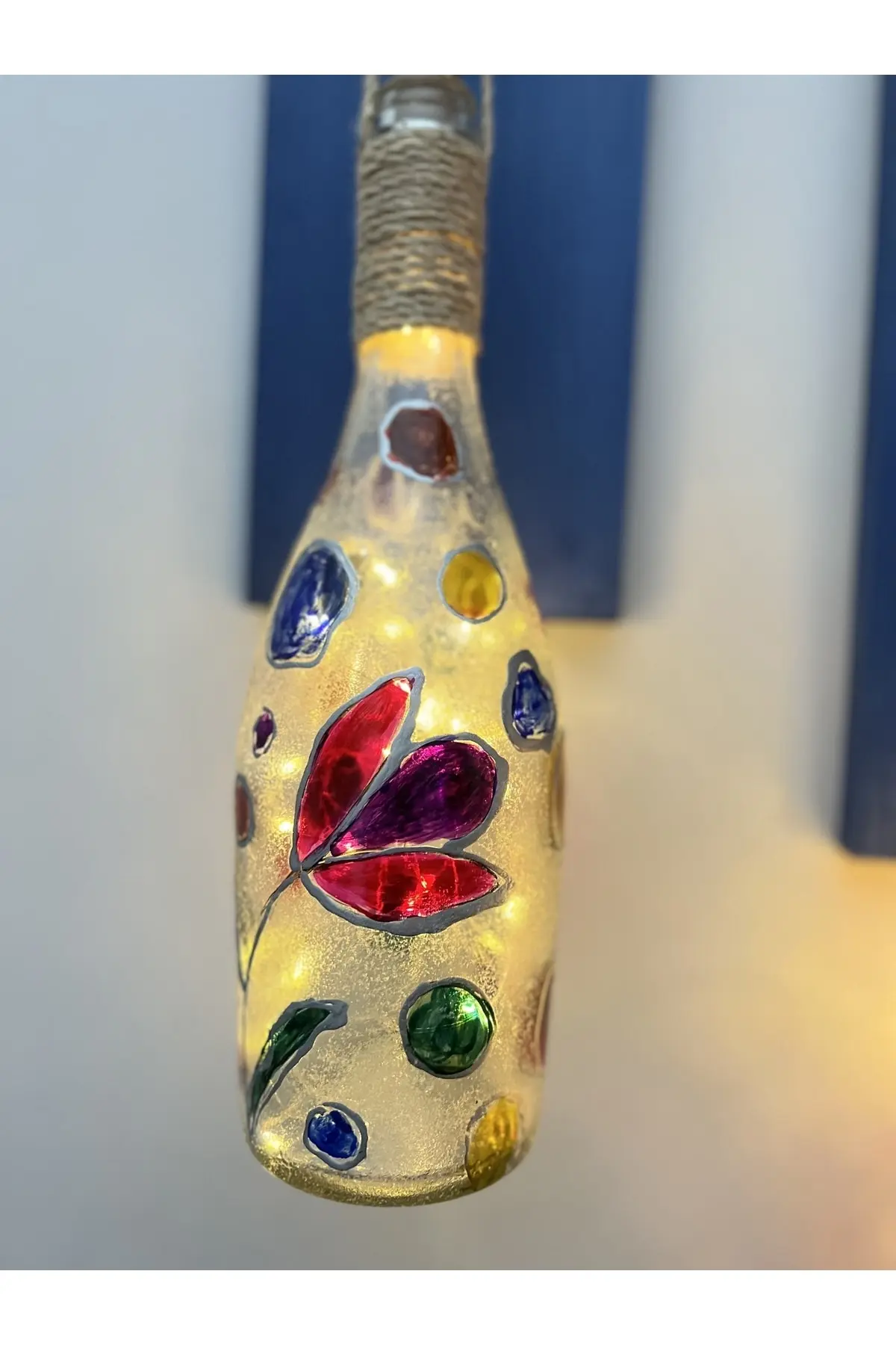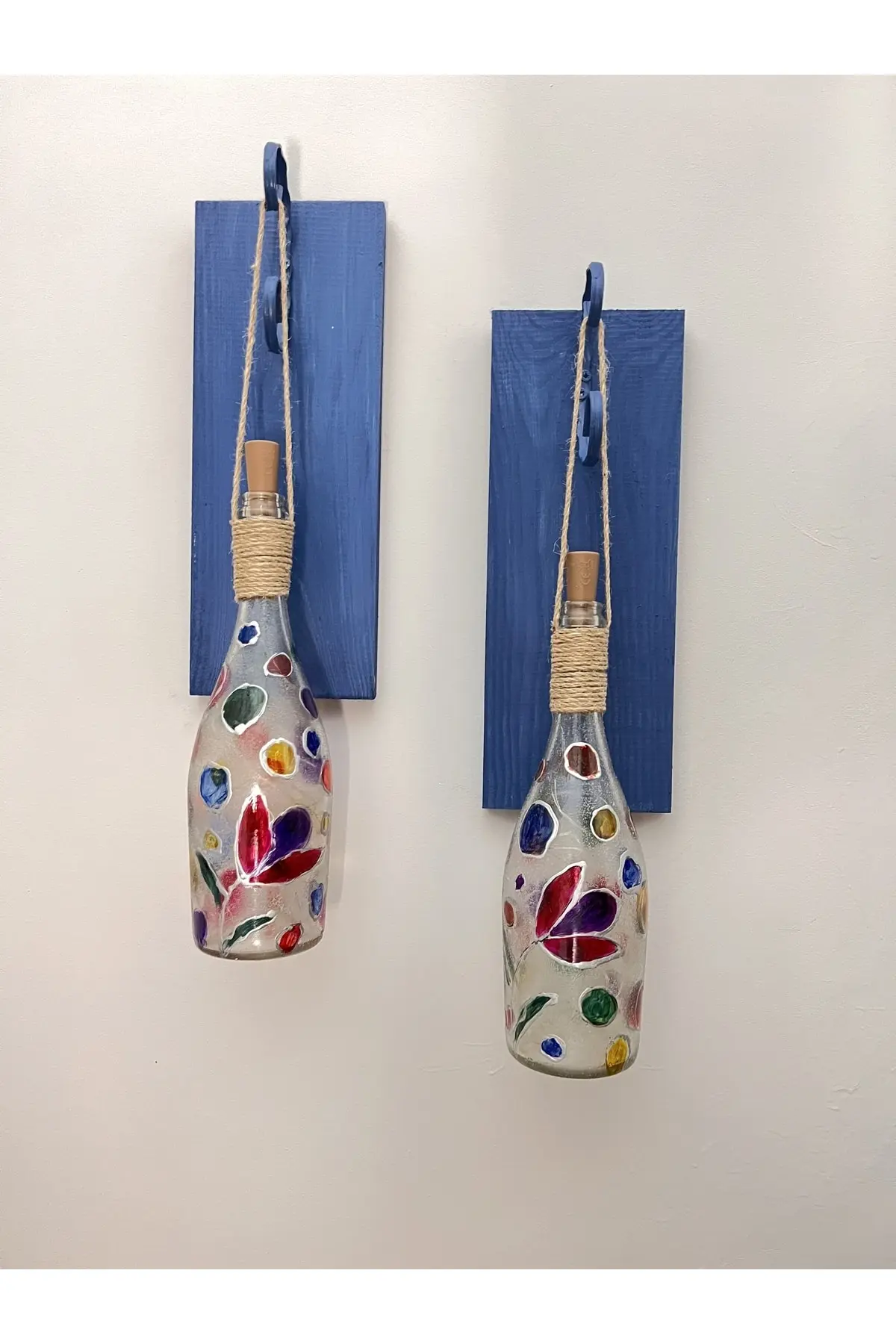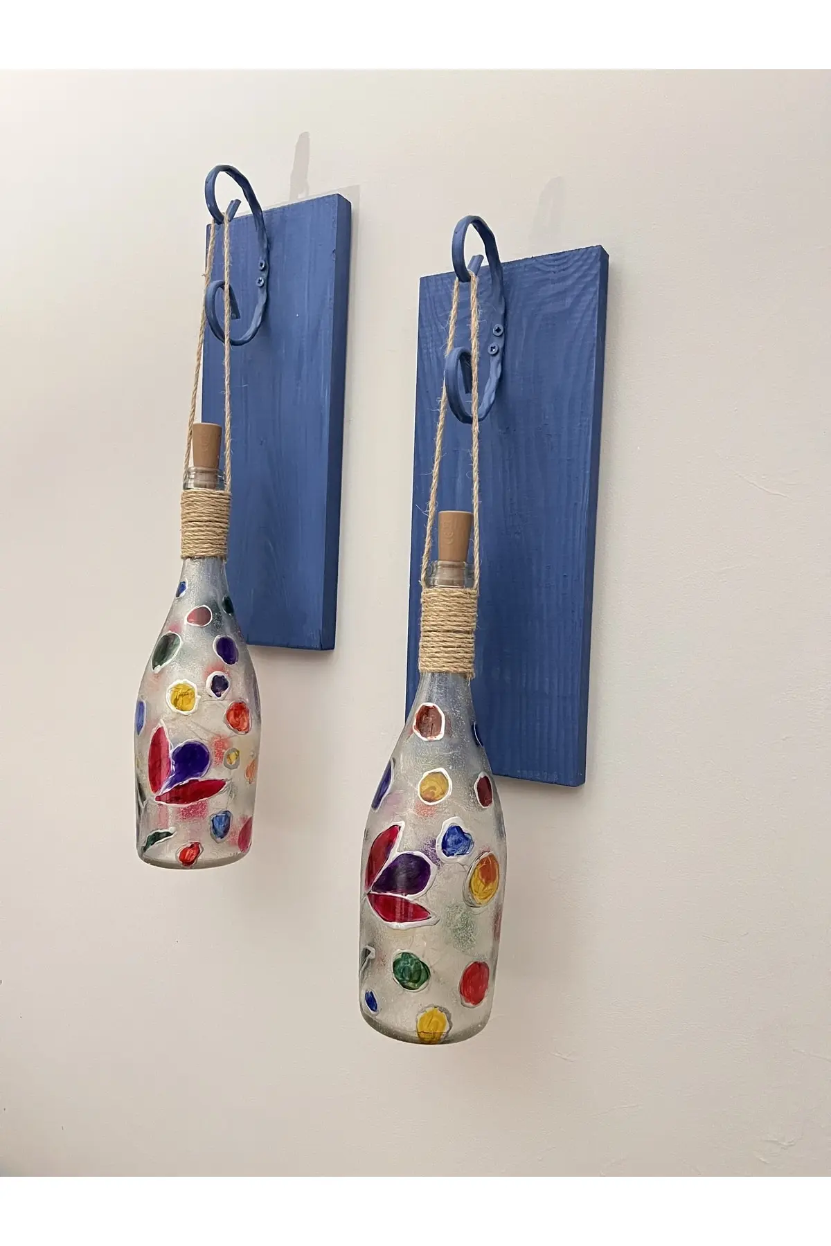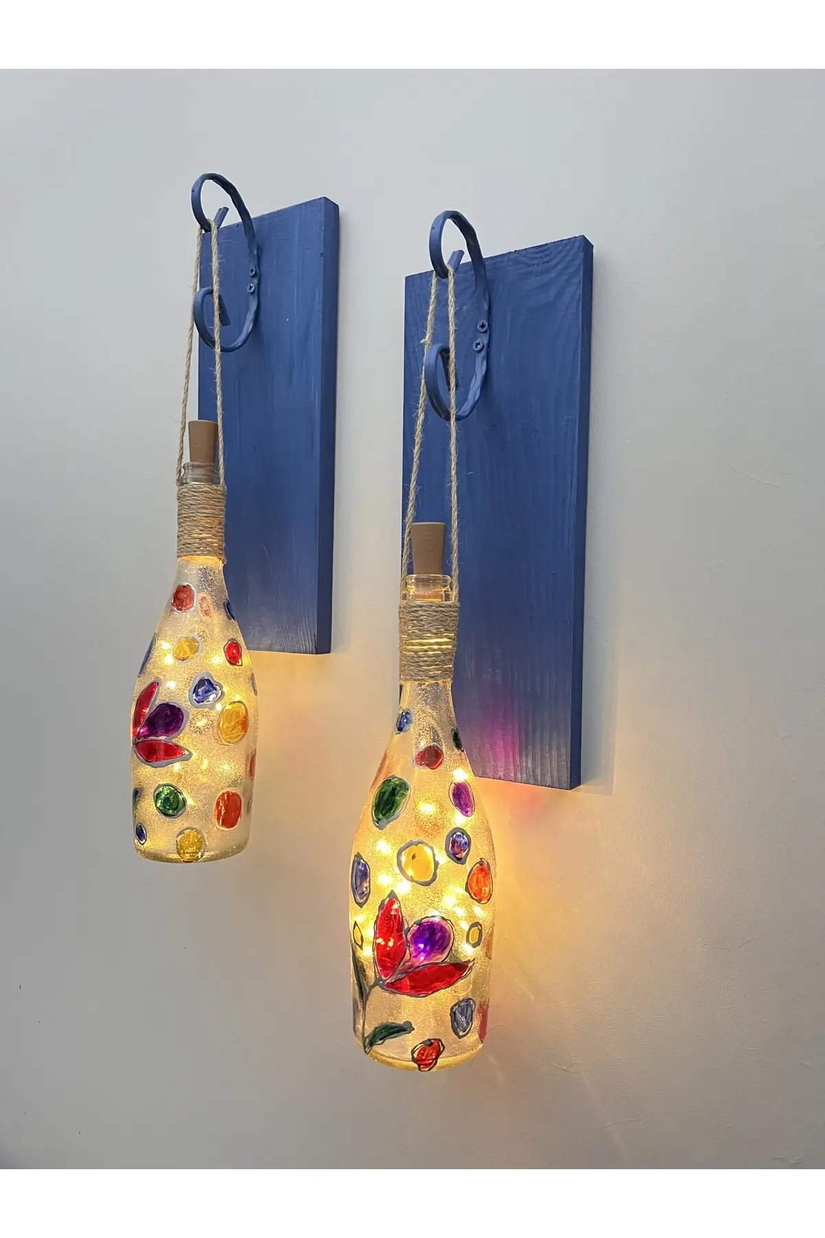 Led Işıklı Ahşap Koyu Mavi Renkli Vitray Cam Salon Bar Bahçe Dekoru Şampanya Şişesi Aplik 2’li Set