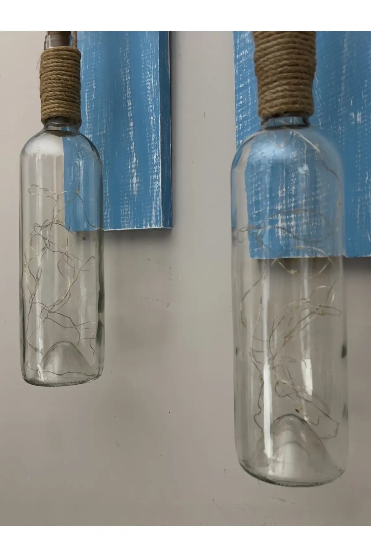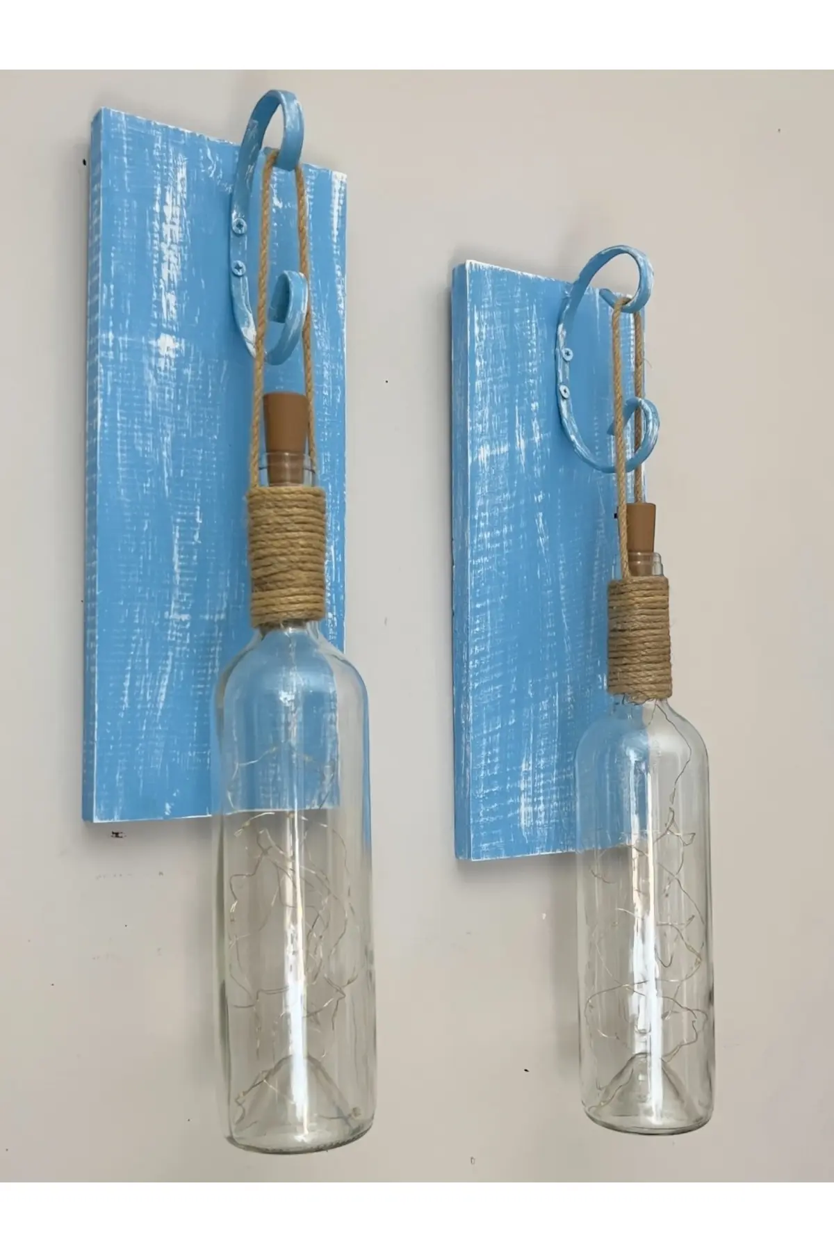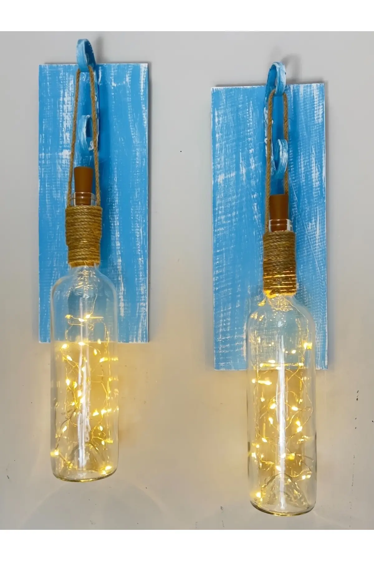 Mavi Tıpa Peri Led Işıklı Şarap Şişesi Duvar Aplik 2li Set, Ev Dekor, Bahçe Dekor,bar Dekor