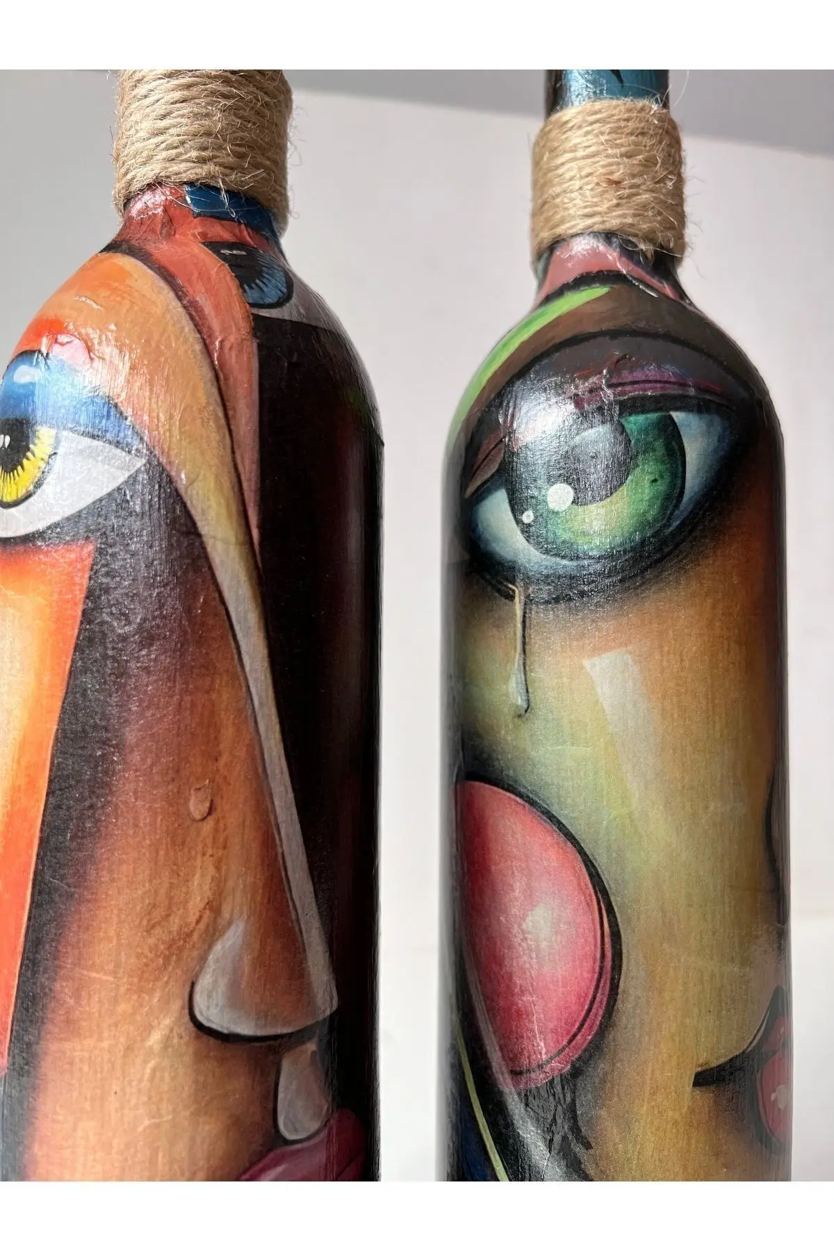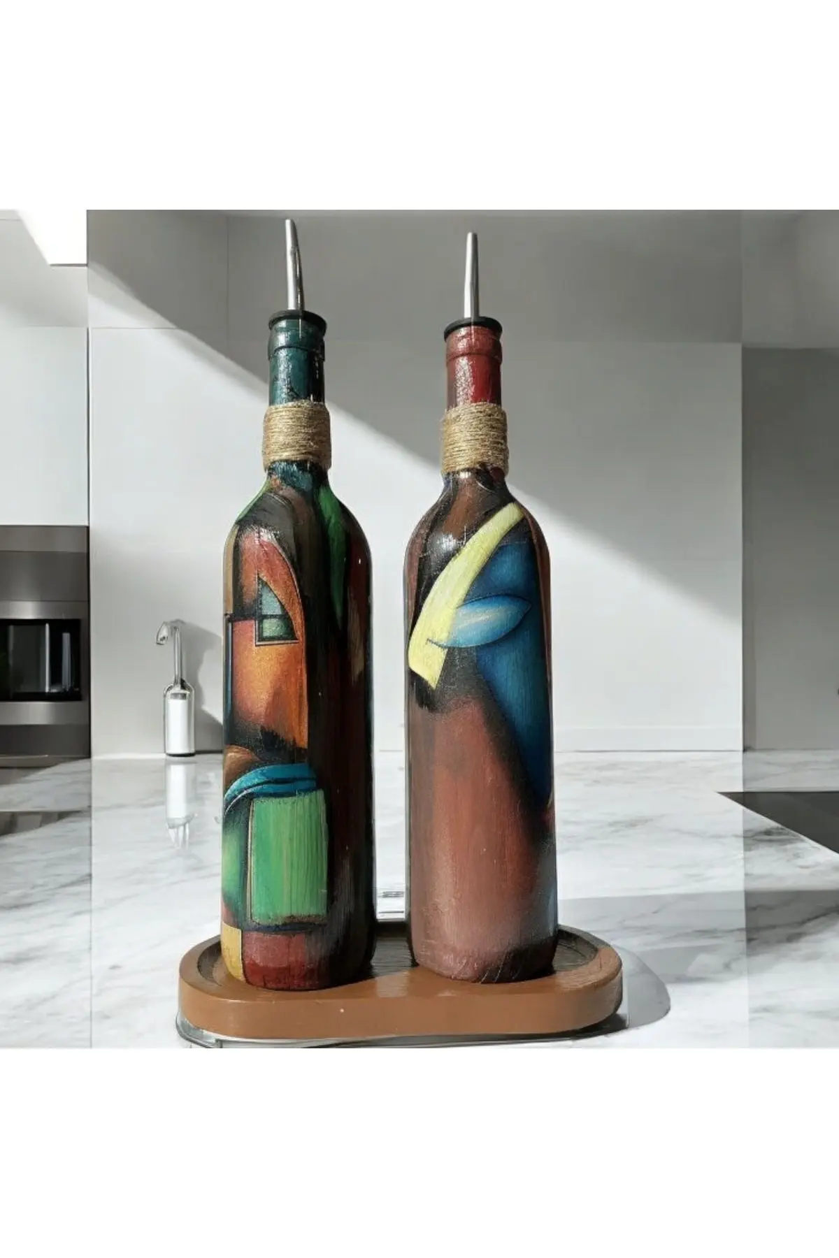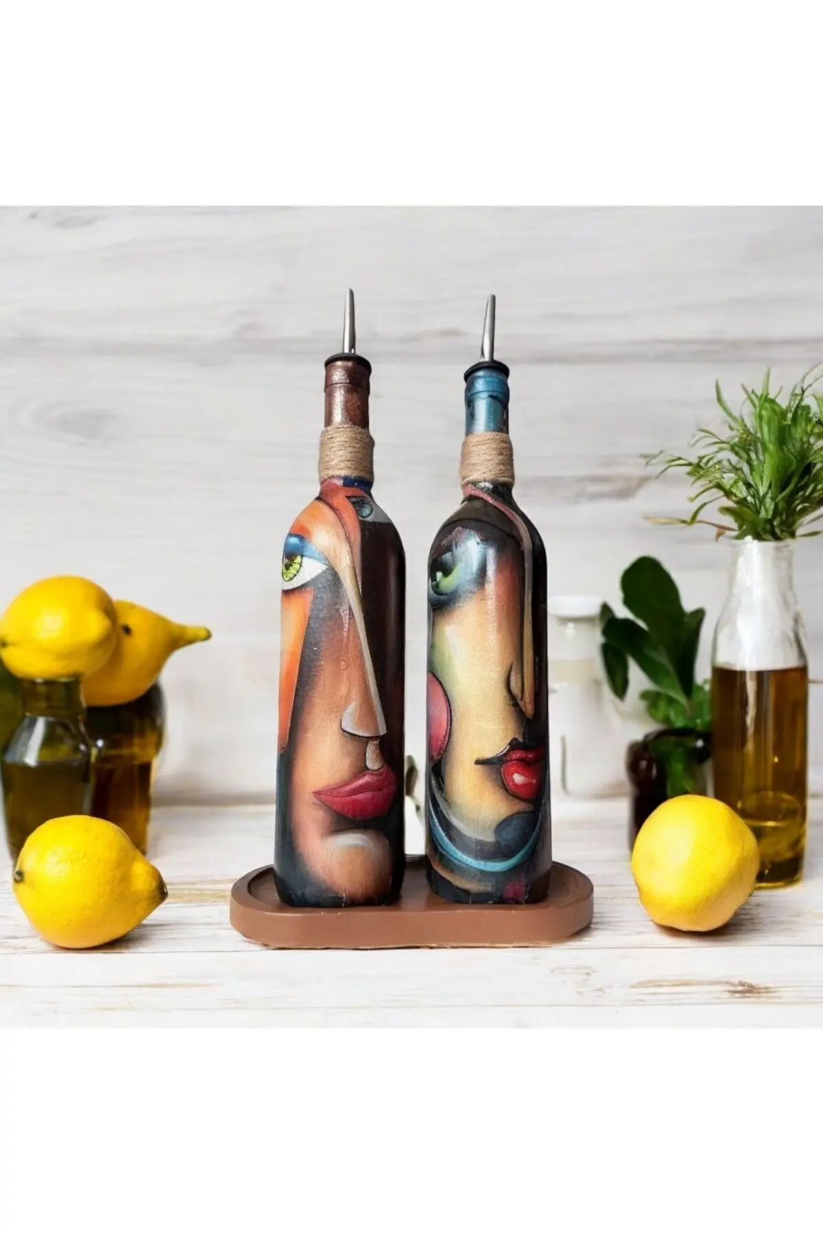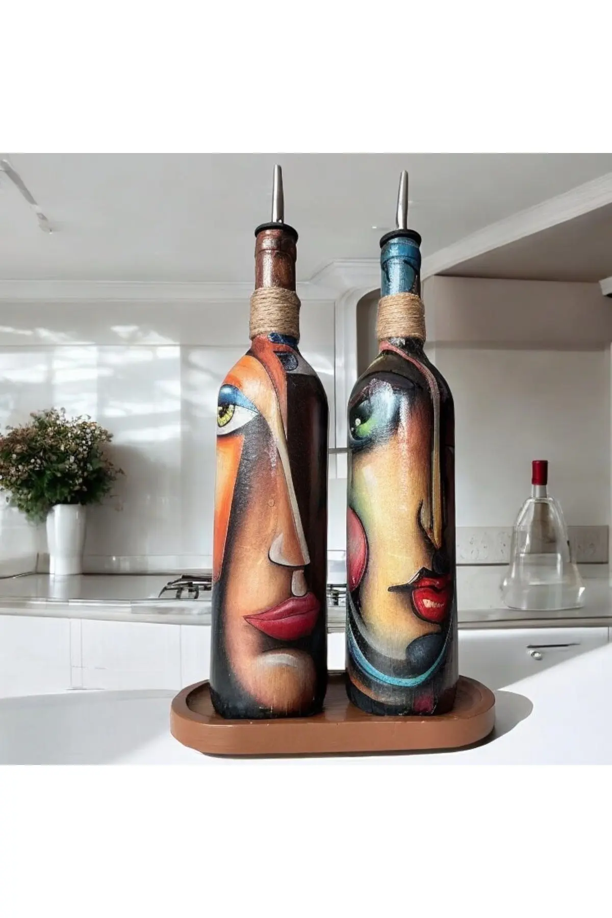Mutfaklarınıza çağdaş bir dokunuş katmak ve sofralarınıza renkli bir görsellik sunmak için tasarlanmış olan bu 2’li set, zeytinyağı ve sıvıyağınızı muhteşem bir şekilde sunmanızı sağlar.; Soyut yüz desenleriyle dikkat çeken bu özel ürün, modern tasarımıyla hem göze hitap eder hem de işlevselliği ön planda tutar.; Her biri 750 ml kapasiteli olan bu şık şişeler, soyut yüz desenleriyle renklendirilmiştir.; Canlı ve dinamik renklerle süslenmiş olan bu desenler, mutfaklarınıza enerji ve yaşam katar.; Ürünün yanında sunulan özel tasarım sunum standı, masanızda düzenli bir sunum sağlarken aynı zamanda modern bir atmosfer yaratır.; Bu zeytinyağı ve sıvıyağ şişeleri, sağlam ve dayanıklı cam malzemeden üretilmiştir ve gıda güvenliği standartlarına uygun olarak tasarlanmıştır.; Kapakları sızdırmazlık sağlayarak yağların tazeliklerini korurken, kolayca dökülmesini sağlayan akıtıcı tasarımlarıyla da kullanım kolaylığı sunar.; Zarif soyut yüz desenleriyle modern bir sunum yapmak isteyenler için ideal olan bu ürün, hem kendi kullanımınız için hem de sevdiklerinize renkli bir hediye alternatifi sunar.; Sunum standı ile birlikte gelir, şık bir sunum imkanı sunar.; Mutfakta ve sofrada kullanım için uygundur.; Kendiniz için veya sevdiklerinize yeni ev hediyesi, düğün hediyesi olarak düşünebileceğiniz modern bir seçenek.; Kullanım ve Bakım Talimatları: Her el yapımı üründe olduğu gibi bu ürünü de elde yıkamanız tavsiye edilir.; Bulaşık makinesinde yıkanması, el boyamasının zarar görmesine neden olabilir.; Sert temizlik malzemeleri kullanmaktan kaçının.; Yumuşak bir sünger ve hafifbir deterjan ile temizlemeniz yeterli olacaktır.