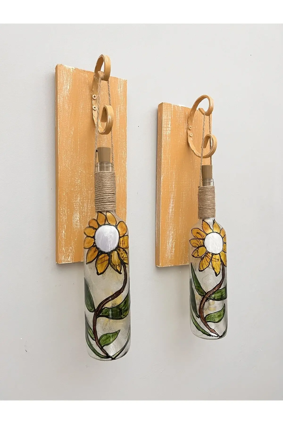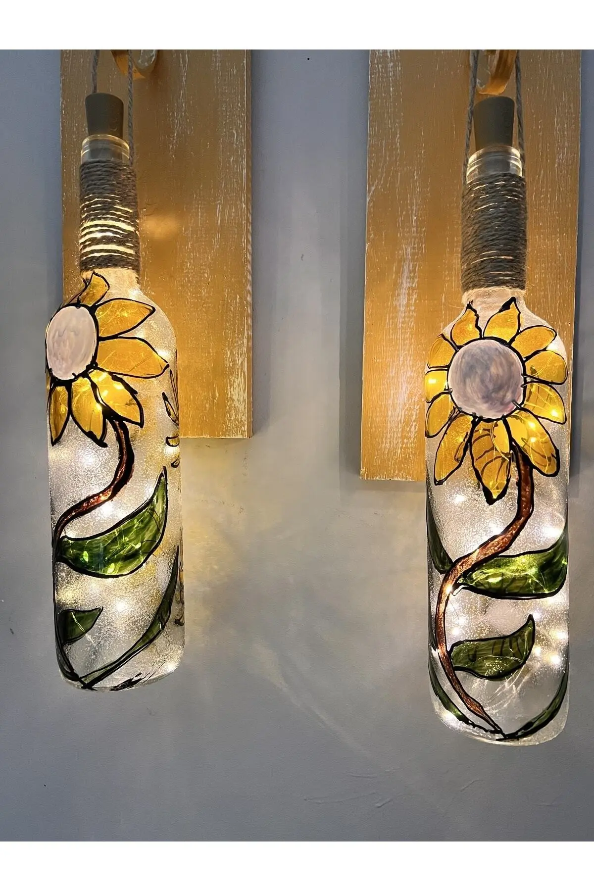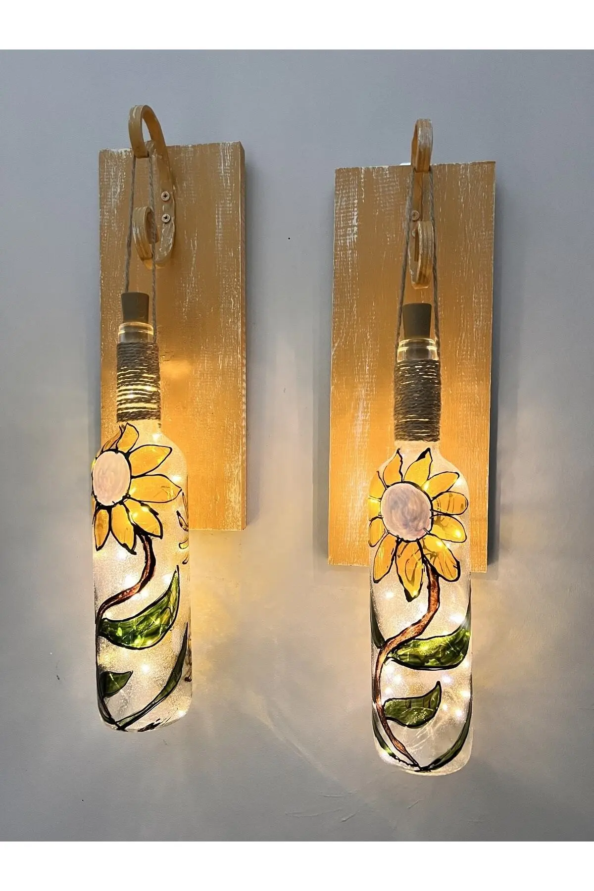 Peri Led Aydınlatma Sarı Ahşap Dekorlu, Vitray El Boyama Ayçiçekli Şarap Şişesi Aplik 2 ‘li Set.