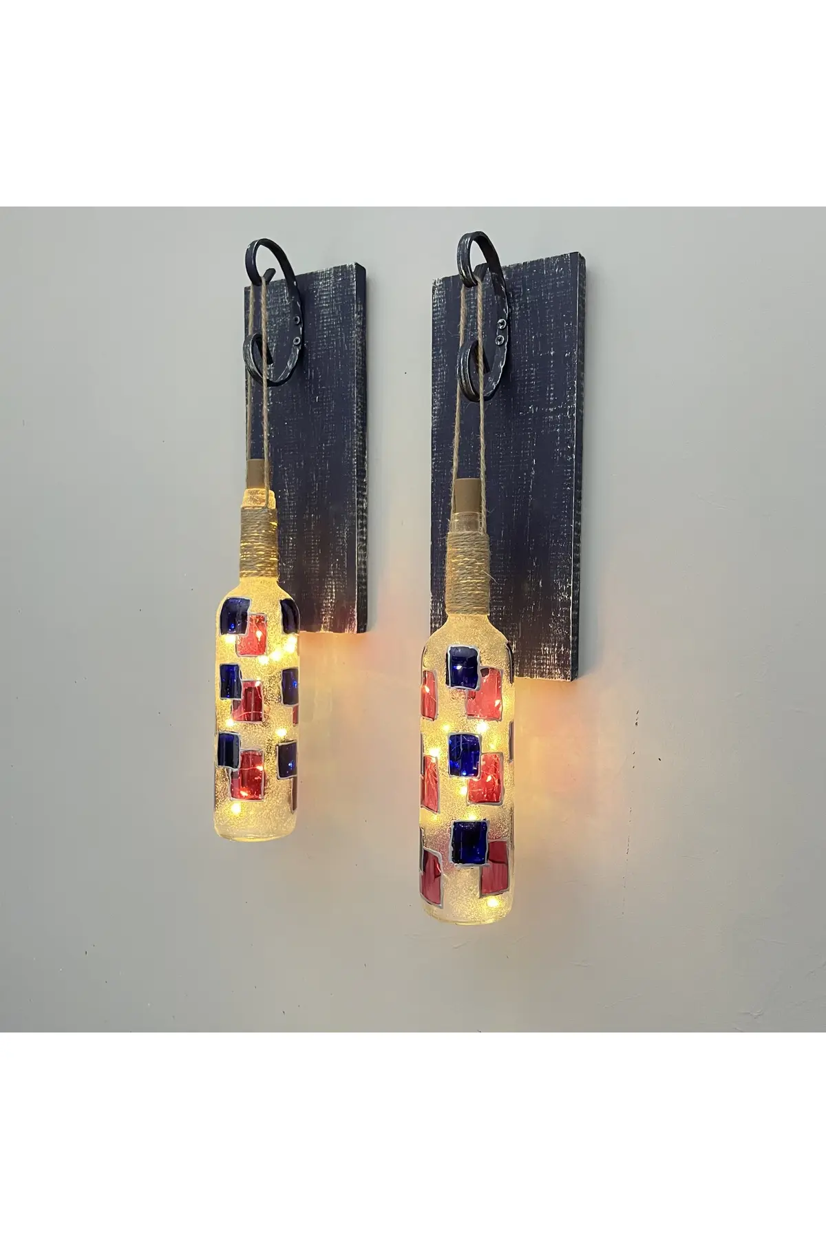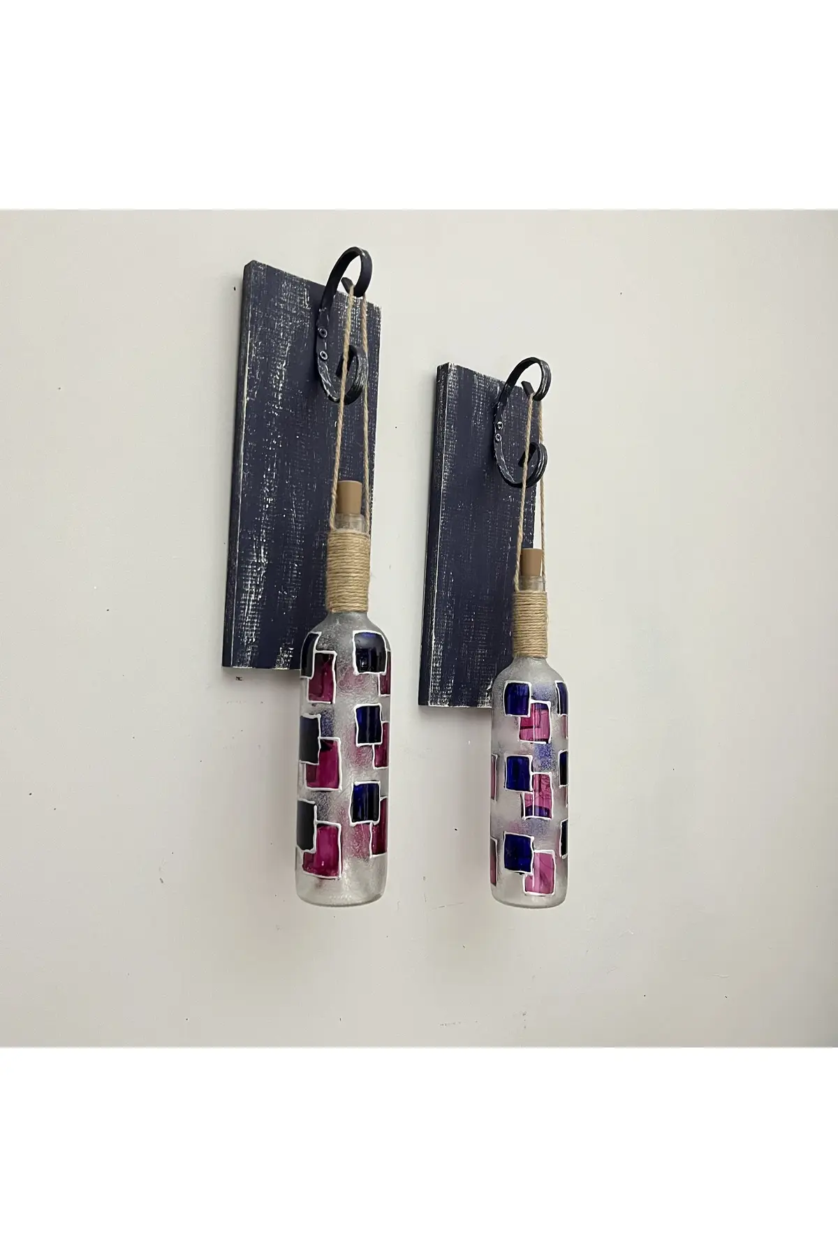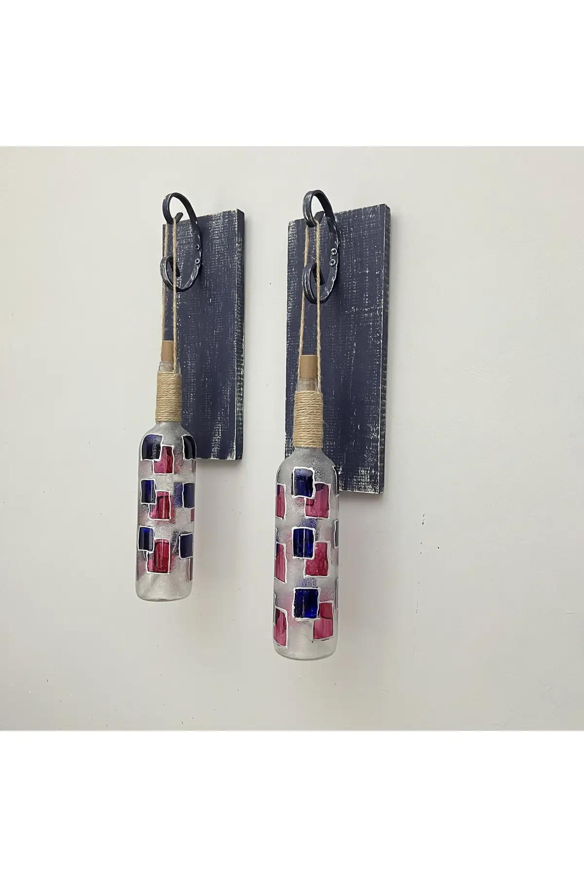 Peri LED Işıklı Ahşap Dekorlu Ferforje Bağlantılı Kırmızı Lacivert Vitray Şarap Şişesi Duvar Dekoru