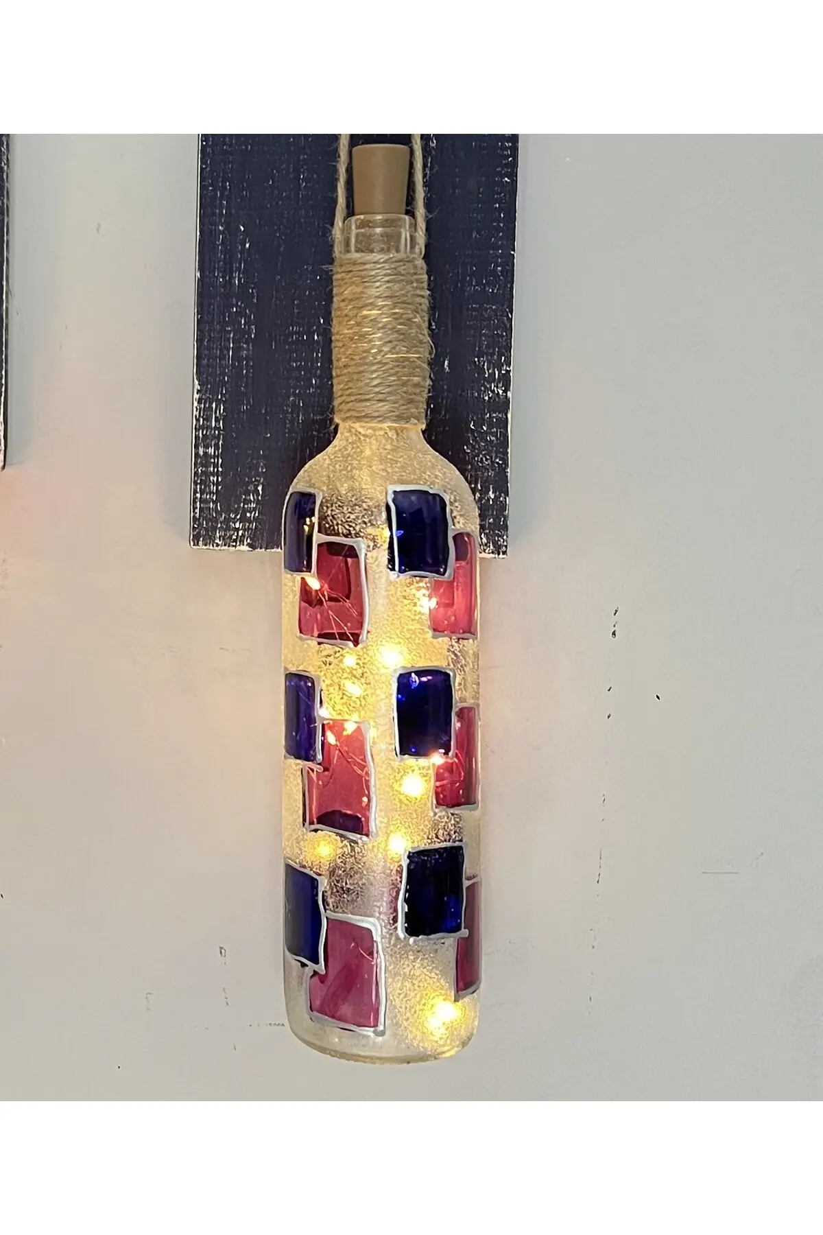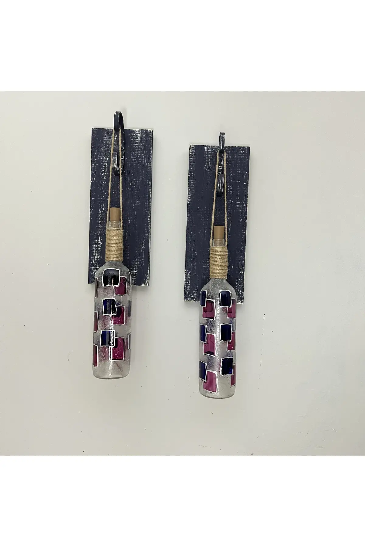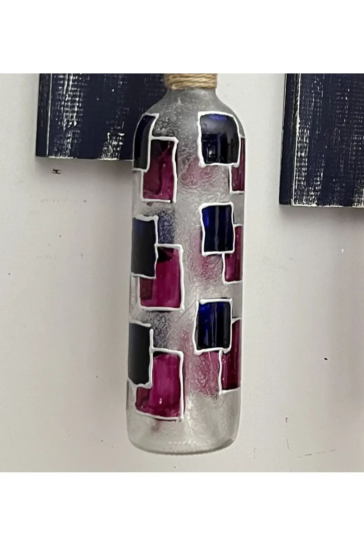 Peri LED Işıklı Ahşap Dekorlu Ferforje Bağlantılı Kırmızı Lacivert Vitray Şarap Şişesi Duvar Dekoru
