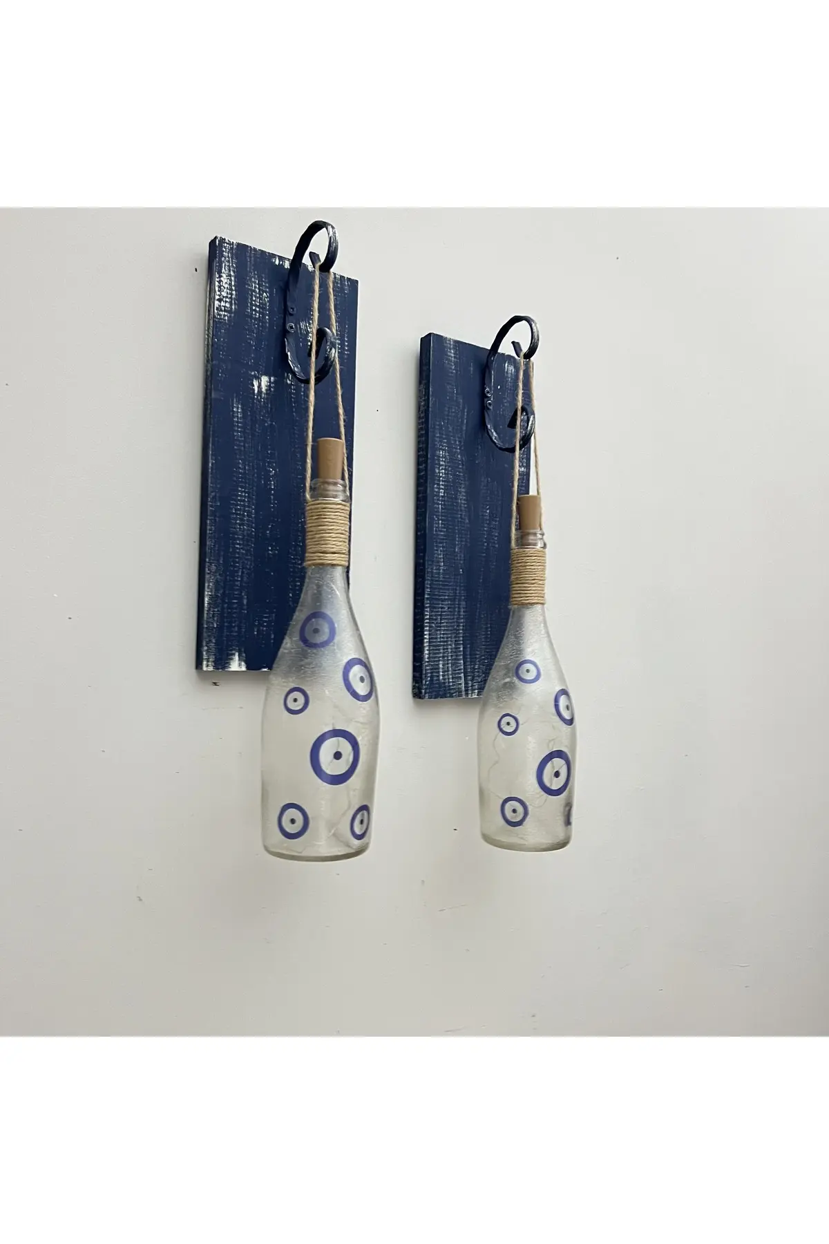 Nazar Boncuklu Peri LED Işıklı Ahşap Panel Ferforje Aplik – Vintage Ev Dekorasyonu Bu eşsiz aplik, evinize mistik bir hava katacak göz alıcı bir dekorasyon parçasıdır. ; Mavi eskitme ahşap panelin üzerine özenle yerleştirilmiş ferforje detaylar ve nazara karşı koruyucu olarak inanılan nazar boncuklu buzlu cam şampanya şişesi mistik inanışlardan ilham alınarak tasarlanmıştır. ; Doğal Ahşap ve Ferforje Uyumu Mavi tonlarda eskitilmiş ahşap panel, vintage tarzı ve doğal bir görünüm sunar. ; Ferforje aparatlarla dekore edilmiş bu aplik, nostaljik bir hava katarken modern bir twist sunar. ; Her bir detay özenle seçilmiş olup evinize benzersiz bir karakter kazandırır. ; Peri LED Işıkları ile Büyüleyici Aydınlatma Nazar boncuklu buzlu cam şampanya şişesinden ilham alınarak tasarlanan bu aplik, içerisindeki LR 44 pillerle çalışan LED ışıklar sayesinde mekâna büyüleyici bir atmosfer katar. ; LED ışıklar, ortama sıcak bir ışık yayarak huzurlu bir ambiyans oluşturur. ; Ev Dekorasyonunuz için Özel Bir Parça Bu aplik, duvarlarınıza sanat ve estetik bir dokunuş getirirken aynı zamanda evinize sıcaklık ve mistik bir hava katar. ; Özellikle oturma odası, salon veya yatak odası gibi ana yaşam alanlarınızda dikkat çekici bir dekorasyon unsuru olacaktır. ; El Yapımı ve Özel Tasarım Her bir aplik özenle el yapımıdır ve özel olarak tasarlanmıştır. ; Ev dekorasyonunuz için eşsiz ve özel bir parça arıyorsanız, bu aplik tam size göre. ; Kendiniz veya sevdikleriniz için harika bir hediye seçeneği olabilir. ; Bu nazar boncuklu peri LED ışıklı aplik ile evinizi güzelleştirin, mistik bir atmosfer yaratın.;