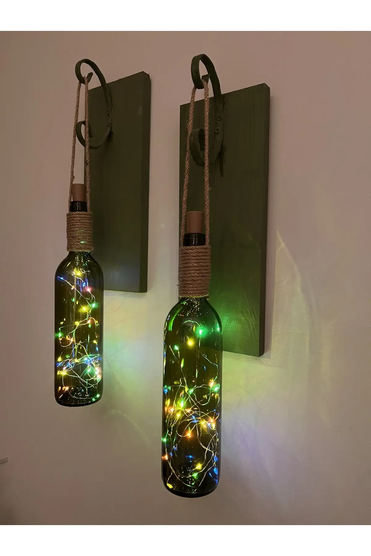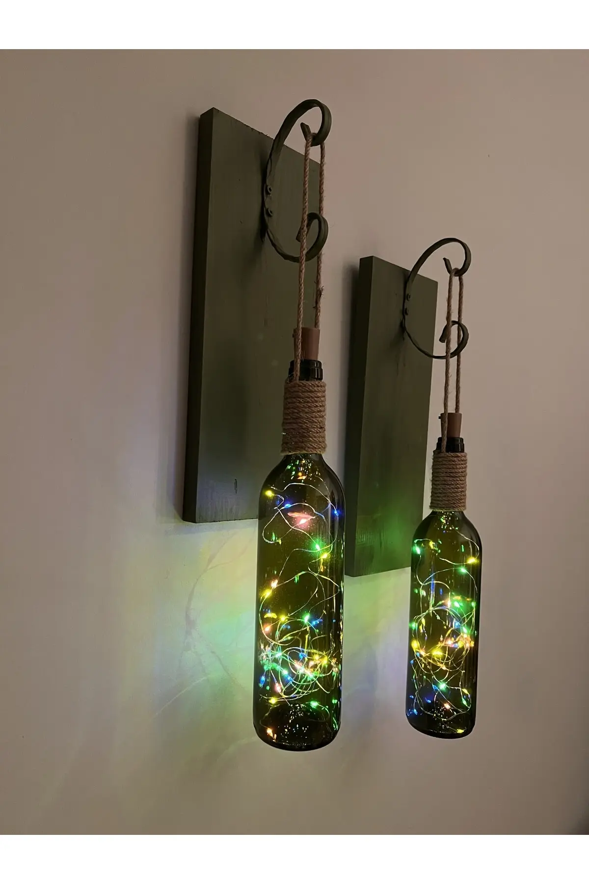 Renkli Tıpa Peri Led Işıklı Yeşil Ahşap Retro Yeşil Şarap Şişesi Duvar Aplik 2’li Set
