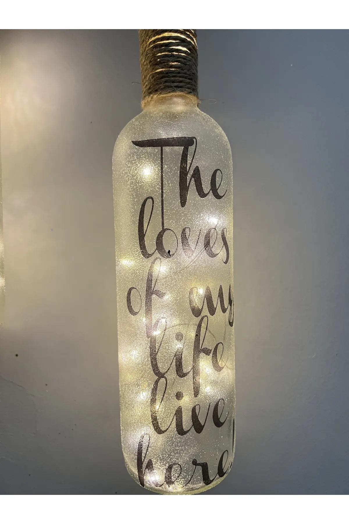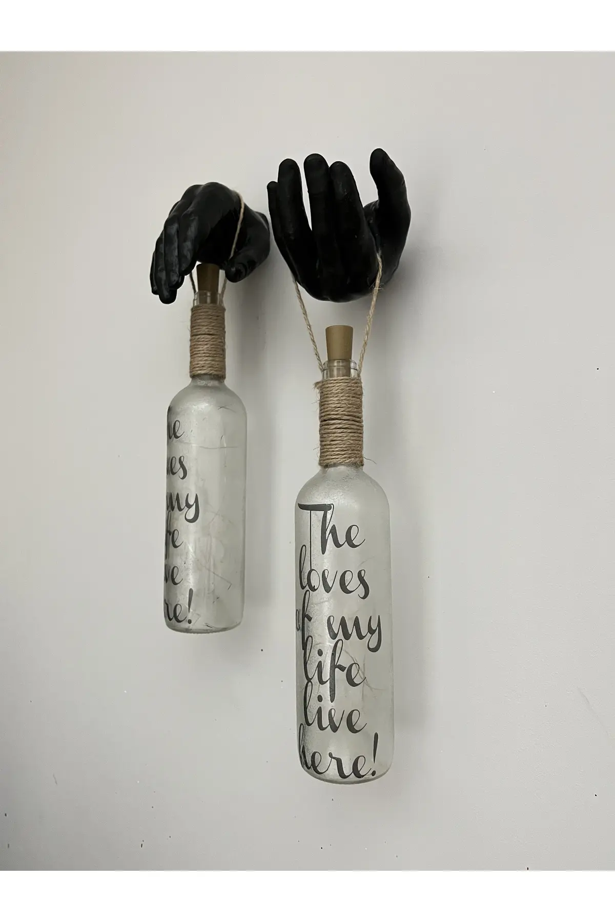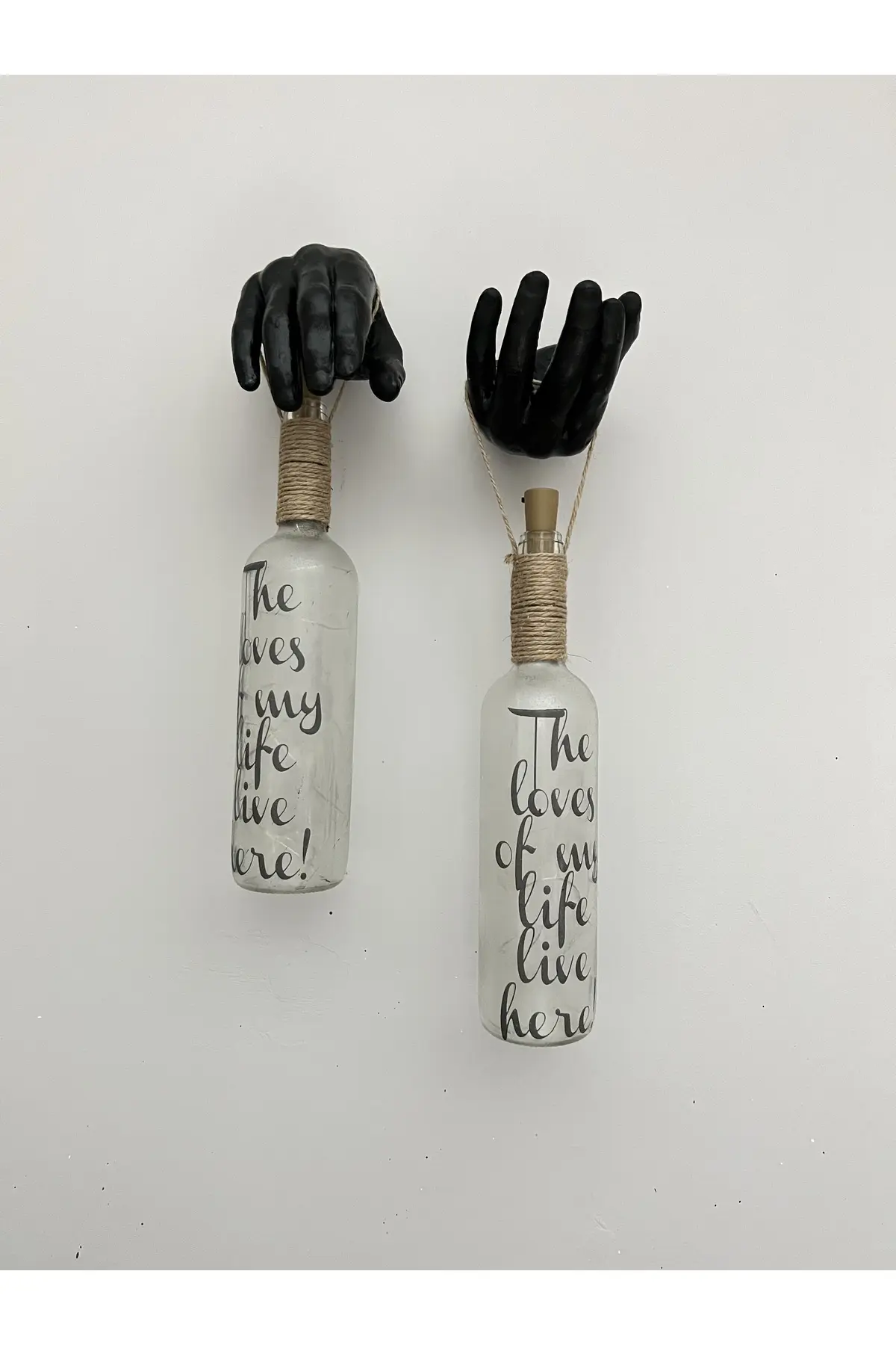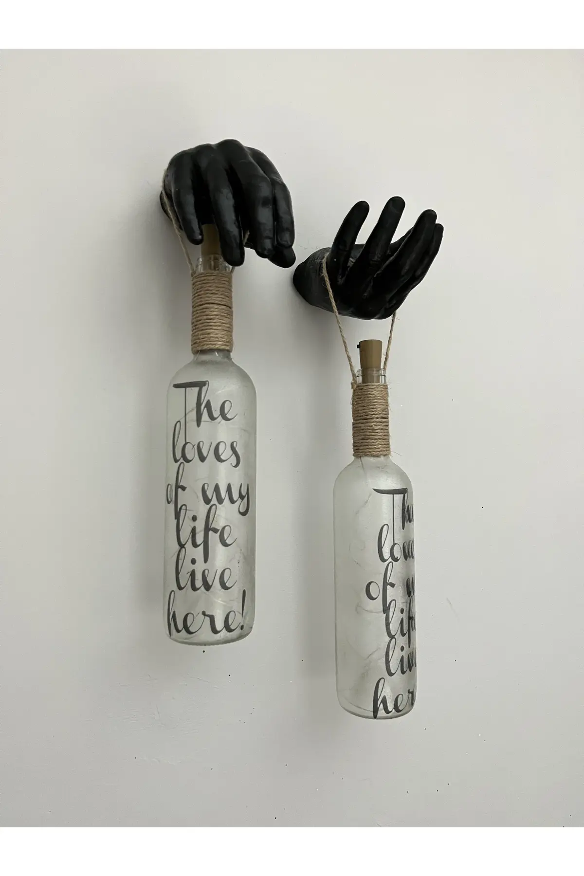 Siyah Erkek Eli Heykeli Dekorlu Buzlu Cam Şarap Şişesi Tıpa Peri Led Işıklı Aplik 2 Li Set