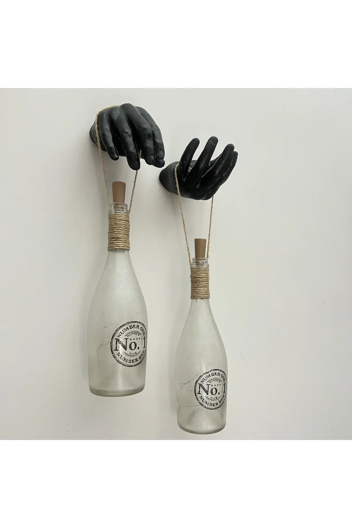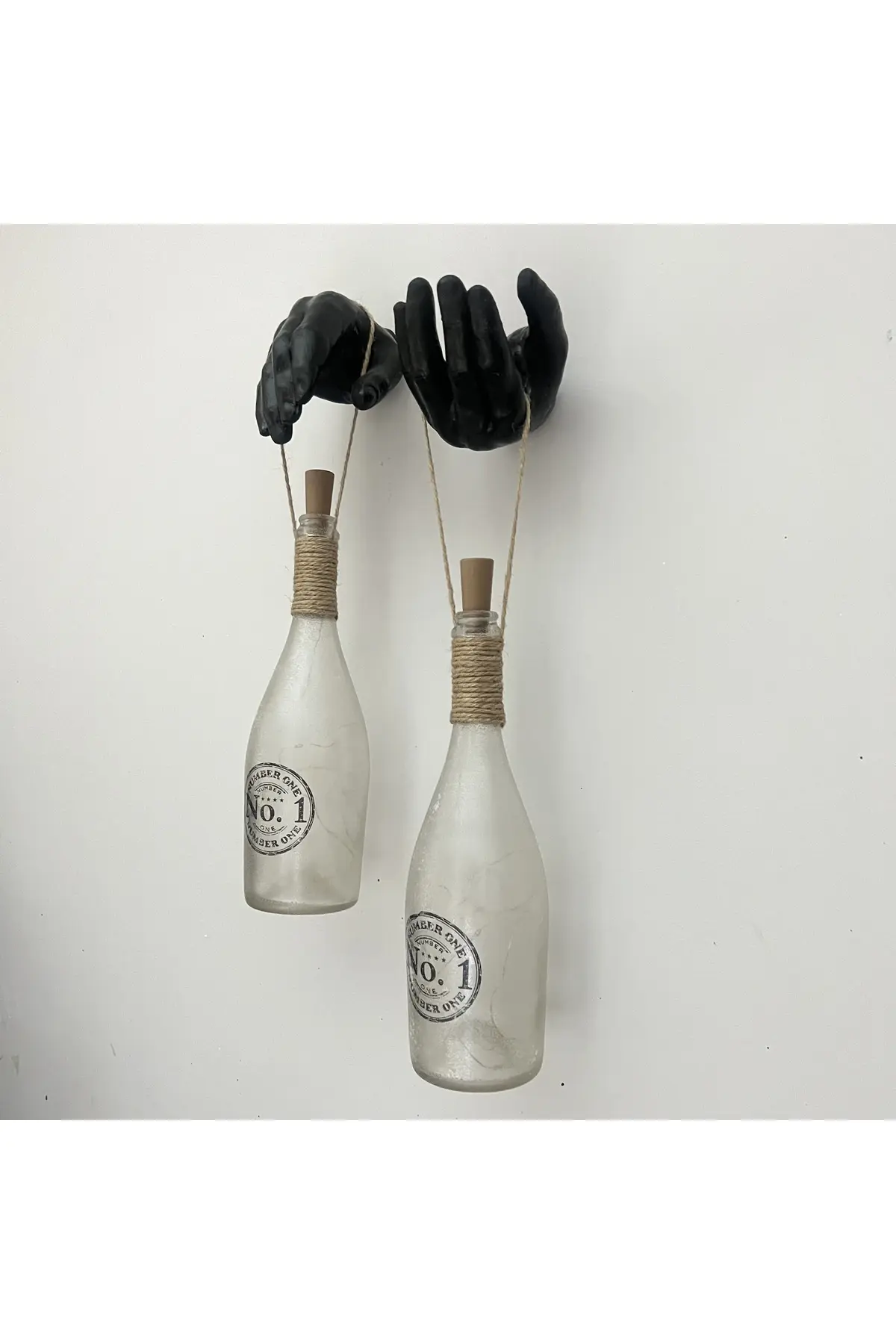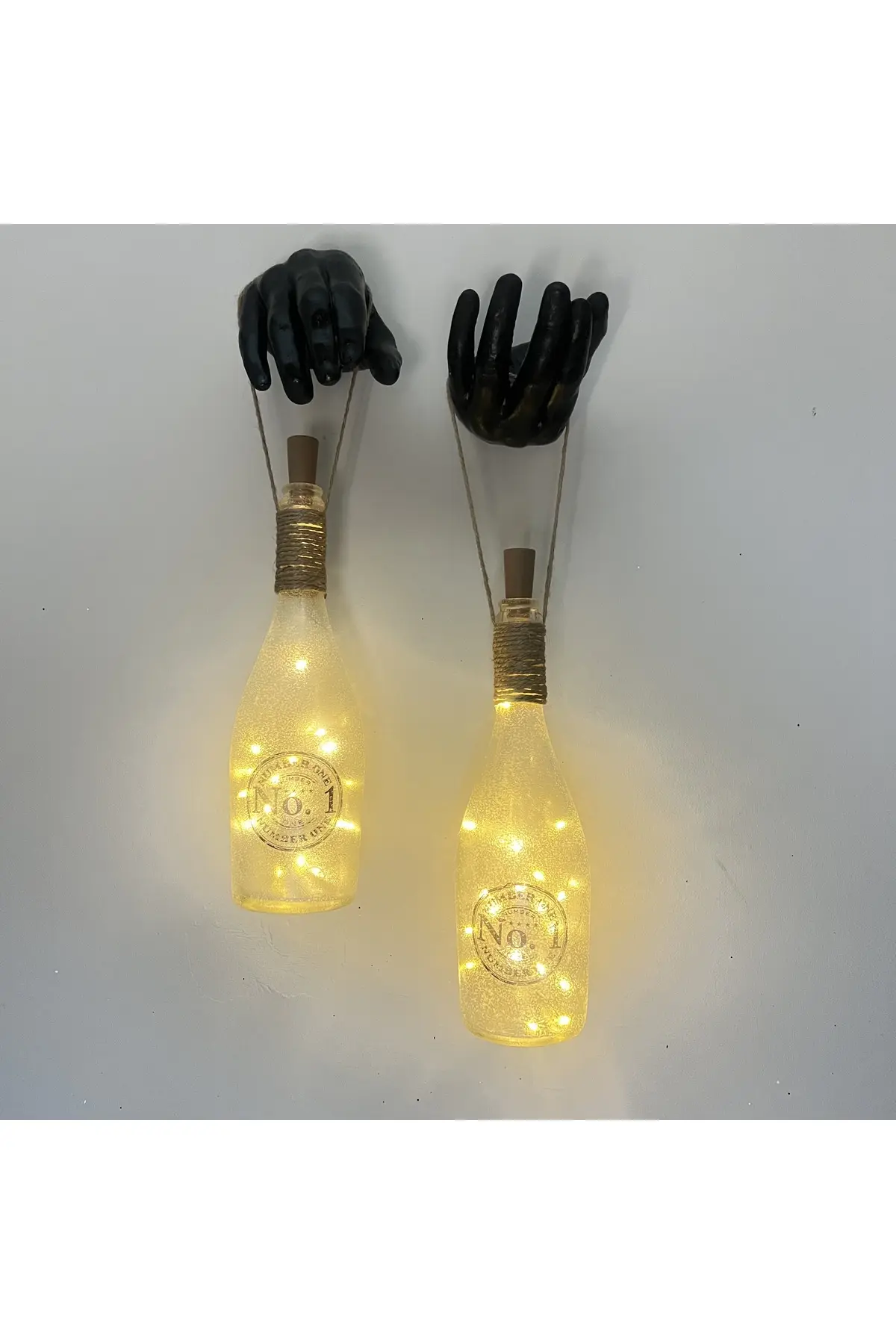 Siyah Erkek Eli Heykeli Dekorlu Pilli Peri Led Işıklı Buzlu Cam Şampanya Şişesi Aplik 2’li Set