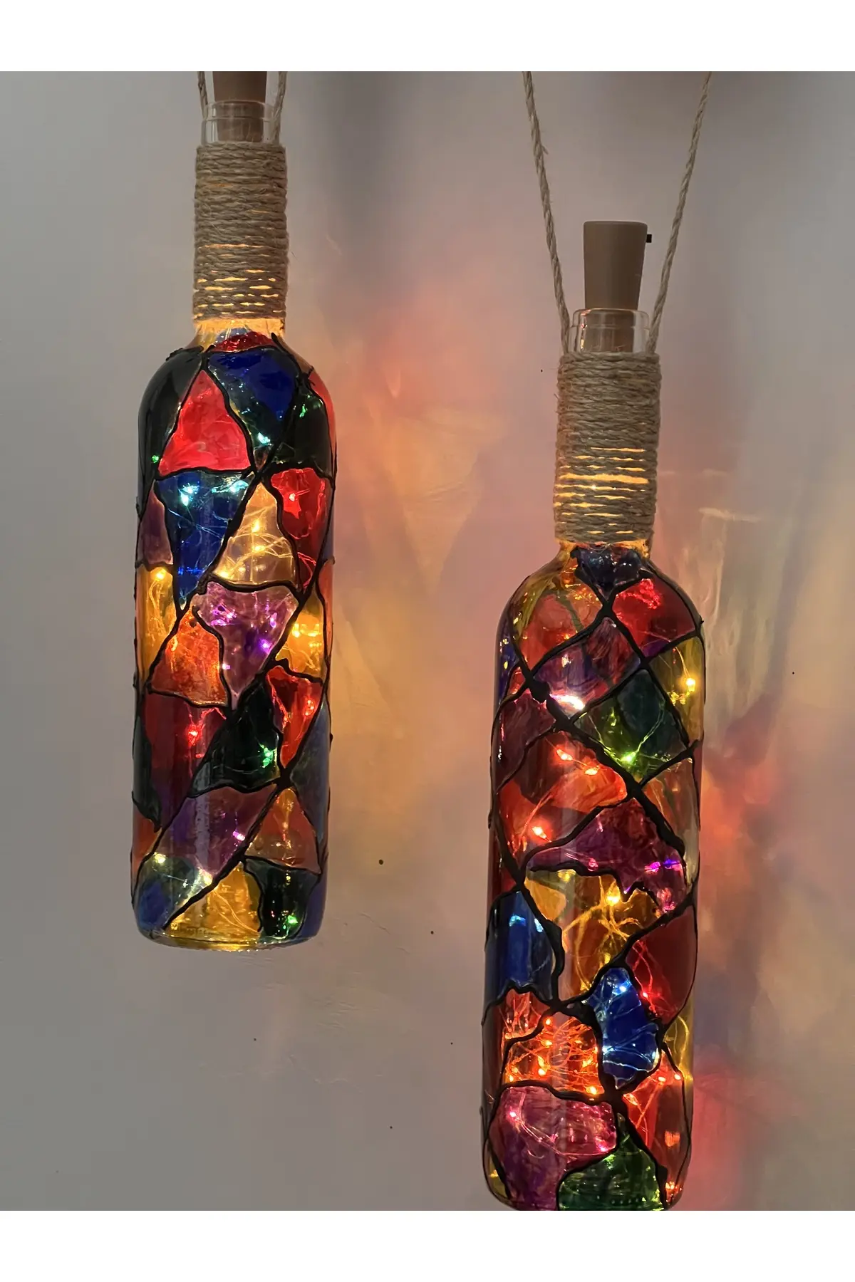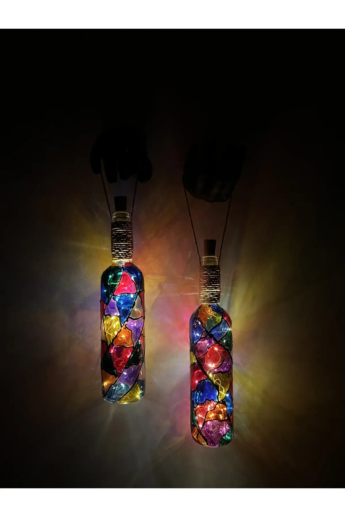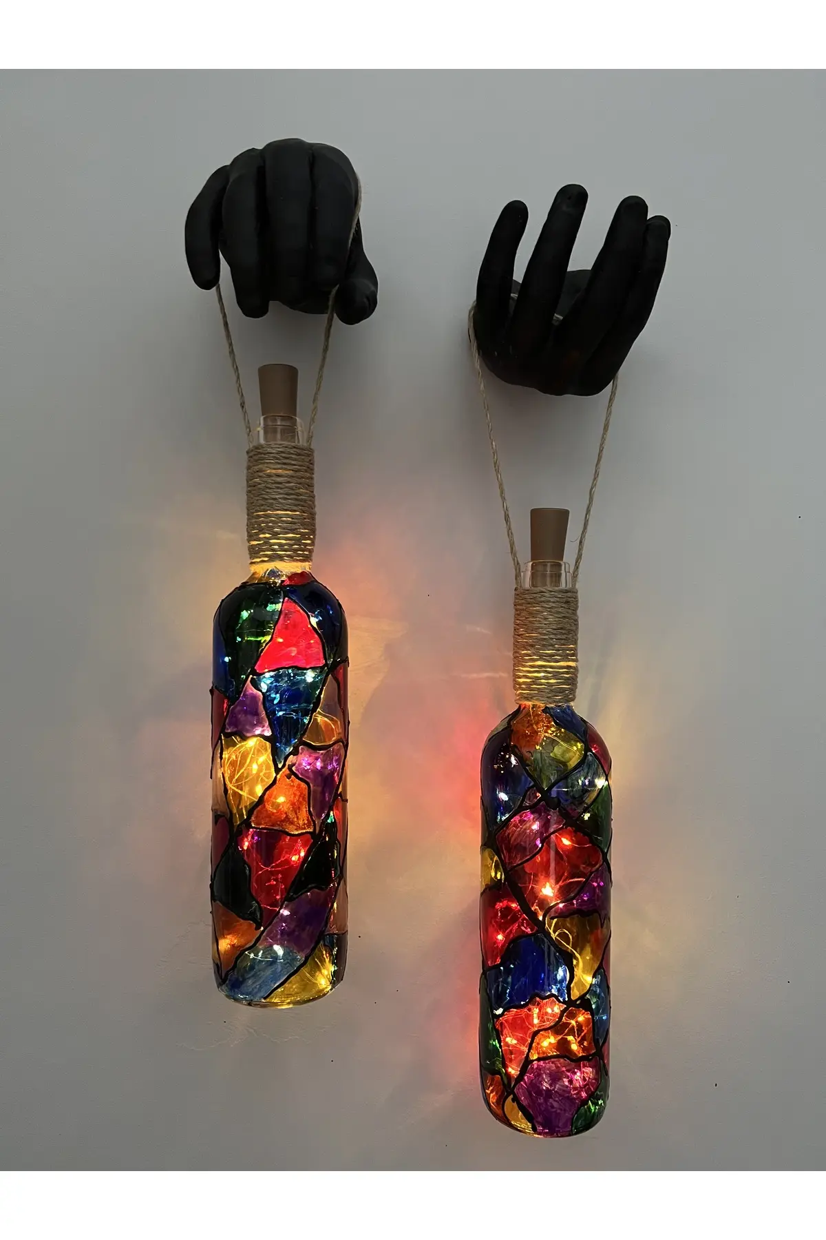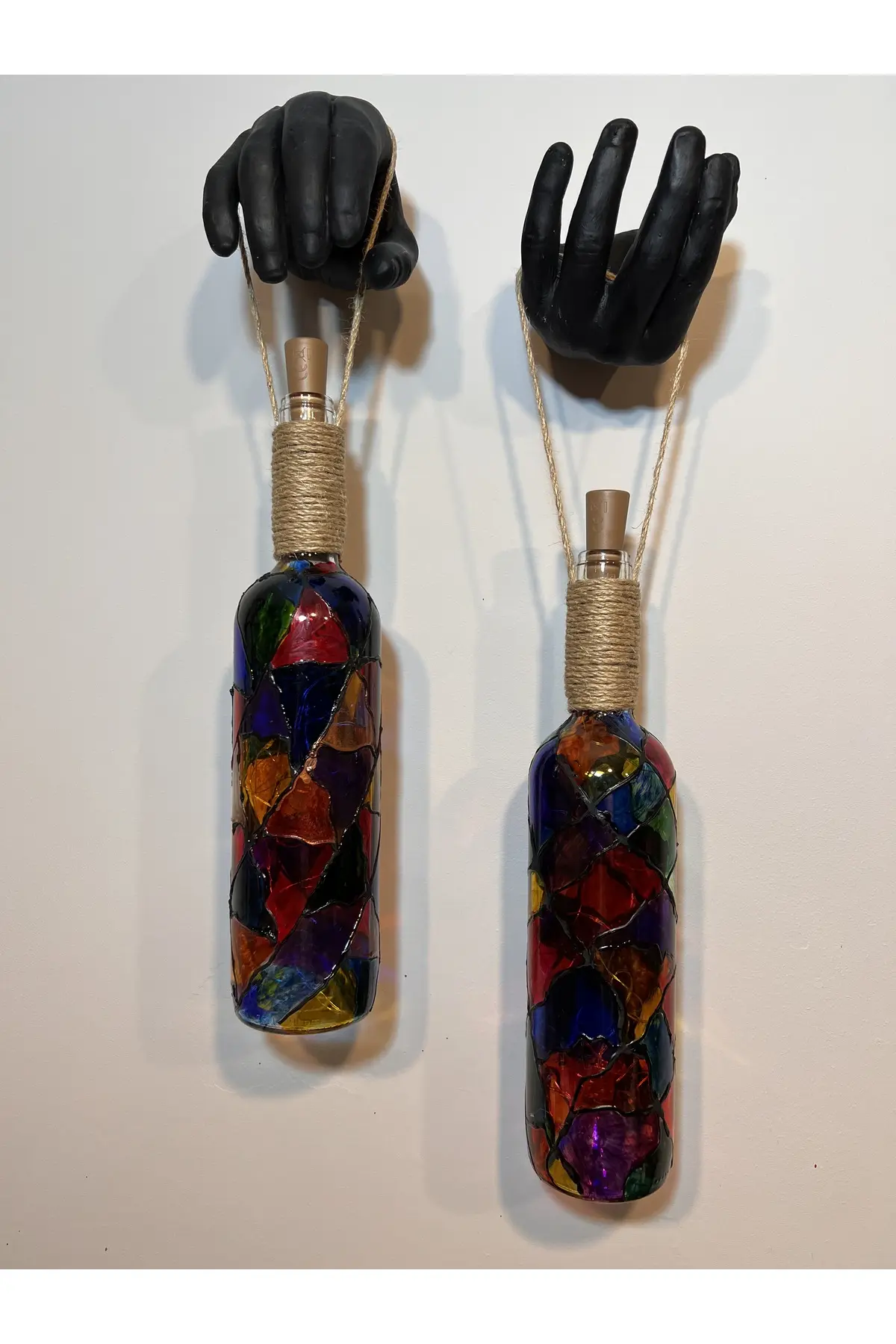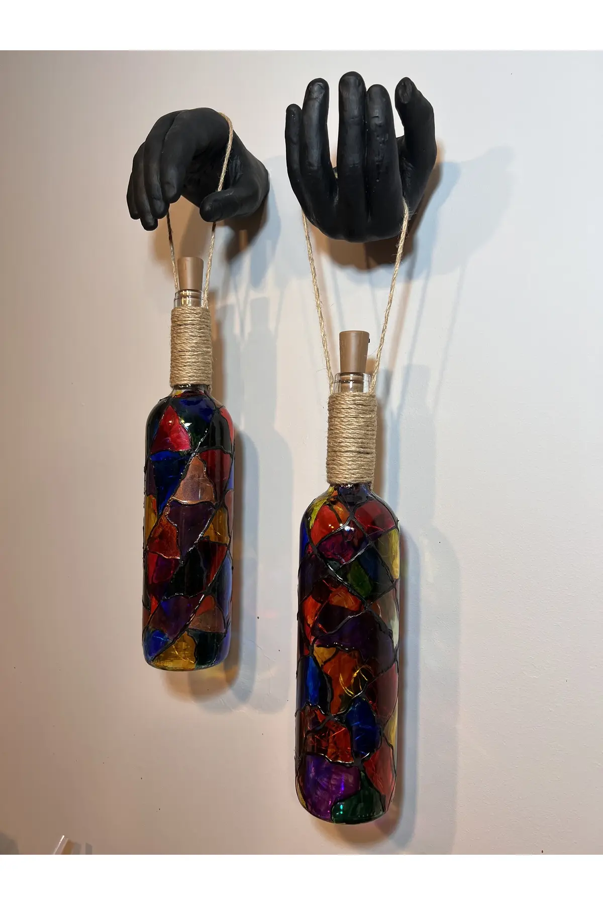 Siyah Renkli Erkek Eli Heykeli Ve Tıpa Peri Led Işıklı Vitray Cam Şarap Şişesi Aplik 2’li Set