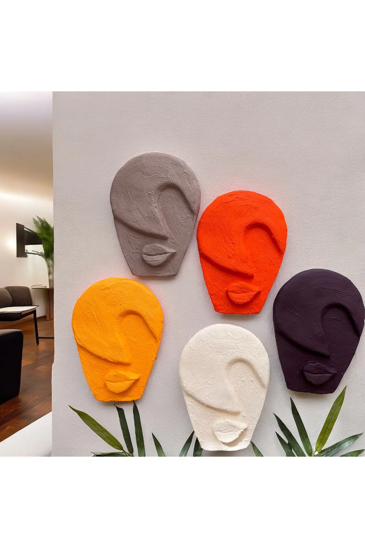 Soyut Tasarım El Yapımı Duvar Dekoru Renkli Taş Maske BÜYÜK 5’li Set, Dekor Mask, 3D Duvar Heykeli
