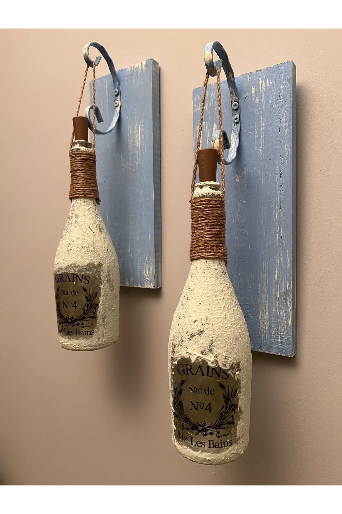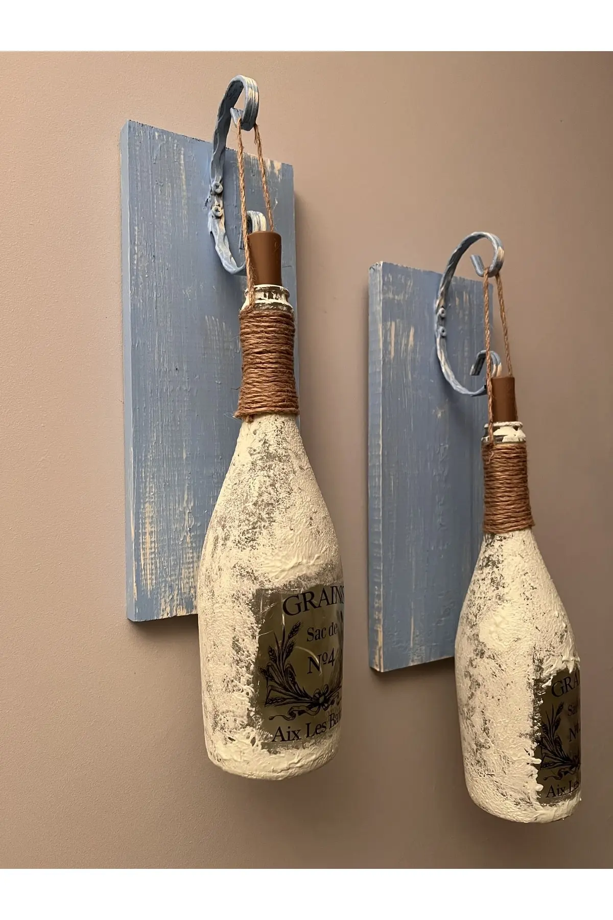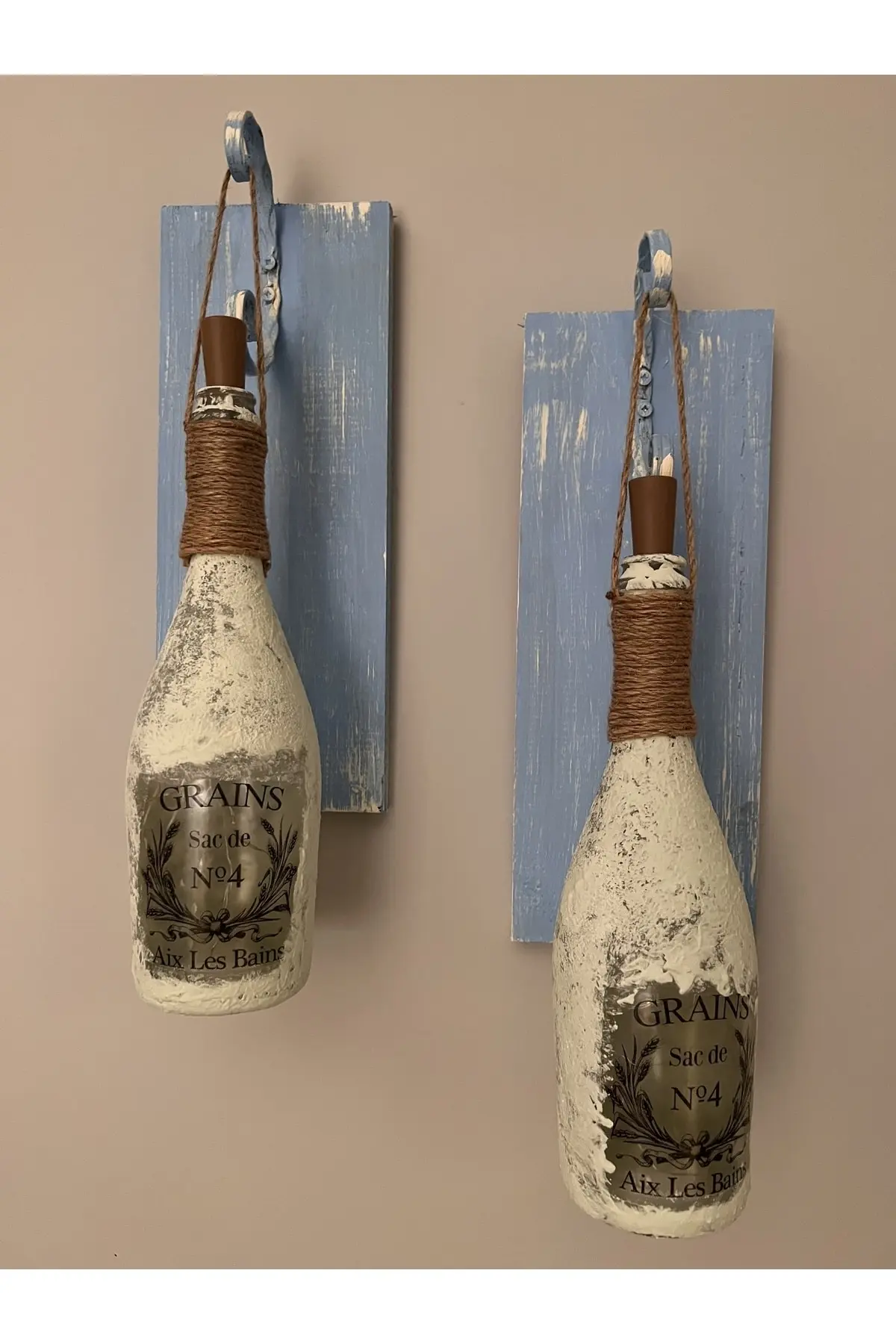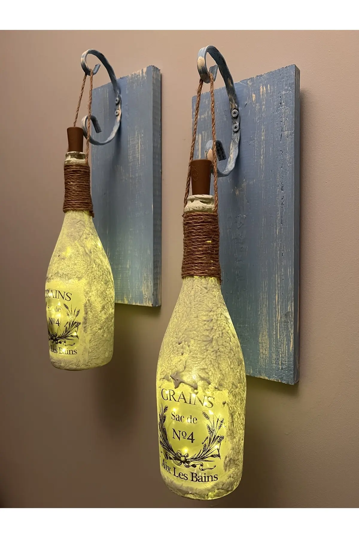 Tıpa Peri Led Işıklı Mavi Eskitme Ahşap Buzlu Cam Şampanya Şişesi Duvar Aplik 2’li Set