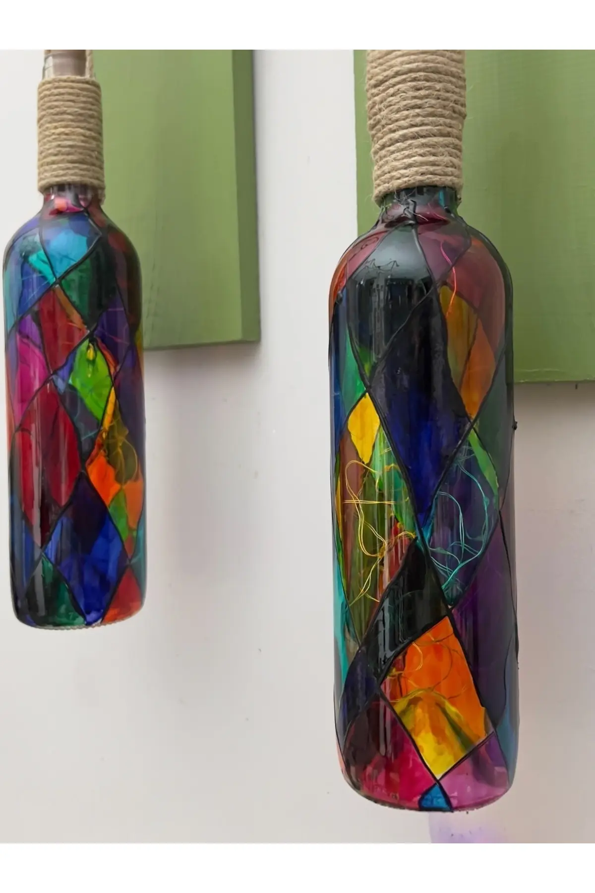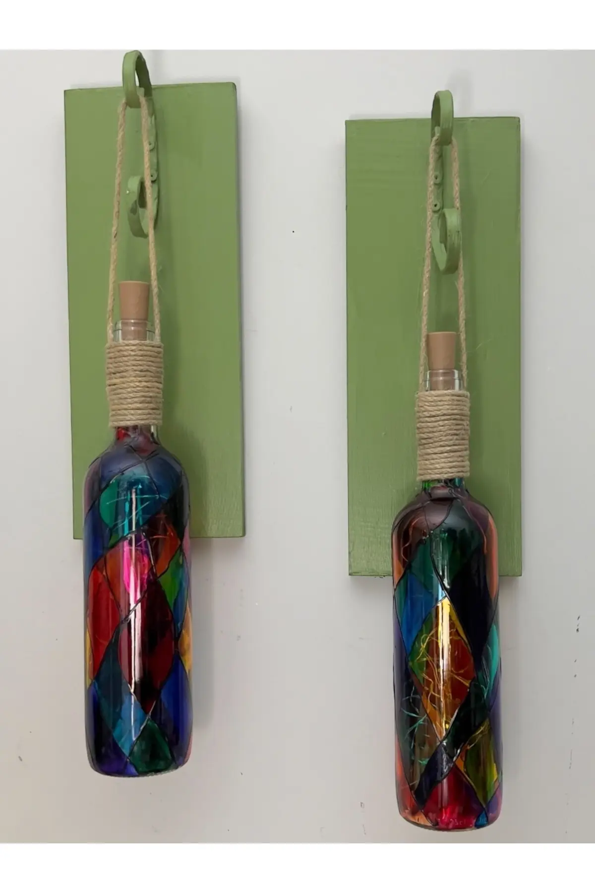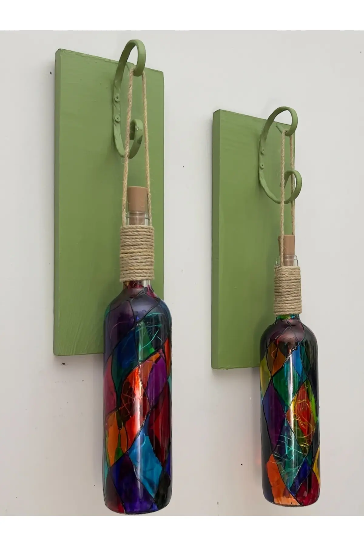 Yeşil Renkli Ahşap Ve Ferforje Dekorlu Peri Led Işıklı Vitray Cam Şarap Şişesi Duvar Aplik 2’li Set